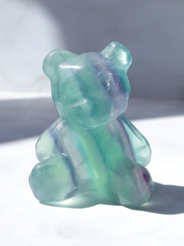 Size : *W37.1㎜ *H48.5㎜ *D30㎜ Weight : 69g 爽やかなブルーグリーンに紫のラインが入った可愛いベアーちゃんをご紹介します✨光にかざすと所々透明度が高く✨パープル以外のラインも見ることが出来ます✨足元には小さな虹も輝いてよりキュートさを醸し出しています♪ フローライトの名前の由来は、ラテン語の「fluere(流れる)」という意味の言葉から来ているそうです✨その名の通り、滞っていた気の流れを整えてくれる、非常に高いバイブレーションを持つ天然石です♡心と体、妄想と行動、他人と自分など、矛盾しがちなエネルギーバランスを調和させることに優れていると云われています✨ なかでもブルーフローライトは 知性・平和・寛大・心の安らぎを象徴す石♡ インスピレーションをもたらし、物事の判断を明確にして、創造的で理路整然とした思考をもたらしてくれます。直感力や集中力を高め、サードアイを開くのに効果的といわれています。 是非♡瞑想のおともにもご活用ください♡ たくさんの人を惹き付けて止まない神秘的なブルーフローライトをお手元でお楽しみください♪ ブルーフローライトは他のカラーのこたちより、重さもあり、希少価値も高いため、お値段も少し高めですが、この美しさは、手にした時に改めて価値がわかって頂けると思います✨✨ 是非お手元でお確かめ頂きたいです♡ ※websiteの方は下に動画もございますのでご参考までにご覧ください✨ アプリをご利用の方は ↓下記URLより動画をご覧いただけます https://youtube.com/shorts/5J7fNGdHTqE?si=oixAv7J9HcFJxMUI *お迎えいただく前のご注意* 天然石の性質上、色味や形の不揃い・内包物・クラックと呼ばれる内傷や石目などが有る場合がございます。天然石特有の魅力でもあるため、その子たちの個性も受け入れた上でお迎えくださると幸いです (〃´ー`人´ー`〃) *撮影について* 太陽光の下で撮影しており、加工もしておりませんが暗いところでお手にとって頂くとまた違ったお色味になるかと思います。 太陽にかざしたり、ライトにかざしたり、色んな方法をお試し頂き お楽しみください(* ´ ▽ ` *)