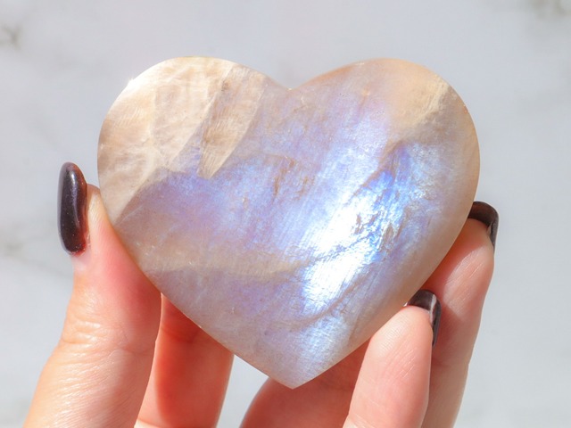 Size : *W53.6㎜ *H46.1㎜*D16.3㎜ Weight : 55g ムーンストーンは、表面に「シラー」と呼ばれる不思議な光が浮かび上がり、まさに月そのものといっても過言ではない美しさを誇ります☆ このこは濃いブルーと薄いブルーがまだら模様に混在したシラーを持つ珍しいこです♡たくさんムーンストーンを見てきましたが、初めて見ました♡あなたの貴重なコレクションになること間違いなしです(,,> <,,)♡ 月の光のような神秘的な輝きは、紀元前1世紀頃から知られており、かつてはギリシャ語で「月」を意味する「セレネー」と呼ばれていました。日本では、パール(真珠)と並んで6月の誕生石に指定されています✨ ムーンストーンの石言葉は諸説ありますが、例としては「健康」「幸運」「恋の予感」などが挙げられます。月を連想させる優しい光は、持つ人の体の調子を整えたり、幸運と出会うきっかけをもたらしてくれます。 月のエネルギーを受容するムーンストーンは、思考を柔軟にし、感受性や直感力などの感性を高める効果があるとされています。同時に「聞く」能力を高め、不要な衝突も防いでくれます。 また、第六感を刺激し感性を高める力もあるとされ、自分の中にまだ眠っている可能性を引き出してくれます♡月は女性のシンボルでもあるため、女性性(にょしょうせい)をサポートする石としても知られています✨✨ 是非♡お手元で、つるっとしたハートの表面を走る神秘的なブルーシラー&虹シラーをご堪能ください♡♡♡ ※websiteの方は下に動画もございますのでご参考までにご覧ください✨ アプリをご利用の方は ↓下記URLより動画をご覧いただけます https://youtube.com/shorts/iZ798DZRv_8?si=qTiFAu2LX5FsttZE *お迎えいただく前のご注意* 天然石の性質上、色味や形の不揃い・内包物・クラックと呼ばれる内傷や石目などが有る場合がございます。天然石特有の魅力でもあるため、その子たちの個性も受け入れた上でお迎えくださると幸いです (〃´ー`人´ー`〃) *撮影について* 太陽光の下で撮影しており、加工もしておりませんが暗いところでお手にとって頂くとまた違ったお色味になるかと思います。 太陽にかざしたり、ライトにかざしたり、色んな方法をお試し頂きお楽しみください(* ´ ▽ ` *)