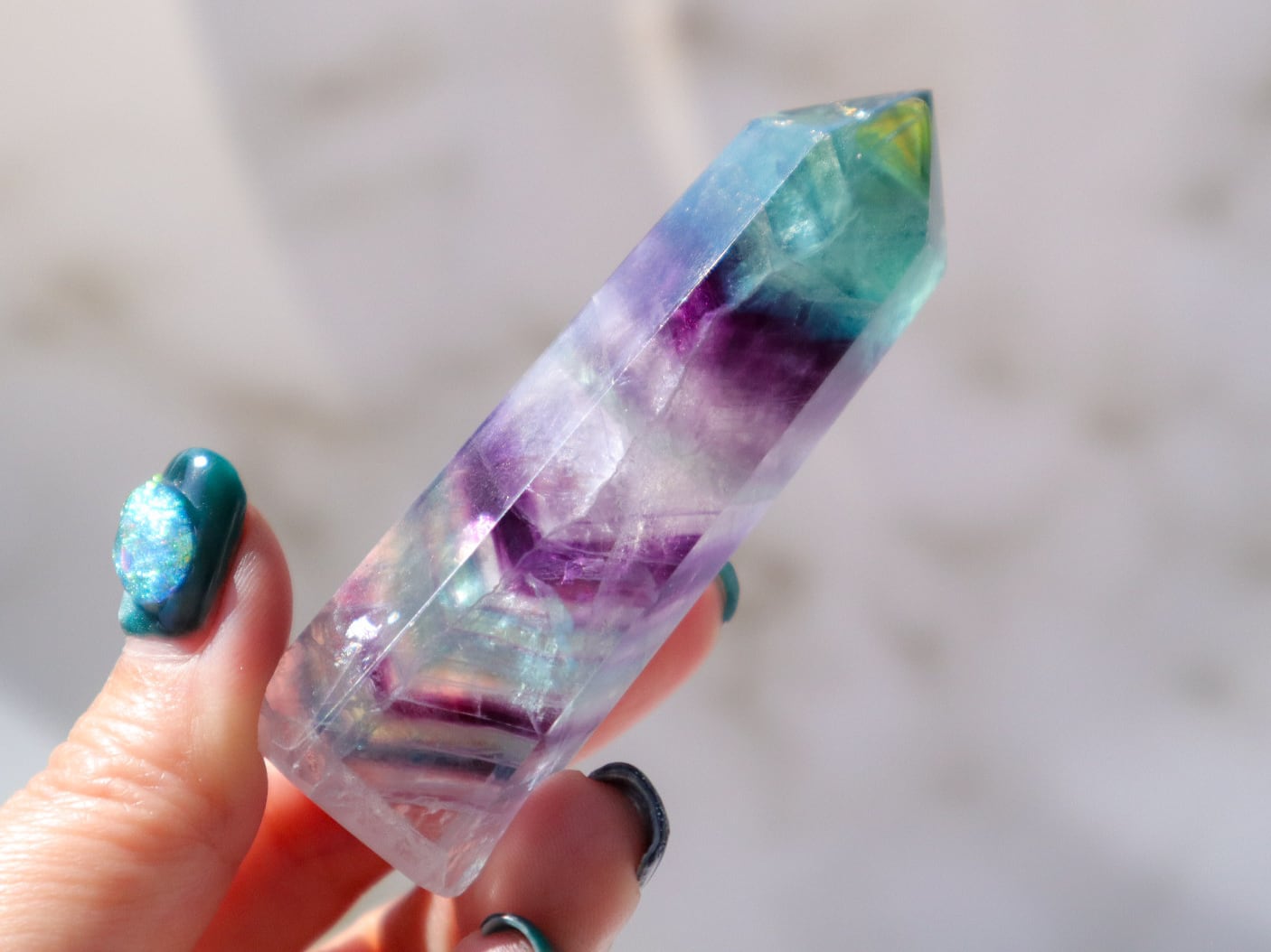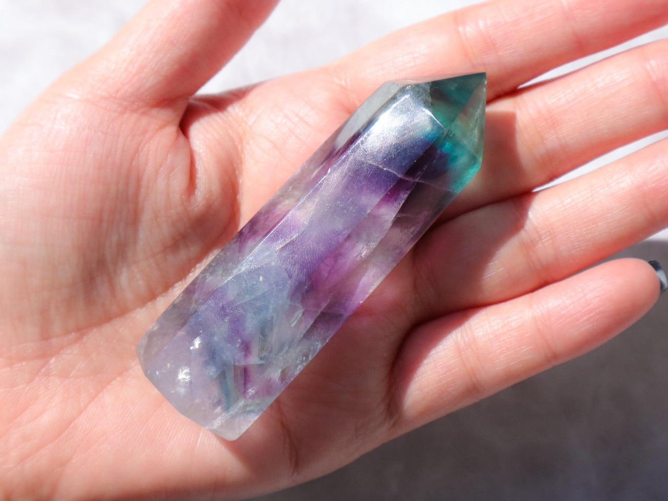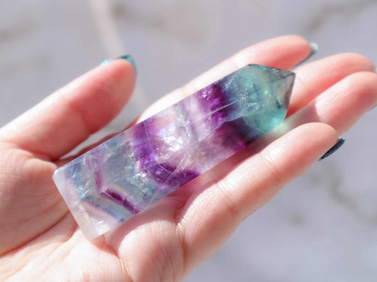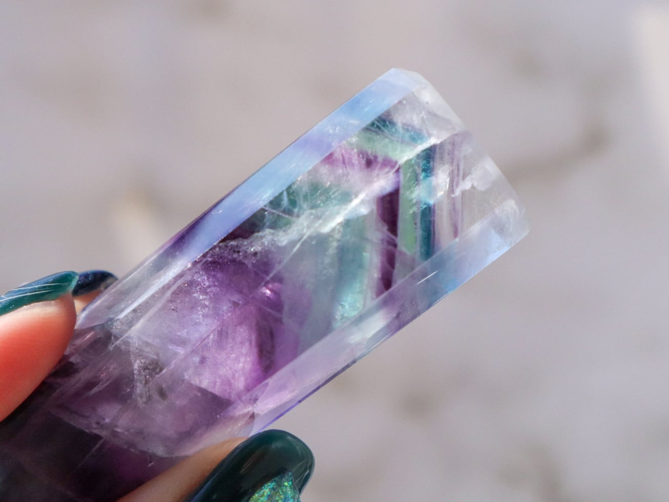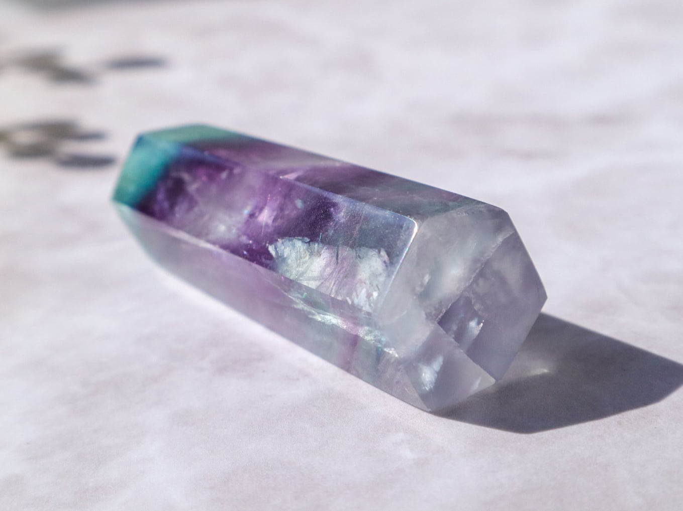 透明度の高いブルーグリーンの箇所ほか、たくさんの色が楽しめる魅力的なフローライトの中の世界を、是非お手元でご堪能ください♡