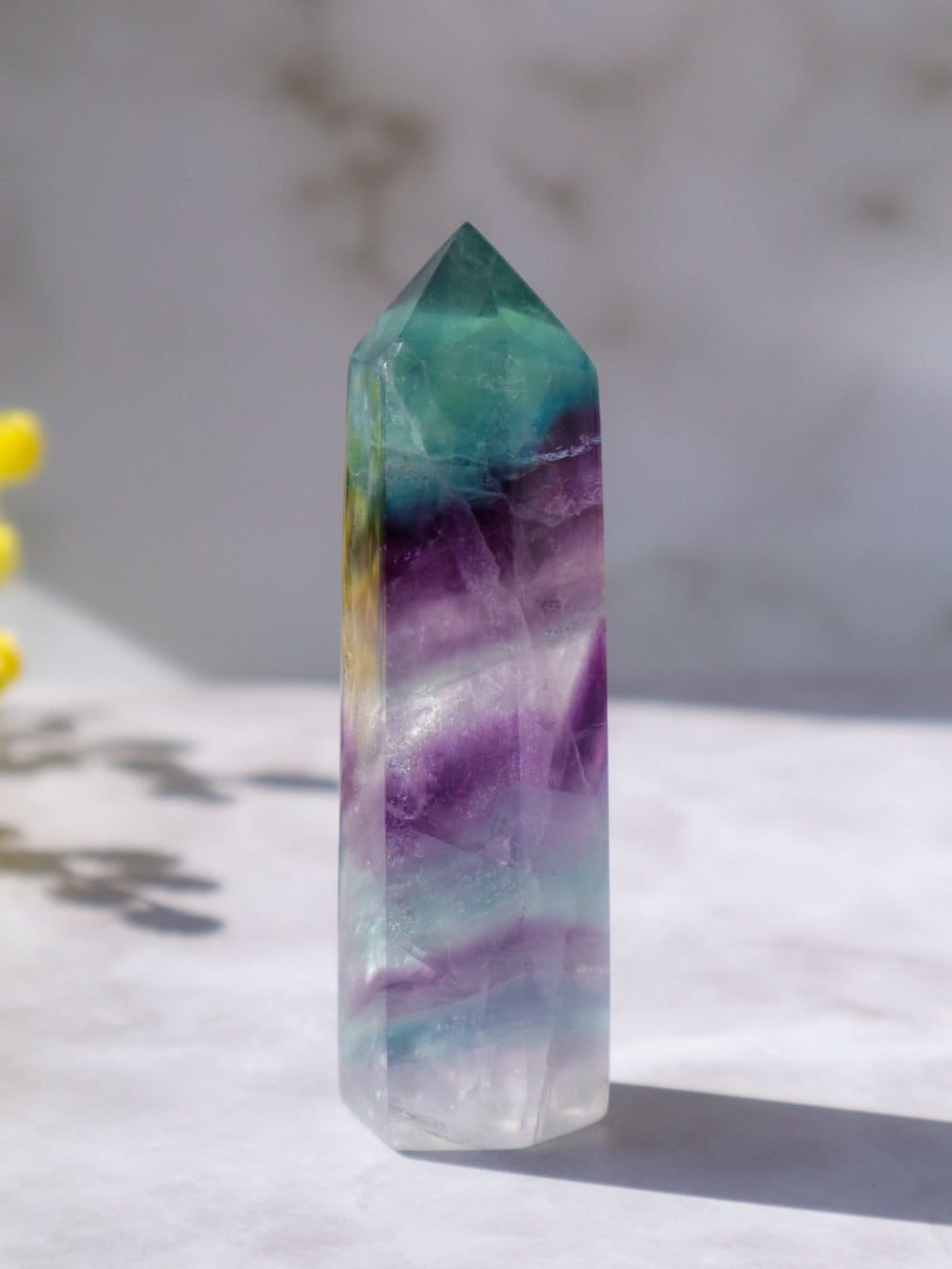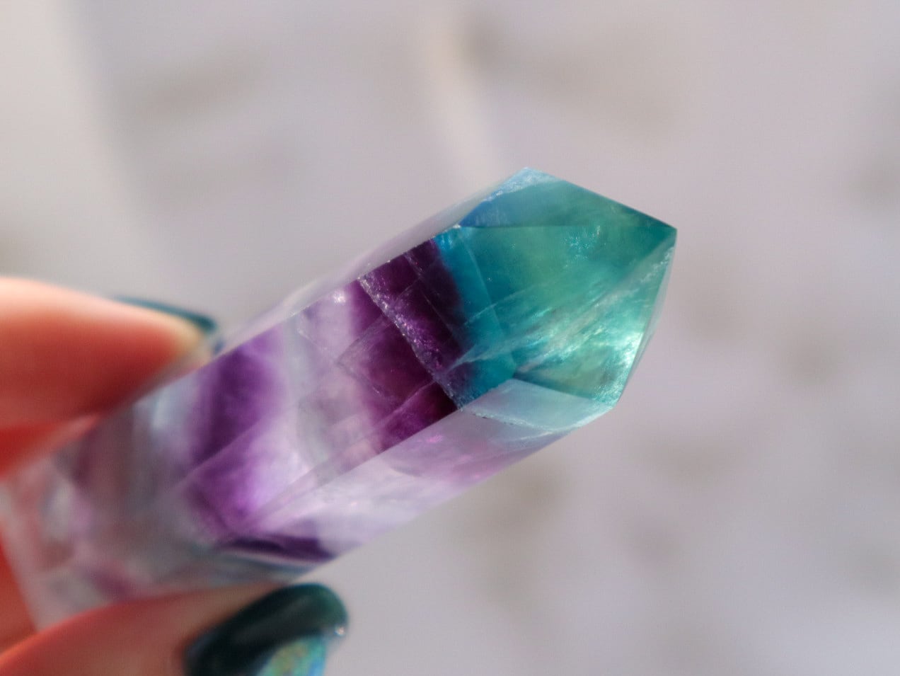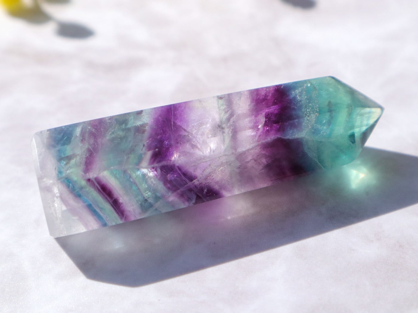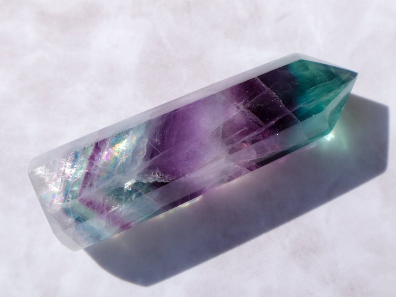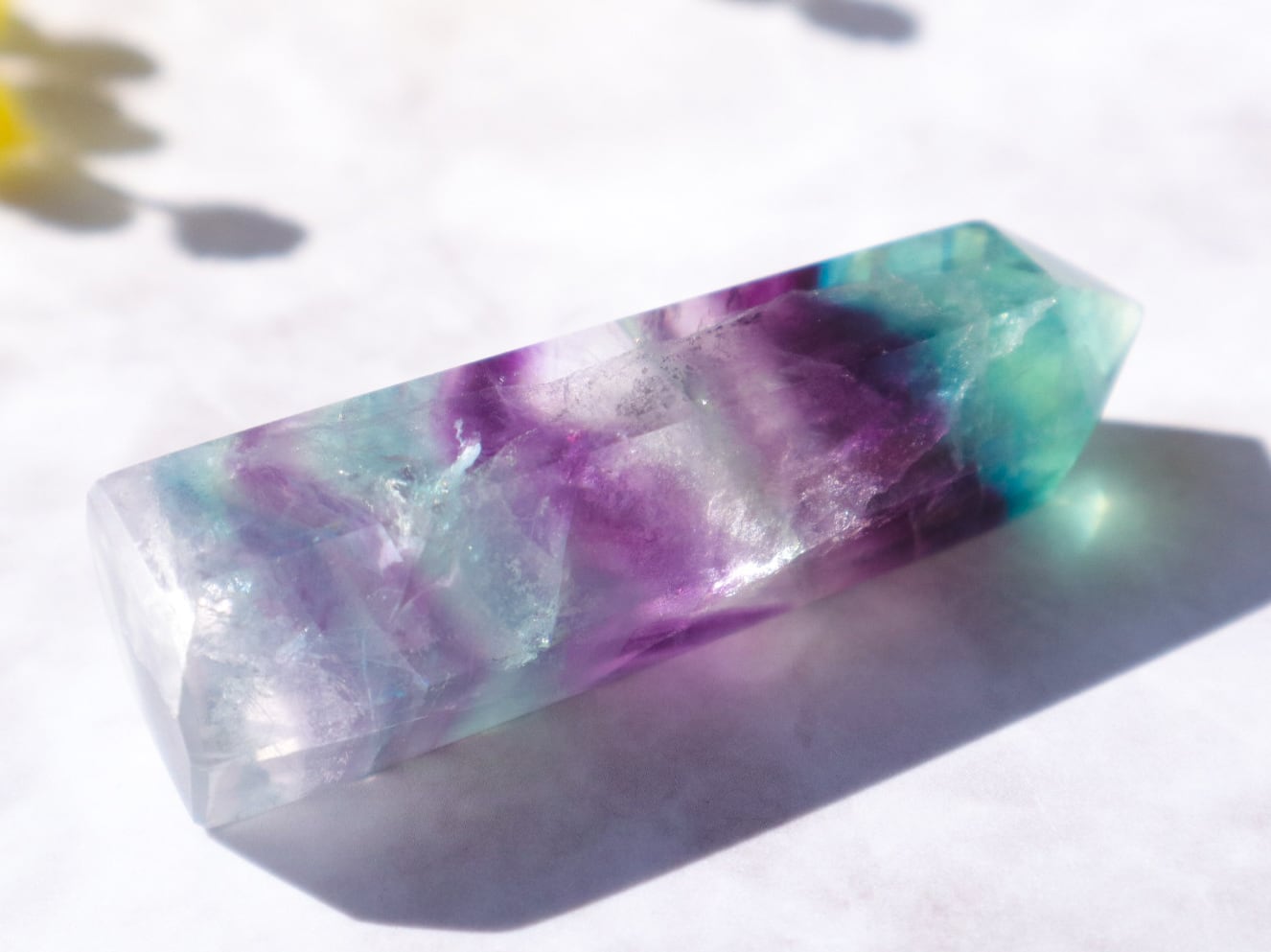 透明度の高いブルーグリーンの箇所ほか、たくさんの色が楽しめる魅力的なフローライトの中の世界を、是非お手元でご堪能ください♡