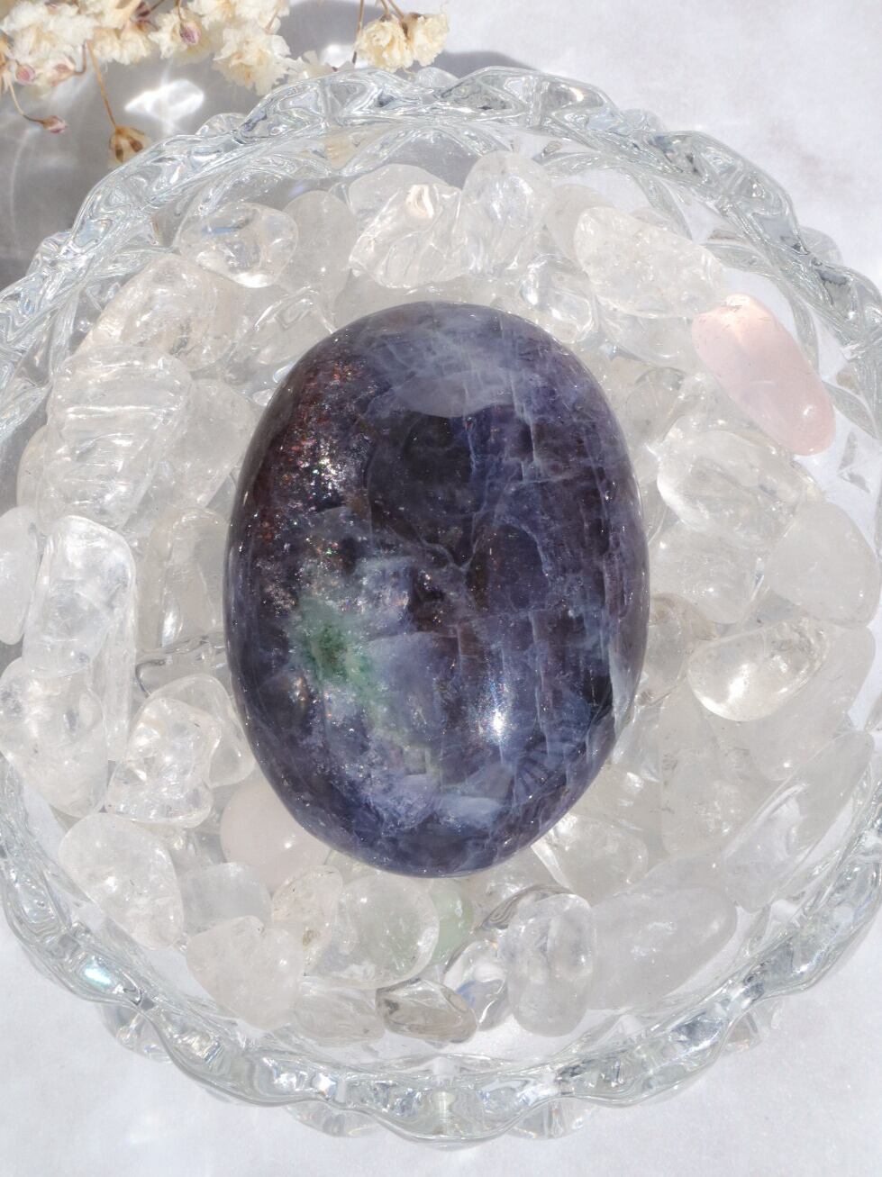 美しいインディゴブルーに虹色のラメのように輝くアベンチュレッセンスが、神秘的なブラッドショットアイオライト✨手のひらサイズでポケット石にも最適♪希少石なので、お値段はしますが、この神秘的な輝きをお供させてください♡写真にもありますが側面に少し石目の凹みがありますので、通常よりお得になっておりますので、是非この機会にお手元へ♡