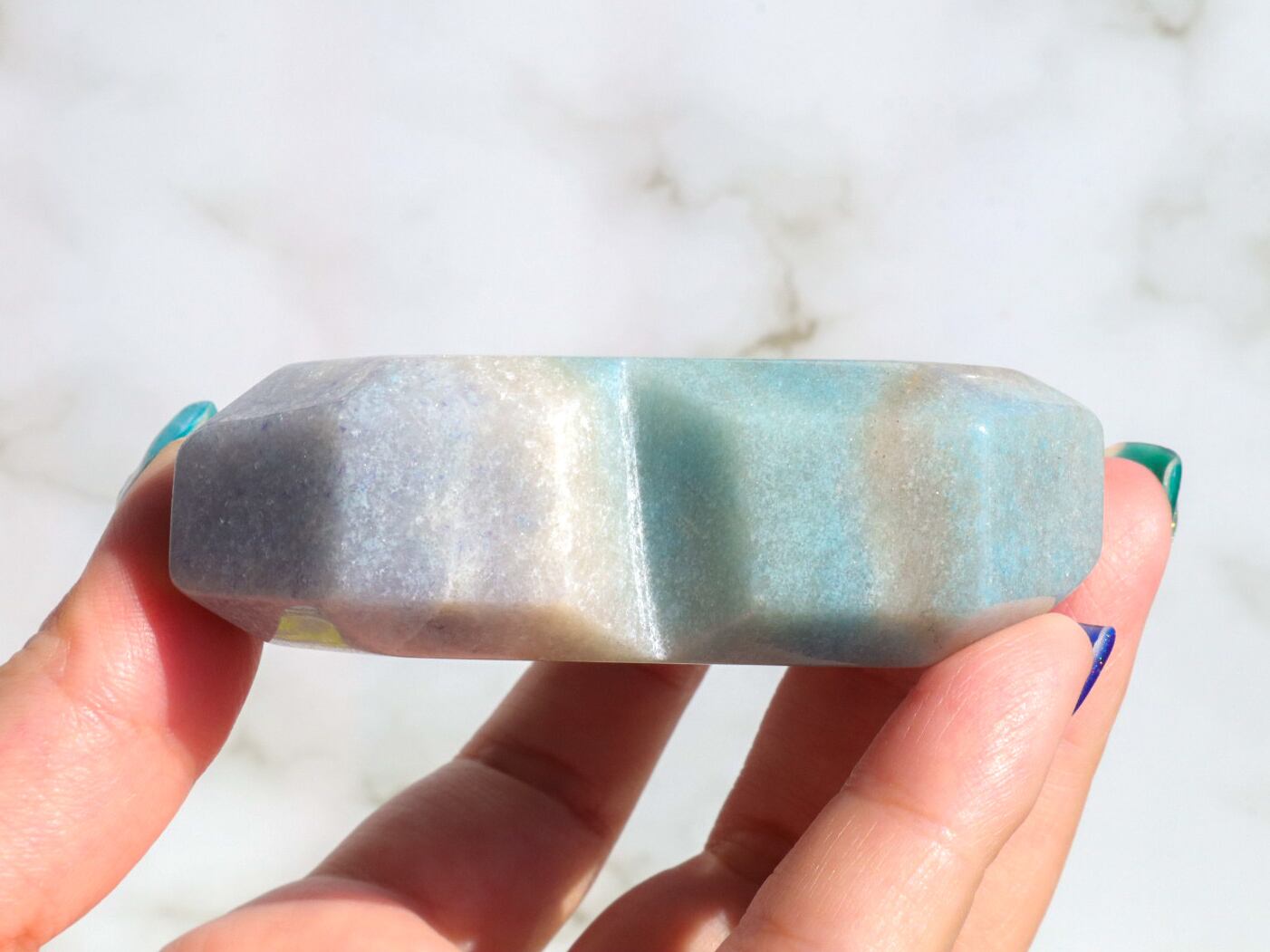 淡いブルーであっても、どことなくくすみを感じる優しい色合いで、なんとも不思議な神秘的な魅力があり、癒しを感じる人も多く、近年とても人気が出てきた石です♡