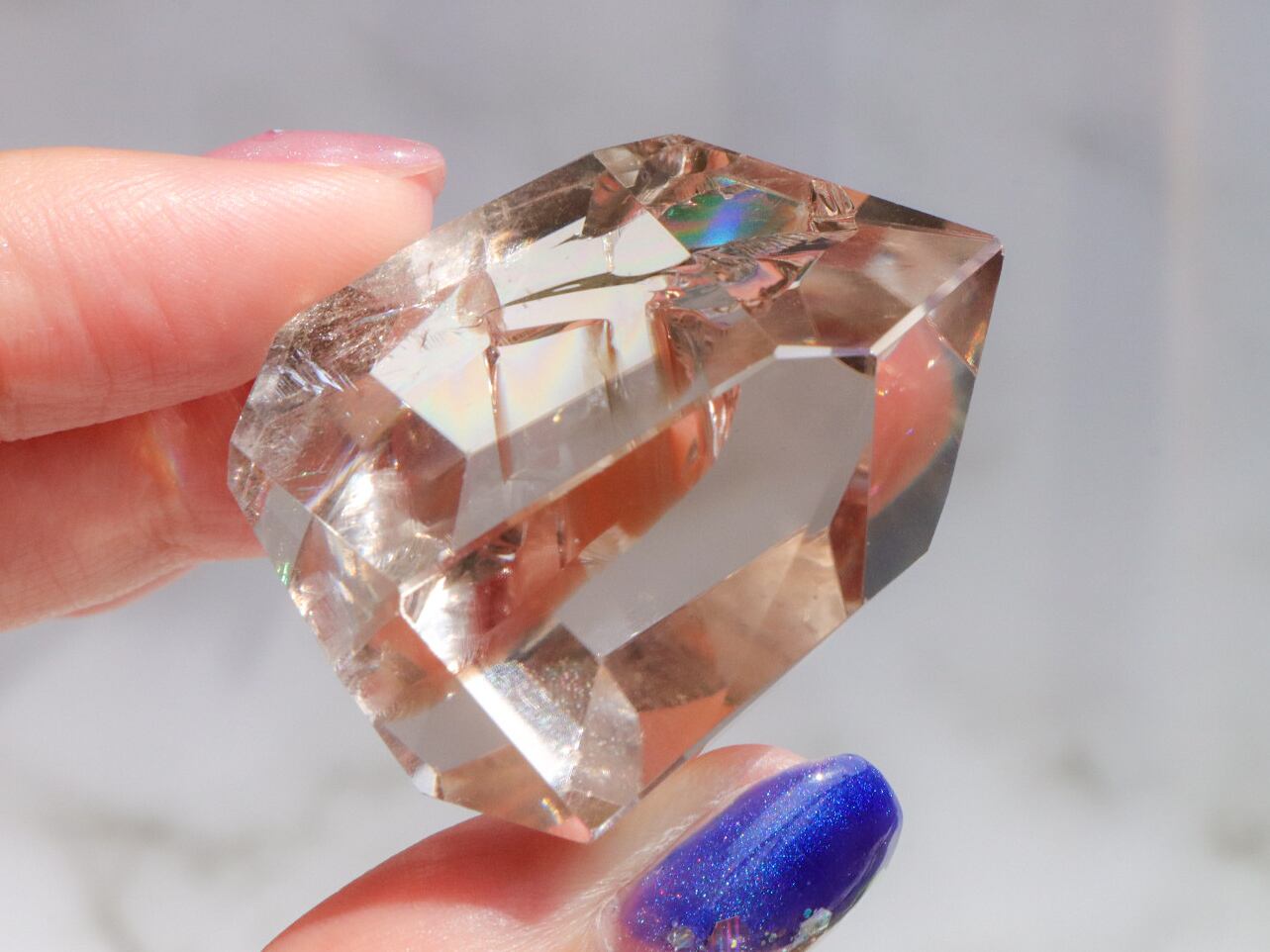 透明度抜群で、中には凄まじい輝きの虹が鎮座しています✨✨フリーフォームなので、たくさんのカットが入っているので、光と虹が反射し、どの角度からも素晴らしい輝きを見せてくれます✨ポイントのように立てて置くのもオススメ✨