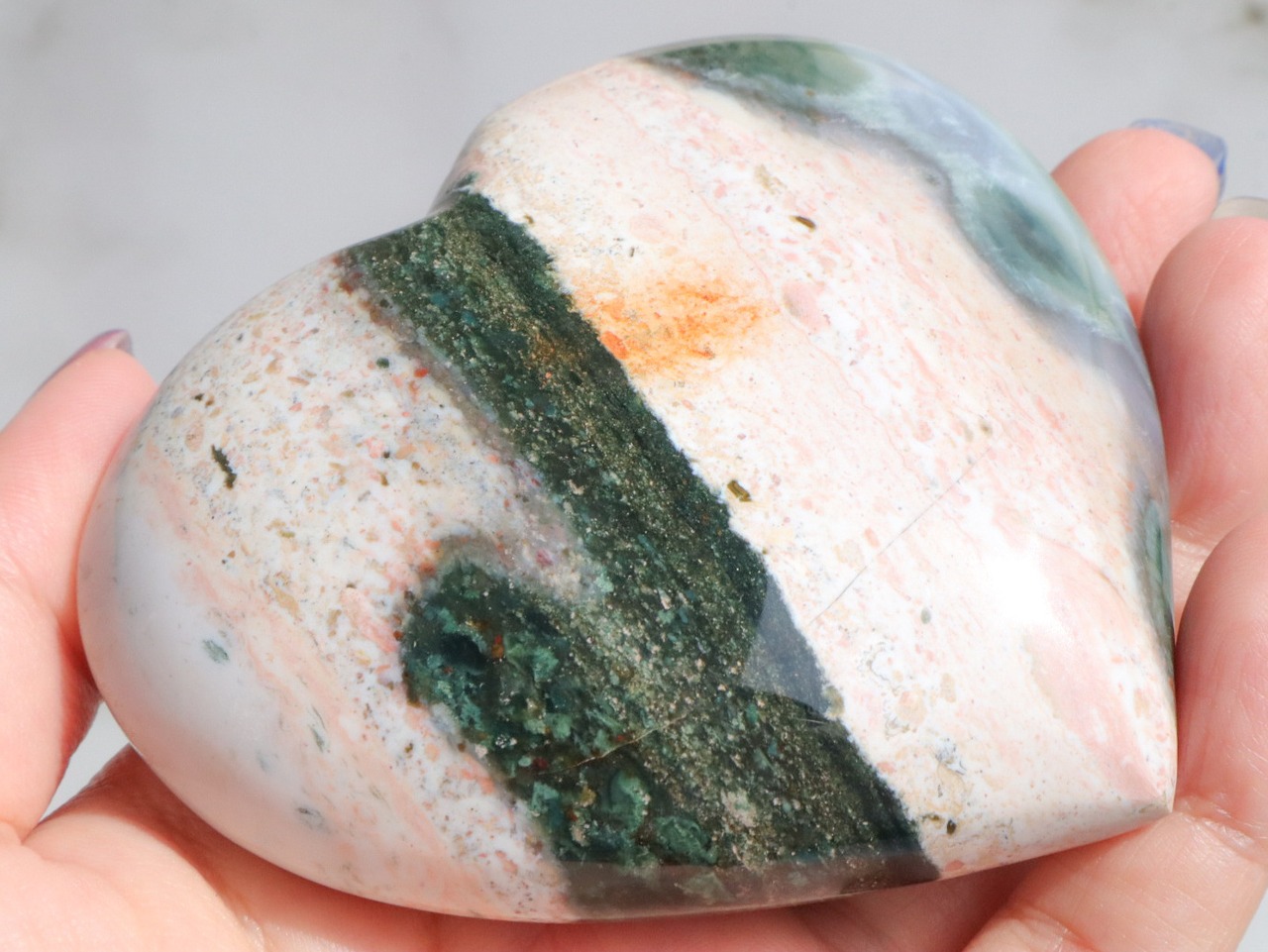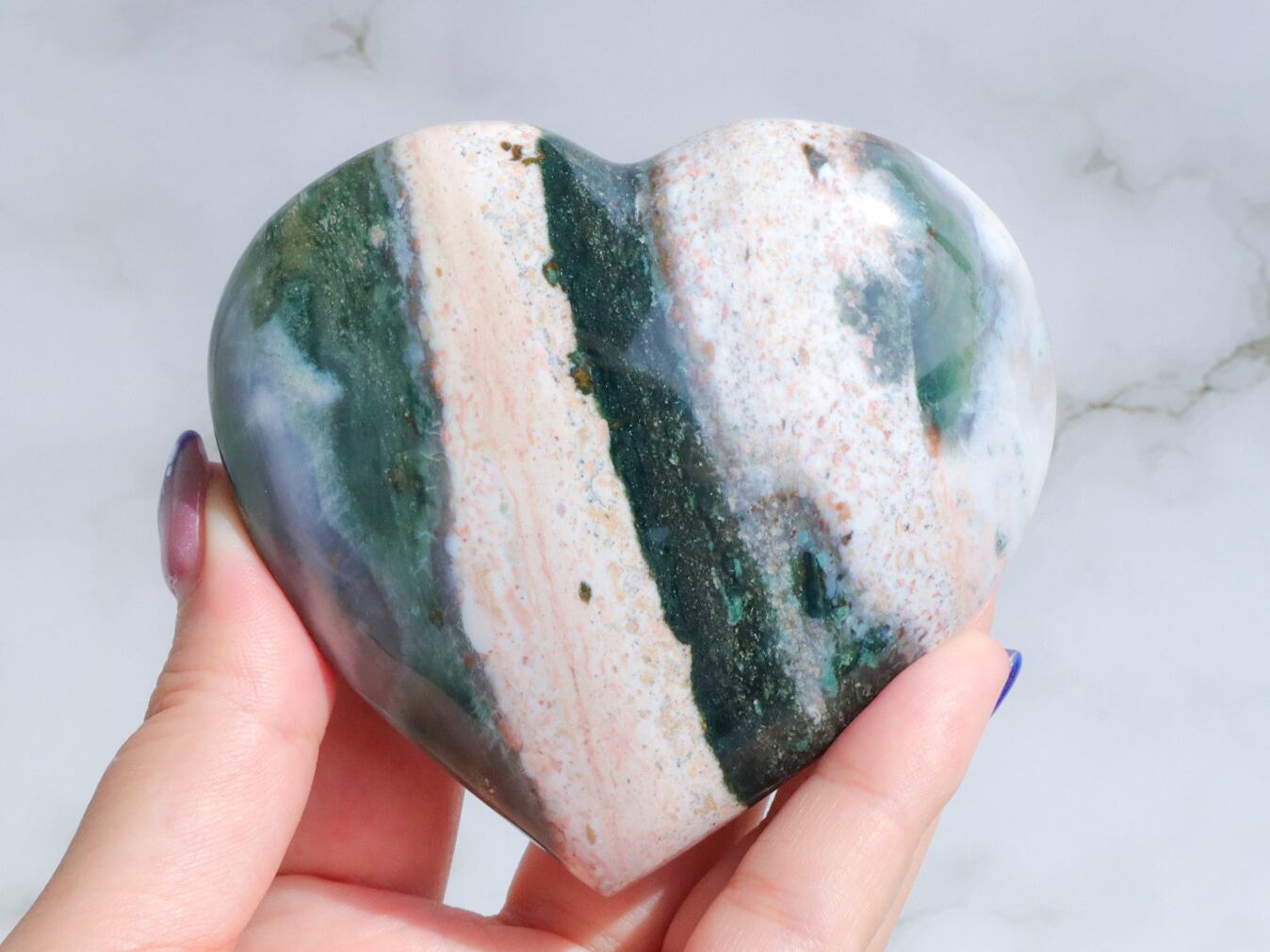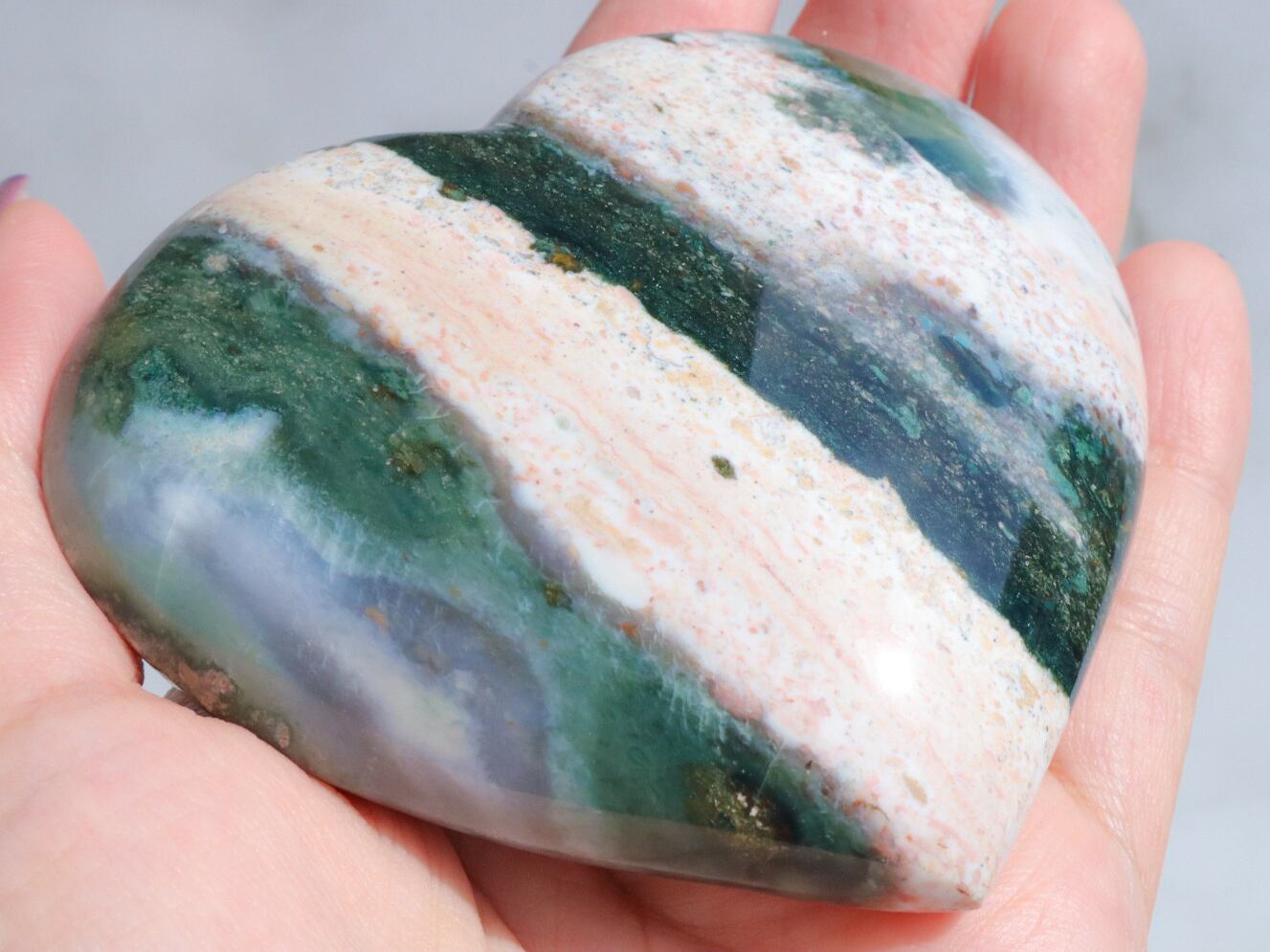 このこは深いグリーンと、柔らかい白とピンクの模様がストライプ状に入った珍しい模様のハートさんです♡重みや厚みもあってどっしりとしたこです♡陰陽を表すような色のテイストの違う、神秘的な自然のストライプ模様をご堪能ください♡♡♡
