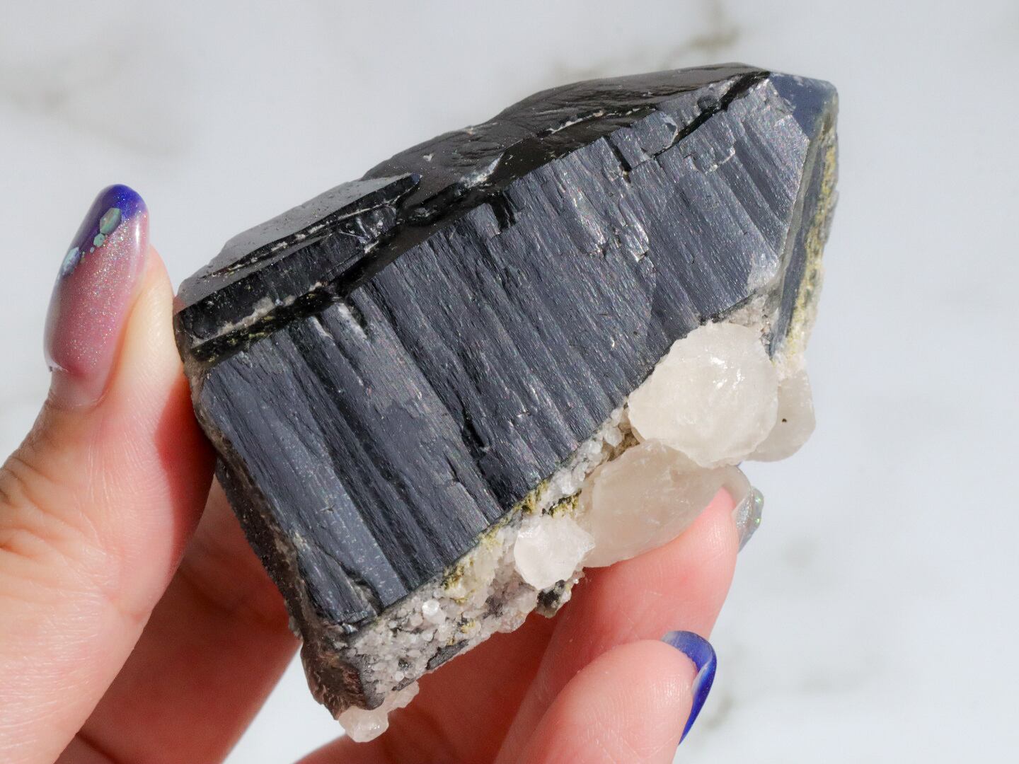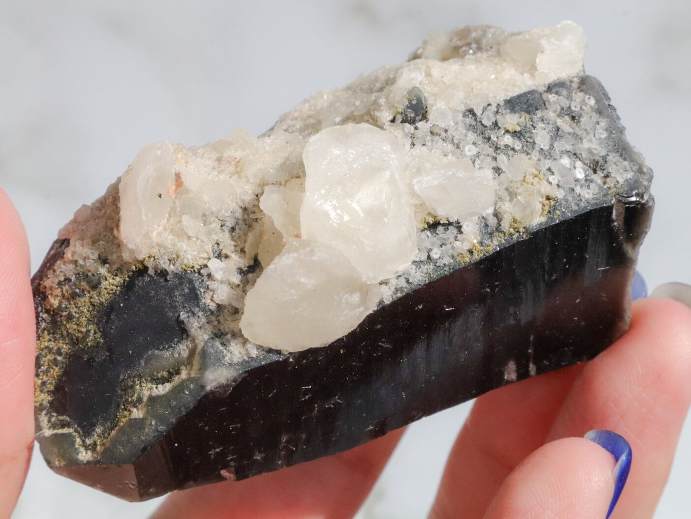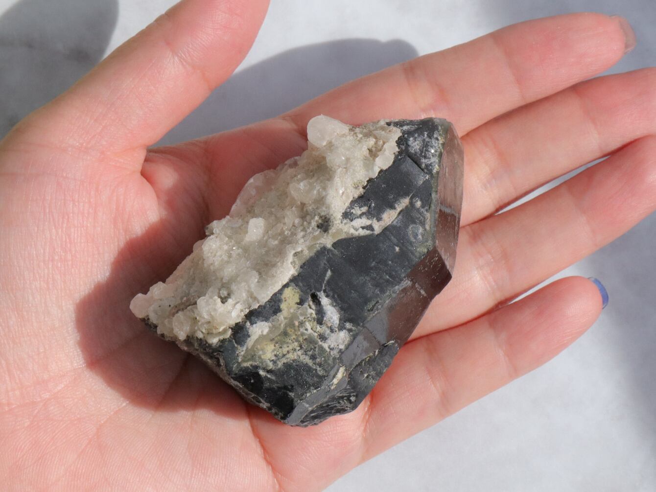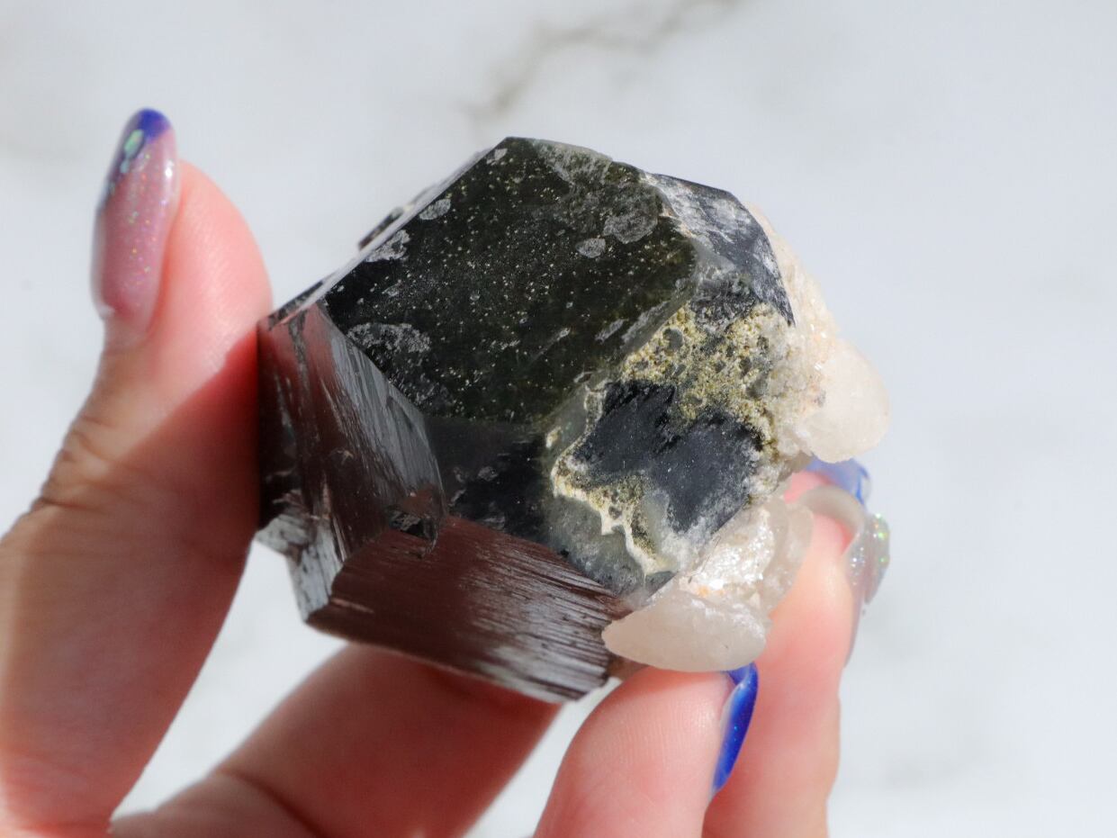 モリオンは和名を黒水晶と言い、文字通り光を通さないほど真っ黒な水晶です✨このこは、黒水晶に細かい結晶になって水晶が共生している原石です✨✨