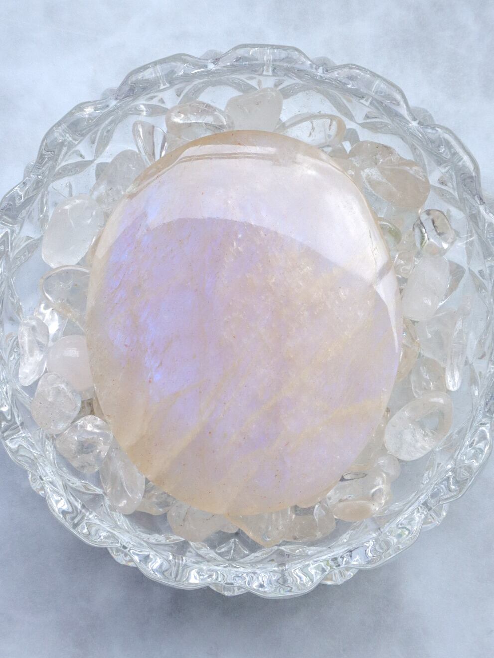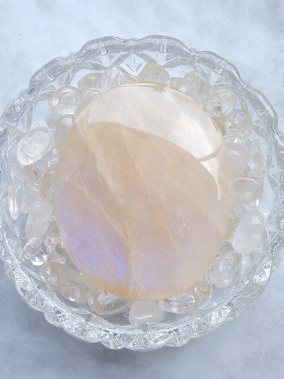 月のエネルギーを受容するムーンストーンは、思考を柔軟にし、感受性や直感力などの感性を高める効果があるとされています。同時に「聞く」能力を高め、不要な衝突も防いでくれます。