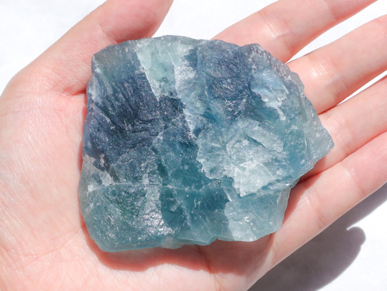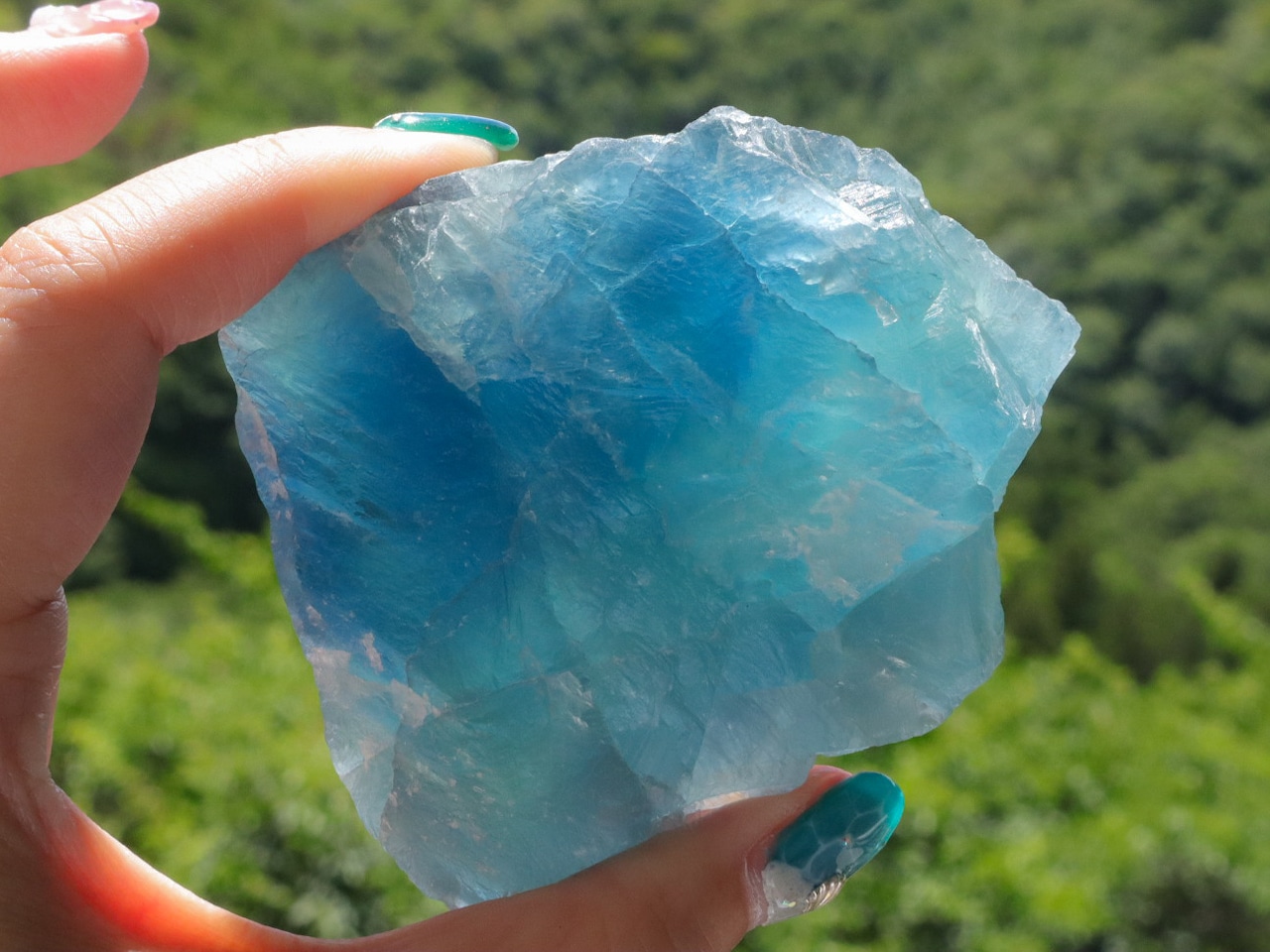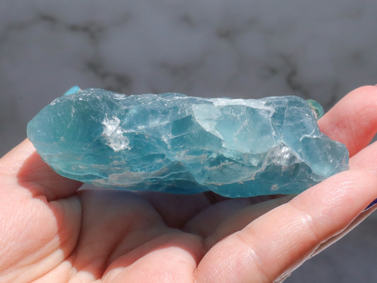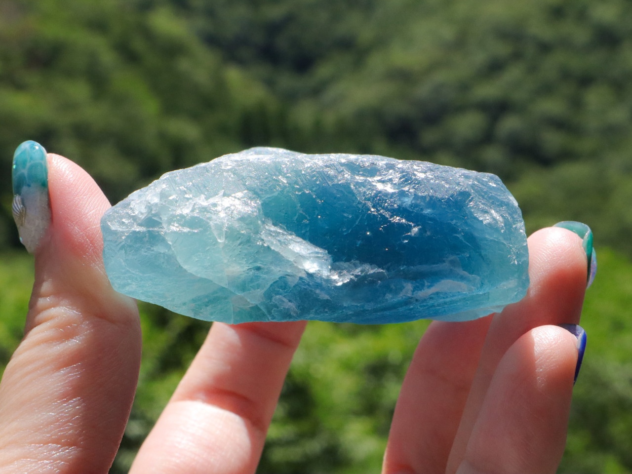 まるで南国の美しいブルーグリーンの海を覗き込んだような気持ちになる、ブルーフローライトの原石♡これは日光に当てた時の写真ですので、室内や暗い所では、薄いグリーンにも見えたりしますが、このこはブルーフローライトです✨是非晴れた日に外で太陽に透かして見てやってください♡(๑´>᎑<)~♡