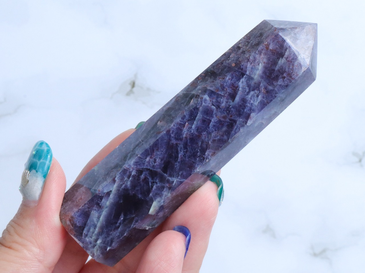 美しいインディゴブルーに虹色のラメのように輝くアベンチュレッセンスが、神秘的なブラッドショットアイオライトのポイントをご紹介します✨