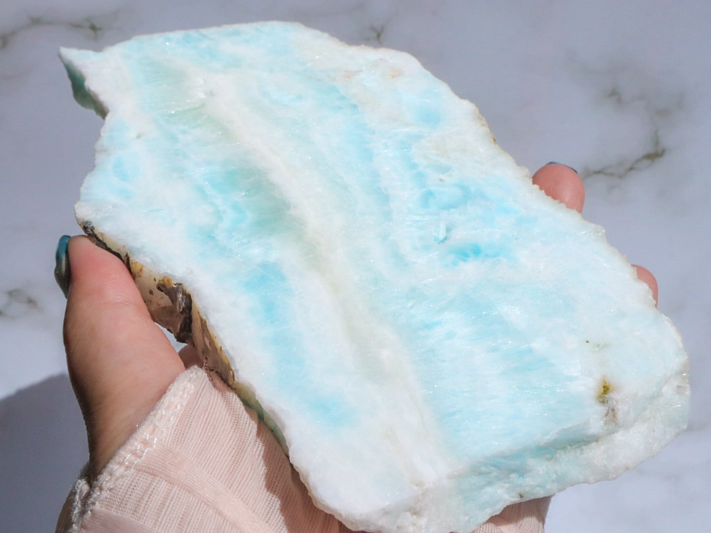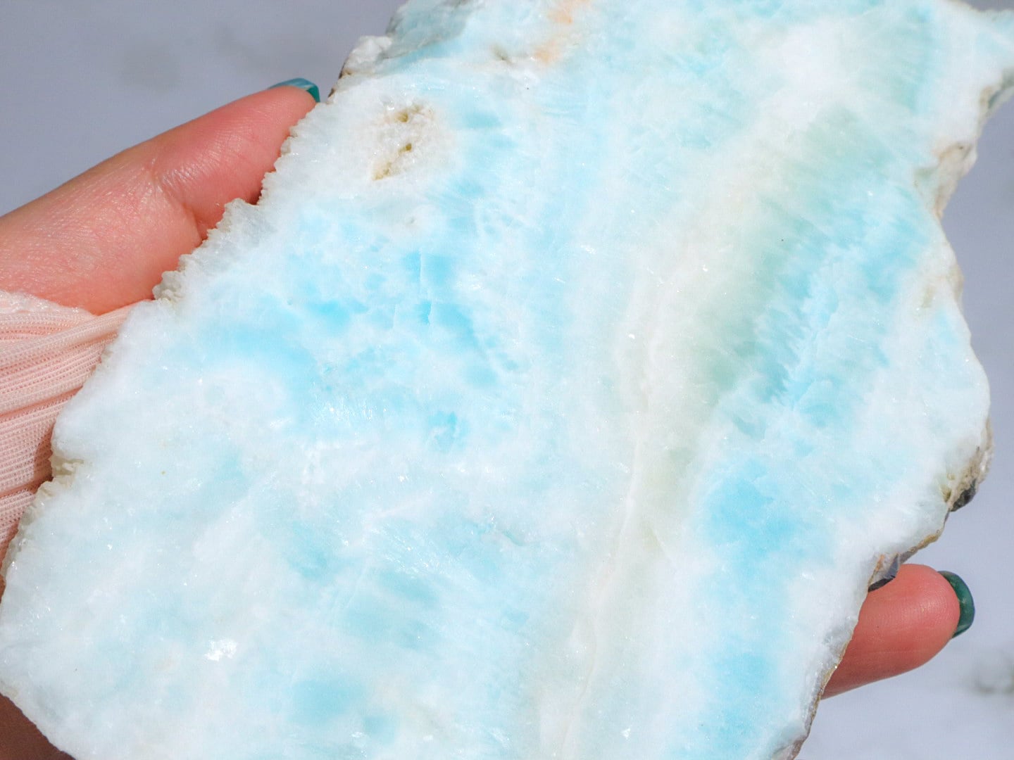 ブルーアラゴナイトは水色の層が幾重にも重なったような美しい天然石で、「エネルギーの浄化をおこなう」という石言葉を持っています✨