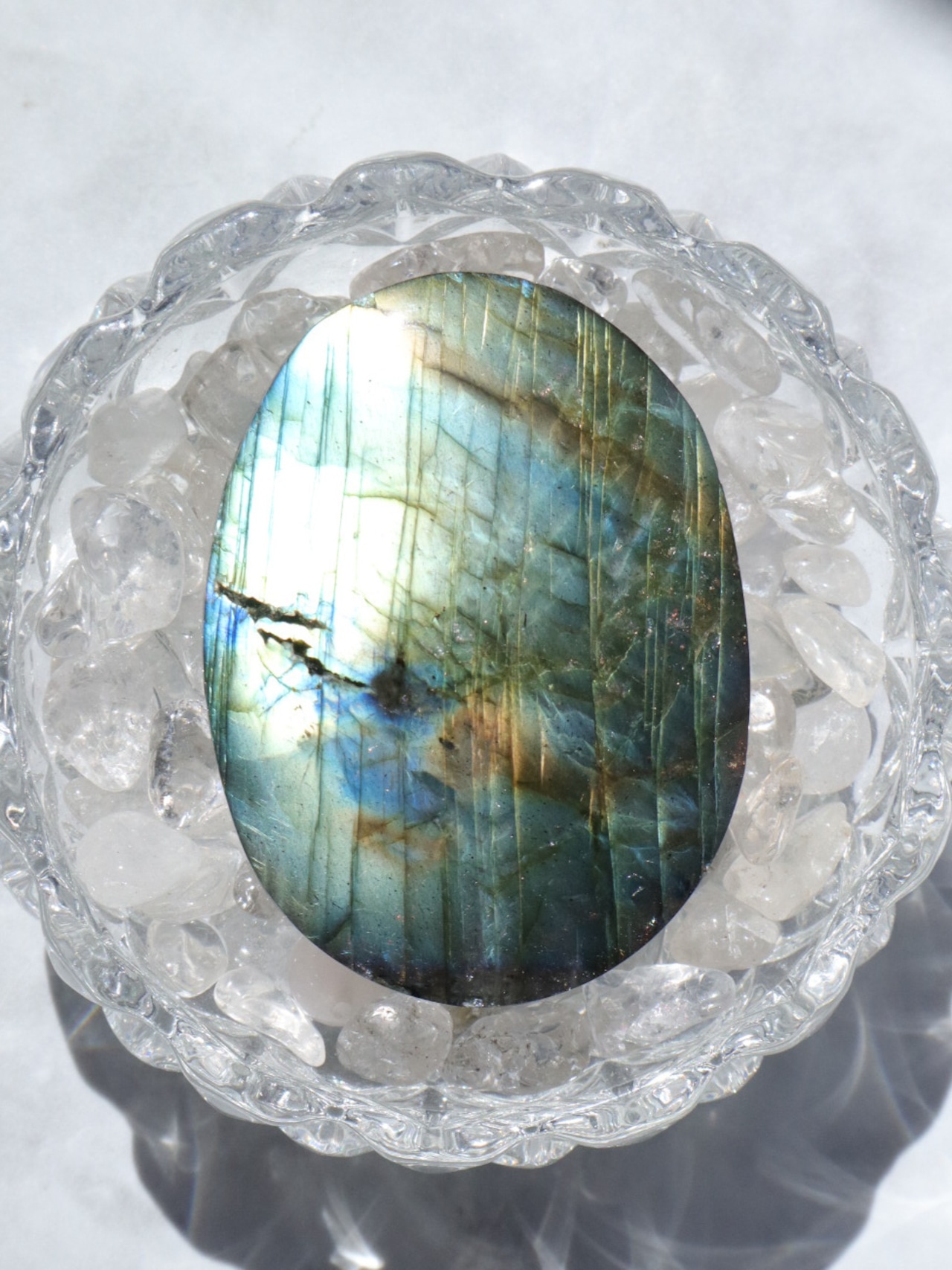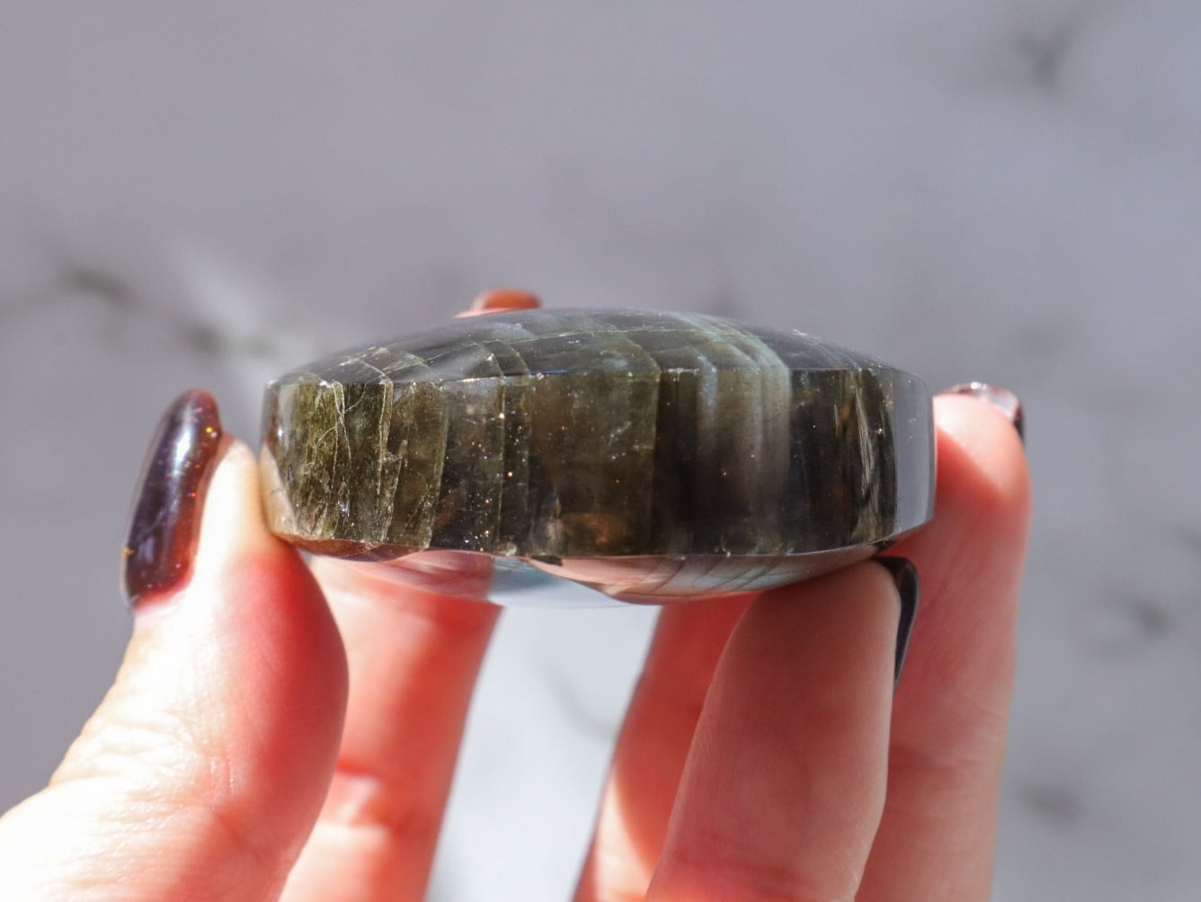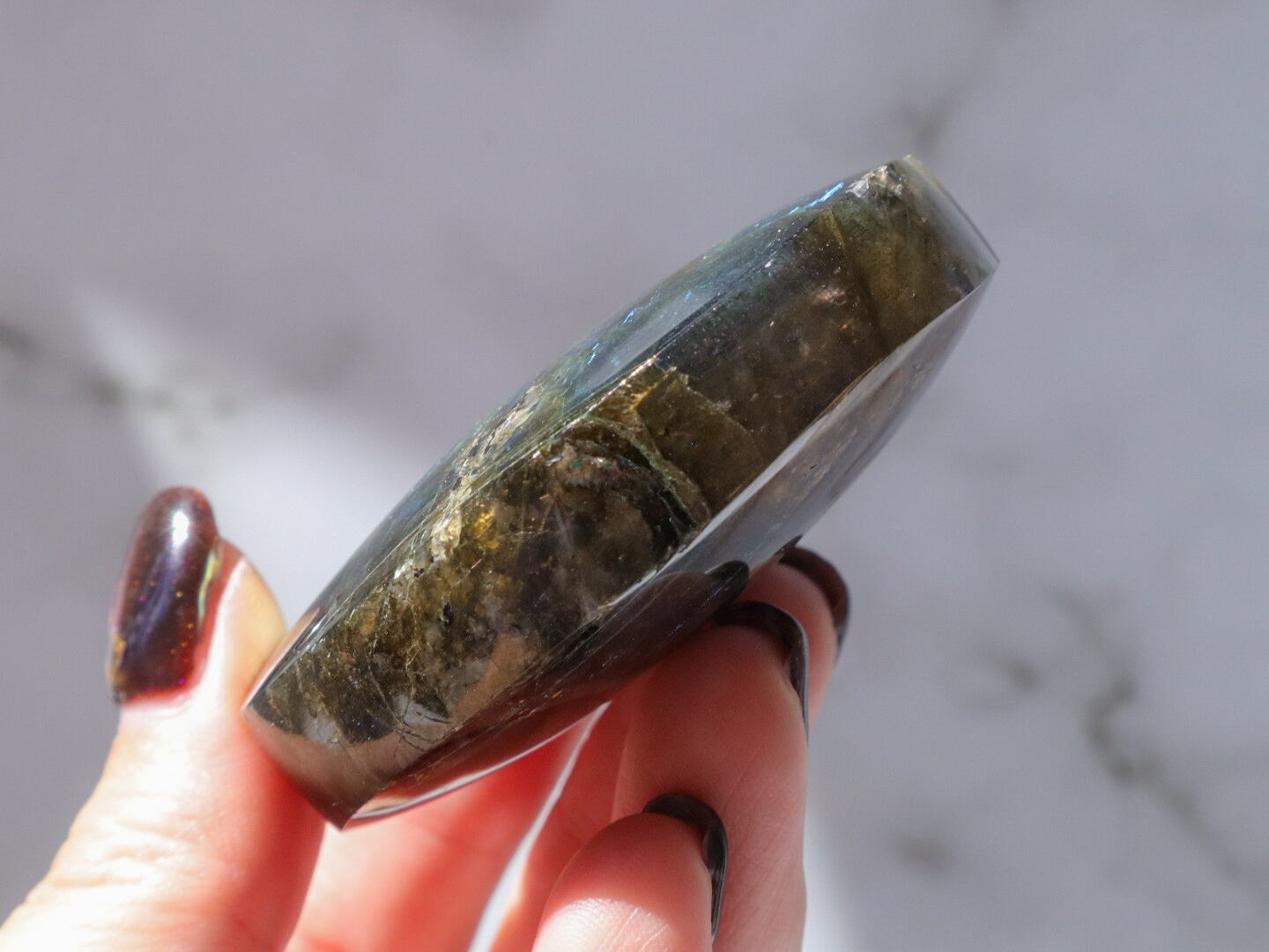 このこは、両面ブルー系ではありますが、他の色もちらほら見え、シラーはバッキバキで、かなりパワフルな光を放つラブラドライトさんです♡
