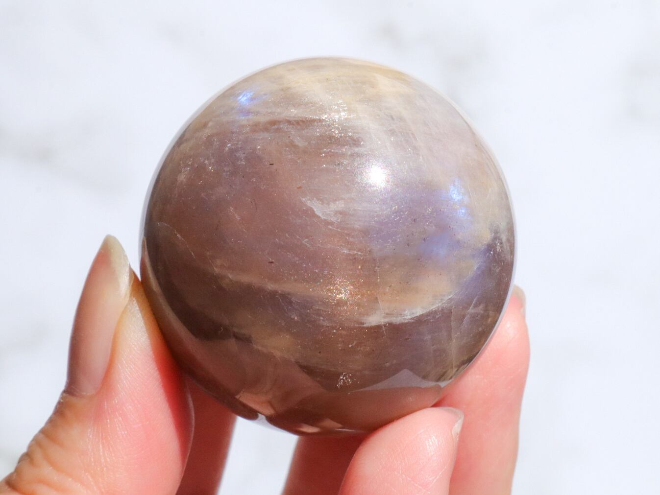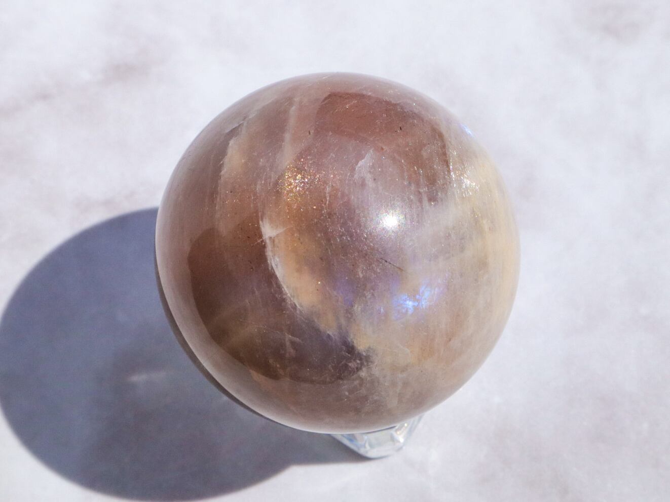 くるくるすると、ブルーの小さな丸いシラーが追いかけてきます✨また、サンストーンが共生しており、虹色の粒が集まったアベンチュレッセンスがグレームーンストーンのシラーと共に光輝き、キャッツアイのようなシラーが出たり、見所満載のこです✨