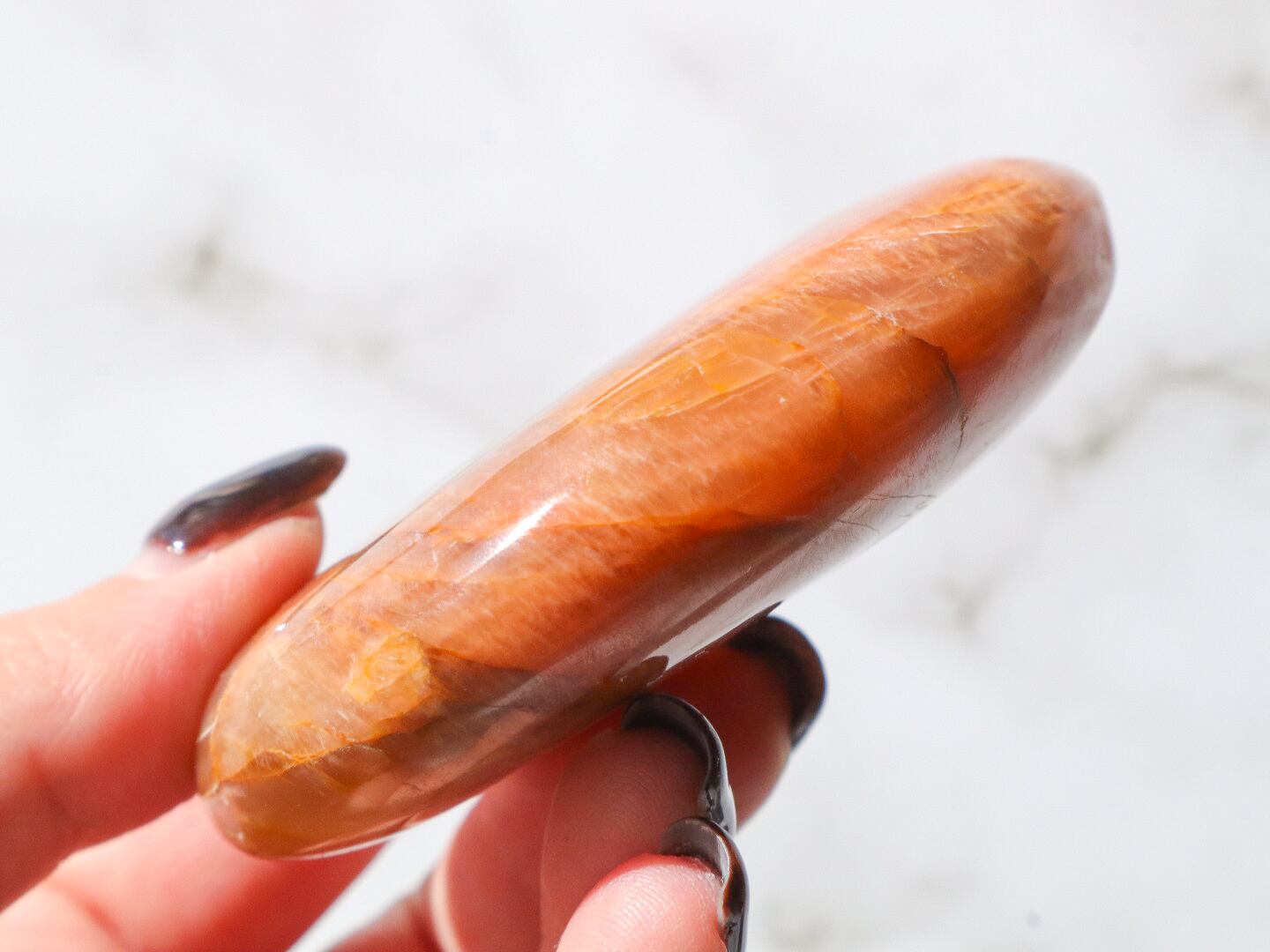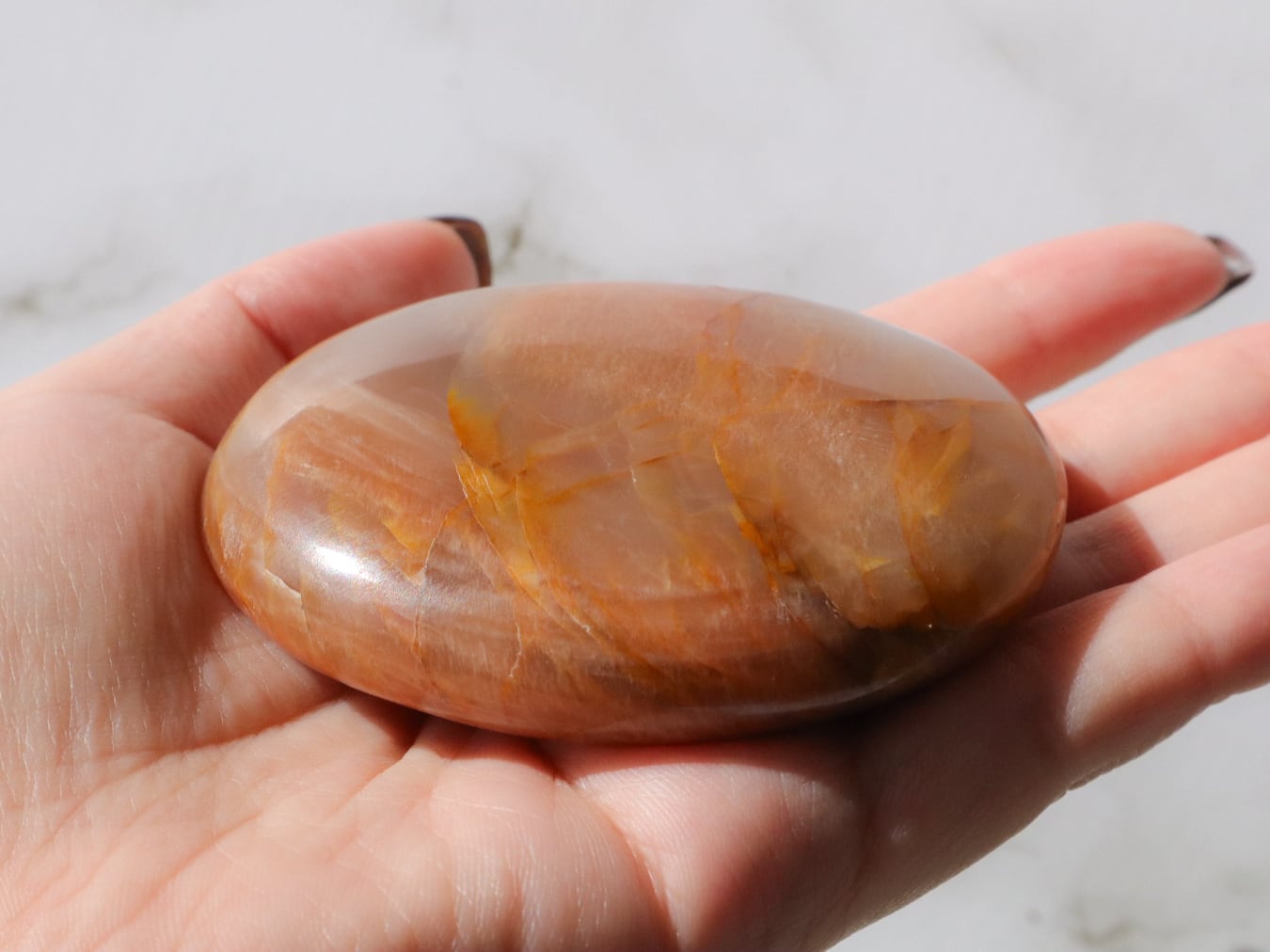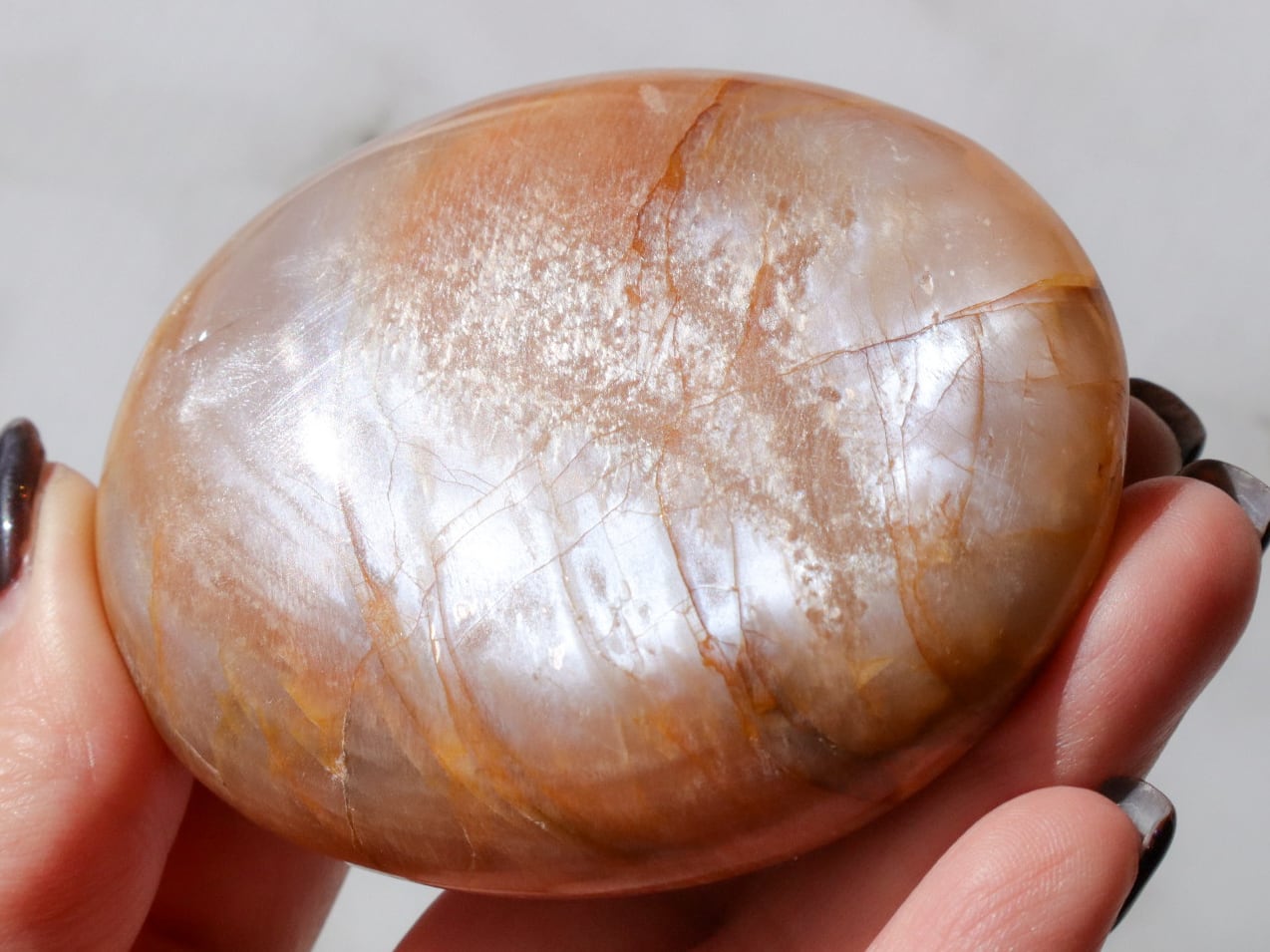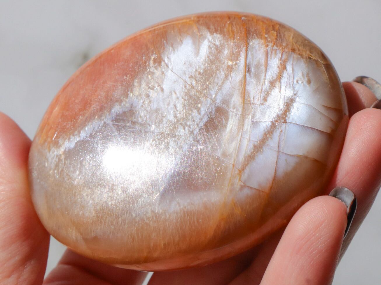 ピーチムーンストーンはオレンジムーンストーンとも呼ばれ、色味は個体により若干異なりますが、このこはヌーディーで上品なピーチカラーのもので、女性らしさ溢れる素敵な色味です♡♡♡また、シラーもビカビカです✨角度や明かりによってはブルーシラーに見えたり♡楽しめます✨サイズは大きめですが、厚みは薄めなので手のひらにしっくり馴染んで暖かみすら感じます♡