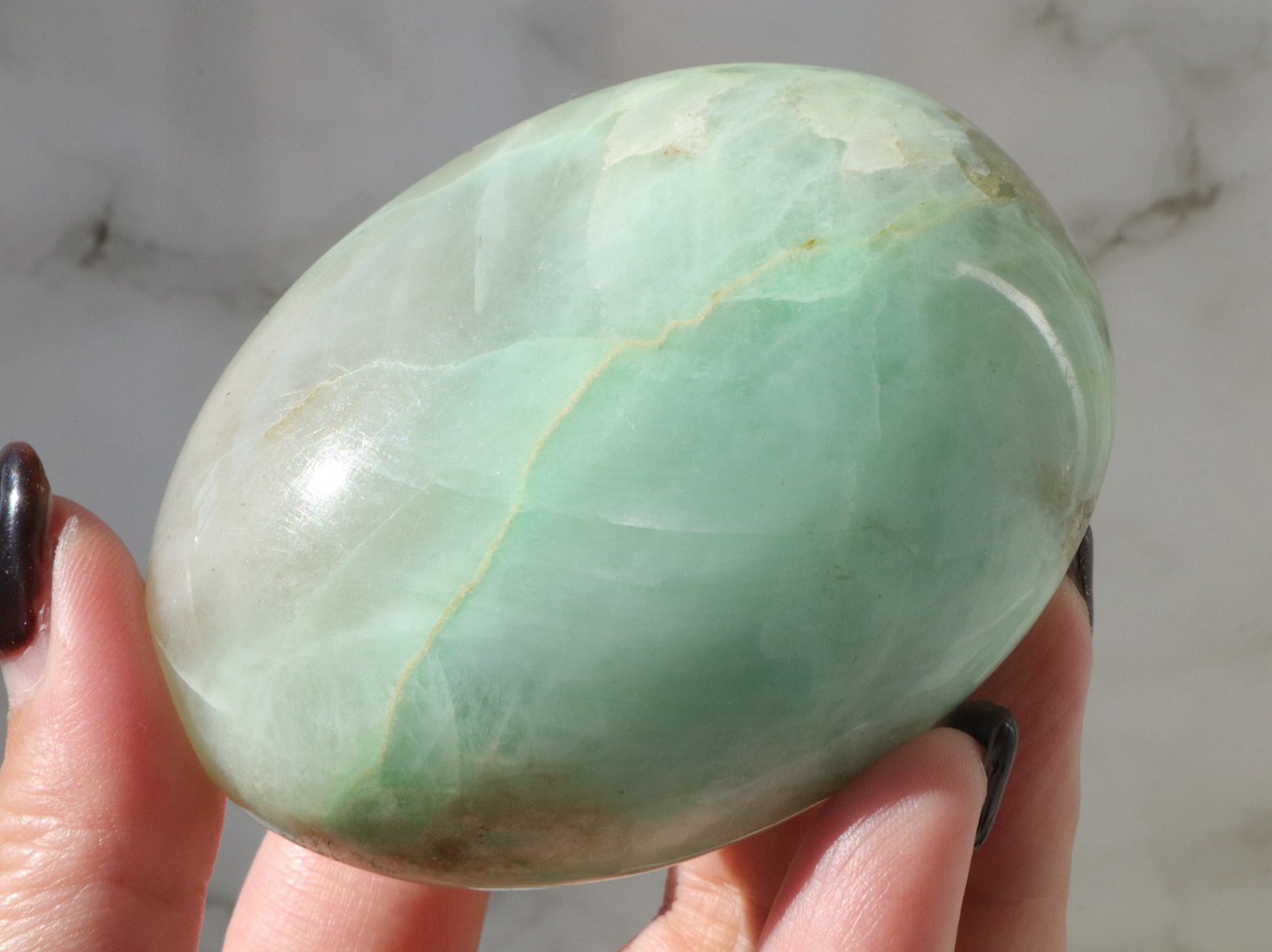 色合いは、パステルイエロー、パステルグリーン、ミントグリーン、淡く美しい印象の石です。ニッケルの含有量が多くなると濃い緑色になります✨
