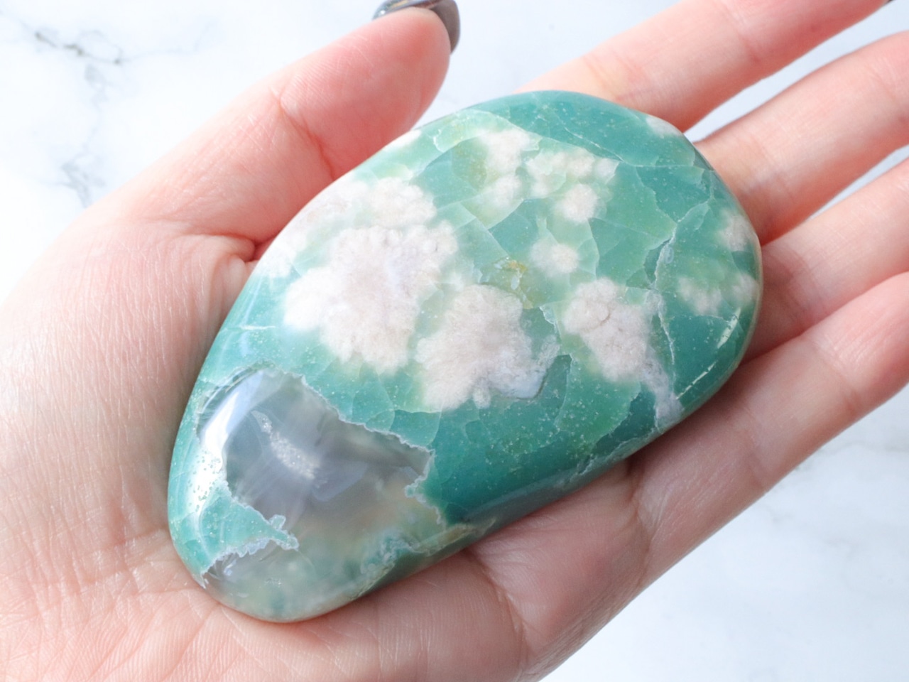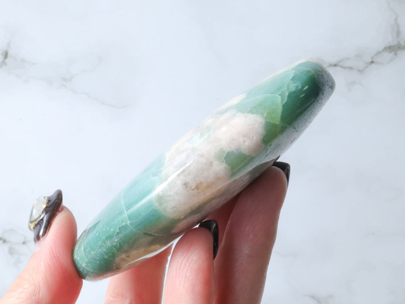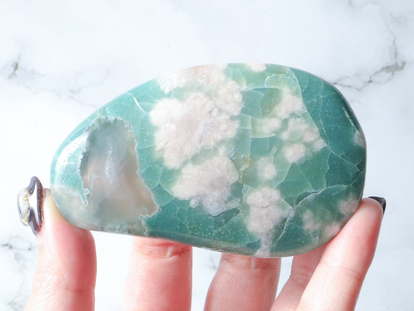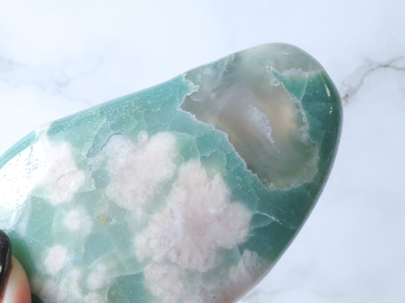 桜瑪瑙の中でもとても希少で、人気の高いグリーン桜瑪瑙さんがまたまた再入荷しました♡今回は勾玉にも見えるような型で、両面濃いグリーンに小花柄が可愛いくてとても美しいです♡瑪瑙部分は透明感があって光を通します✨動画も合わせてご覧ください♡