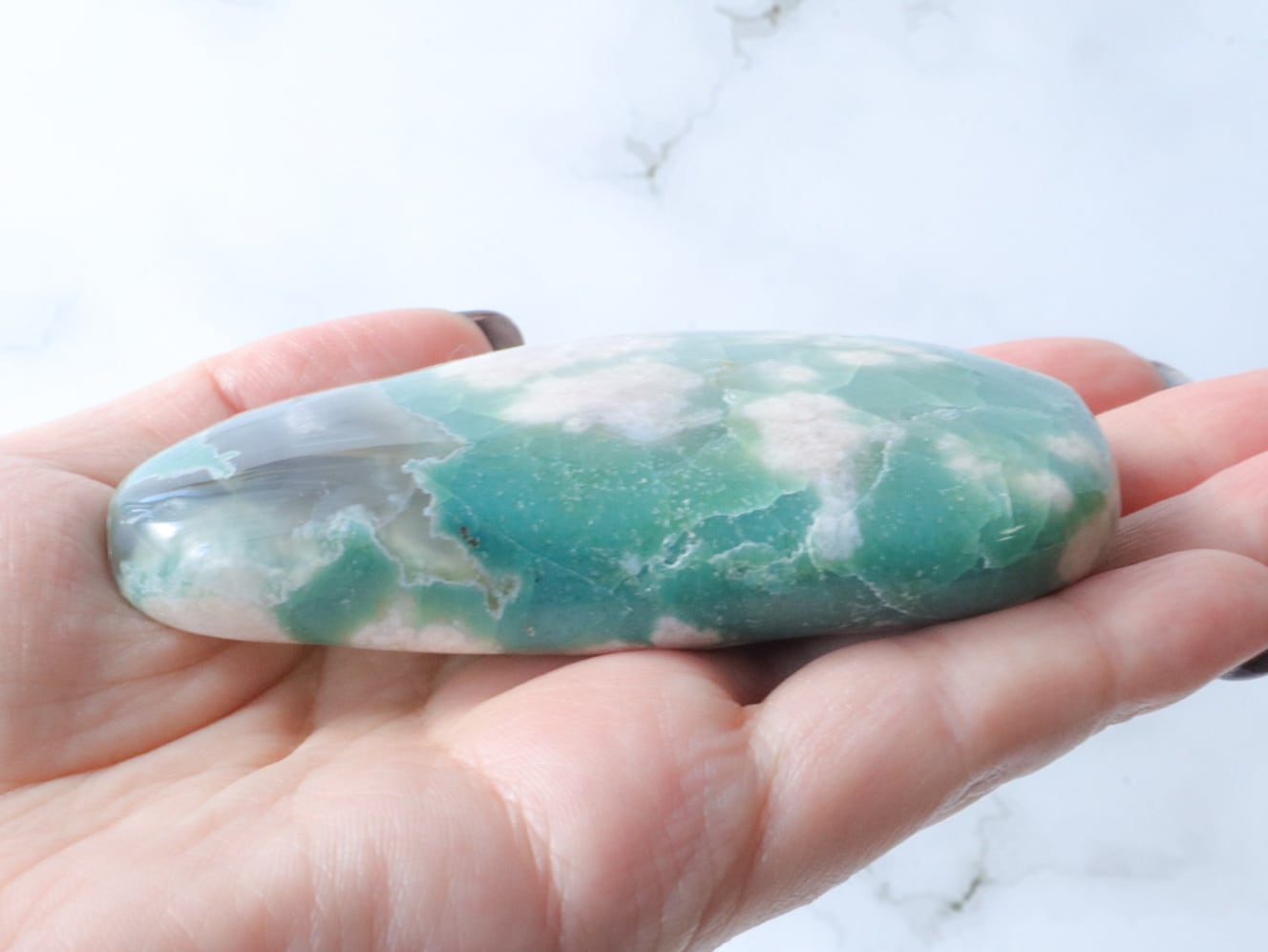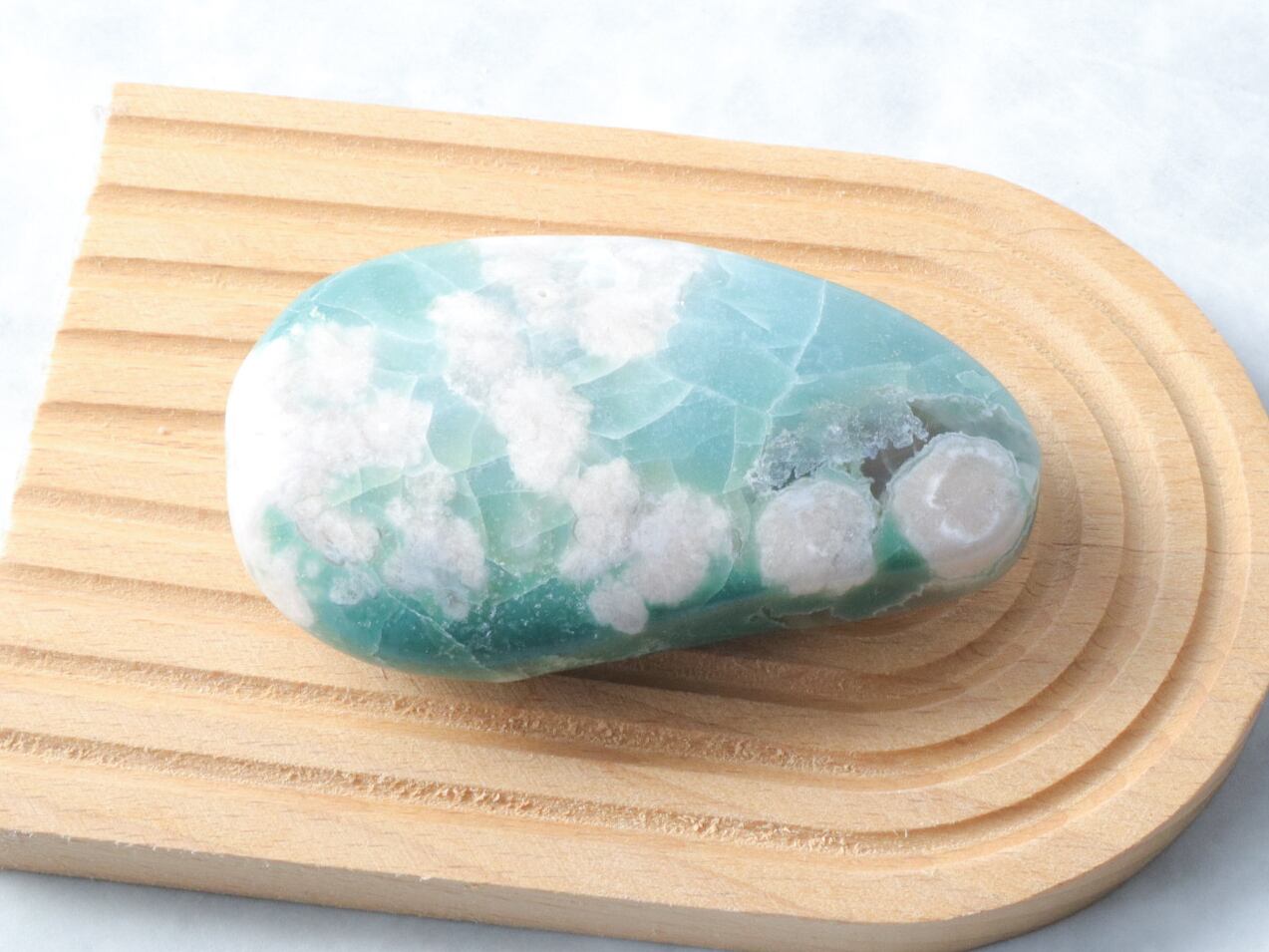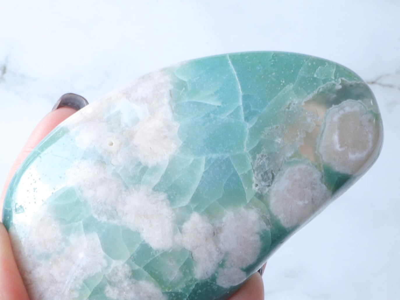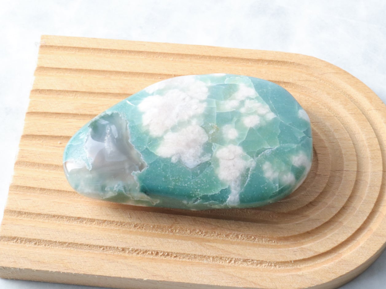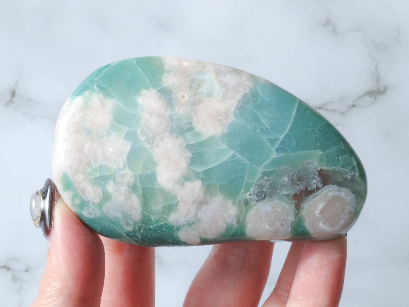 桜瑪瑙の中でもとても希少で、人気の高いグリーン桜瑪瑙さんがまたまた再入荷しました♡今回は勾玉にも見えるような型で、両面濃いグリーンに小花柄が可愛いくてとても美しいです♡瑪瑙部分は透明感があって光を通します✨動画も合わせてご覧ください♡