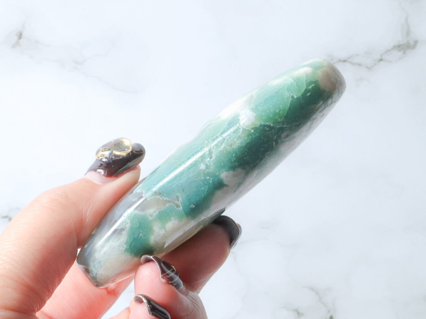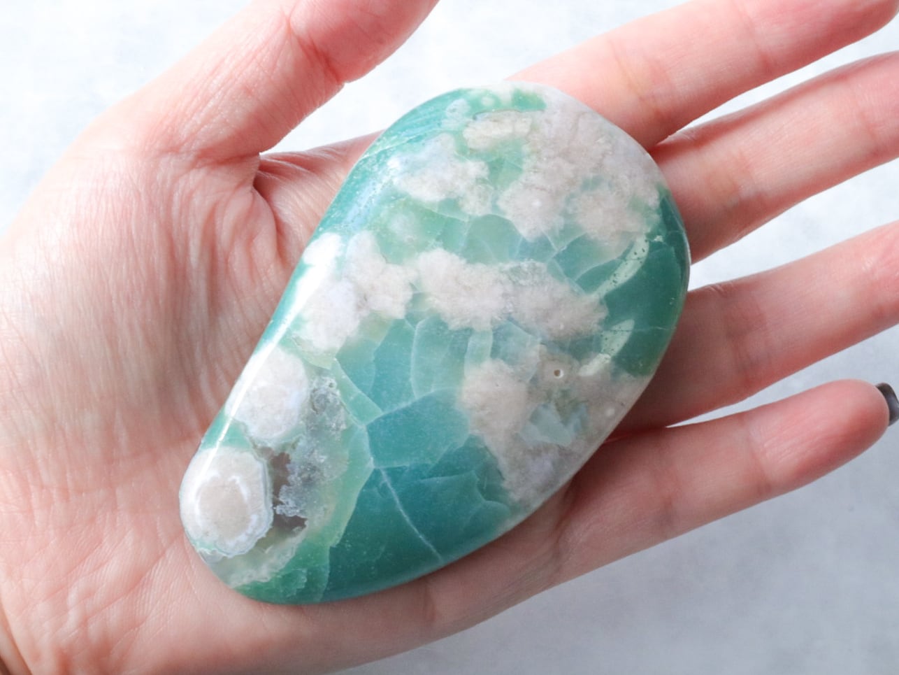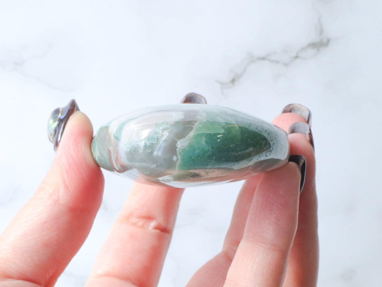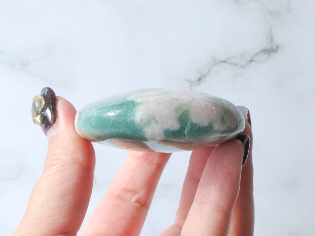 桜瑪瑙の中でもとても希少で、人気の高いグリーン桜瑪瑙さんがまたまた再入荷しました♡今回は勾玉にも見えるような型で、両面濃いグリーンに小花柄が可愛いくてとても美しいです♡瑪瑙部分は透明感があって光を通します✨動画も合わせてご覧ください♡