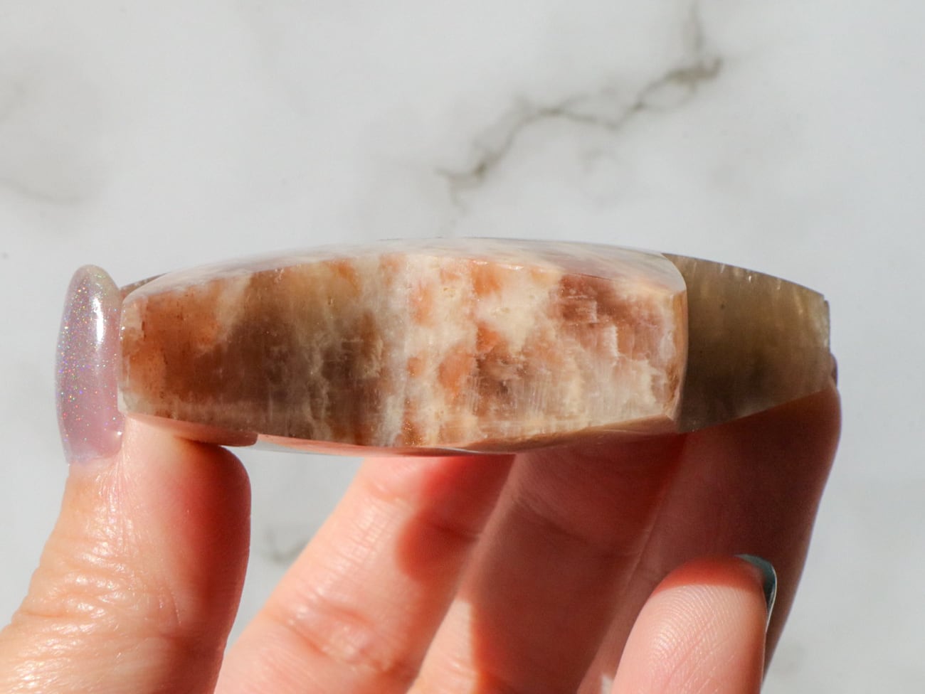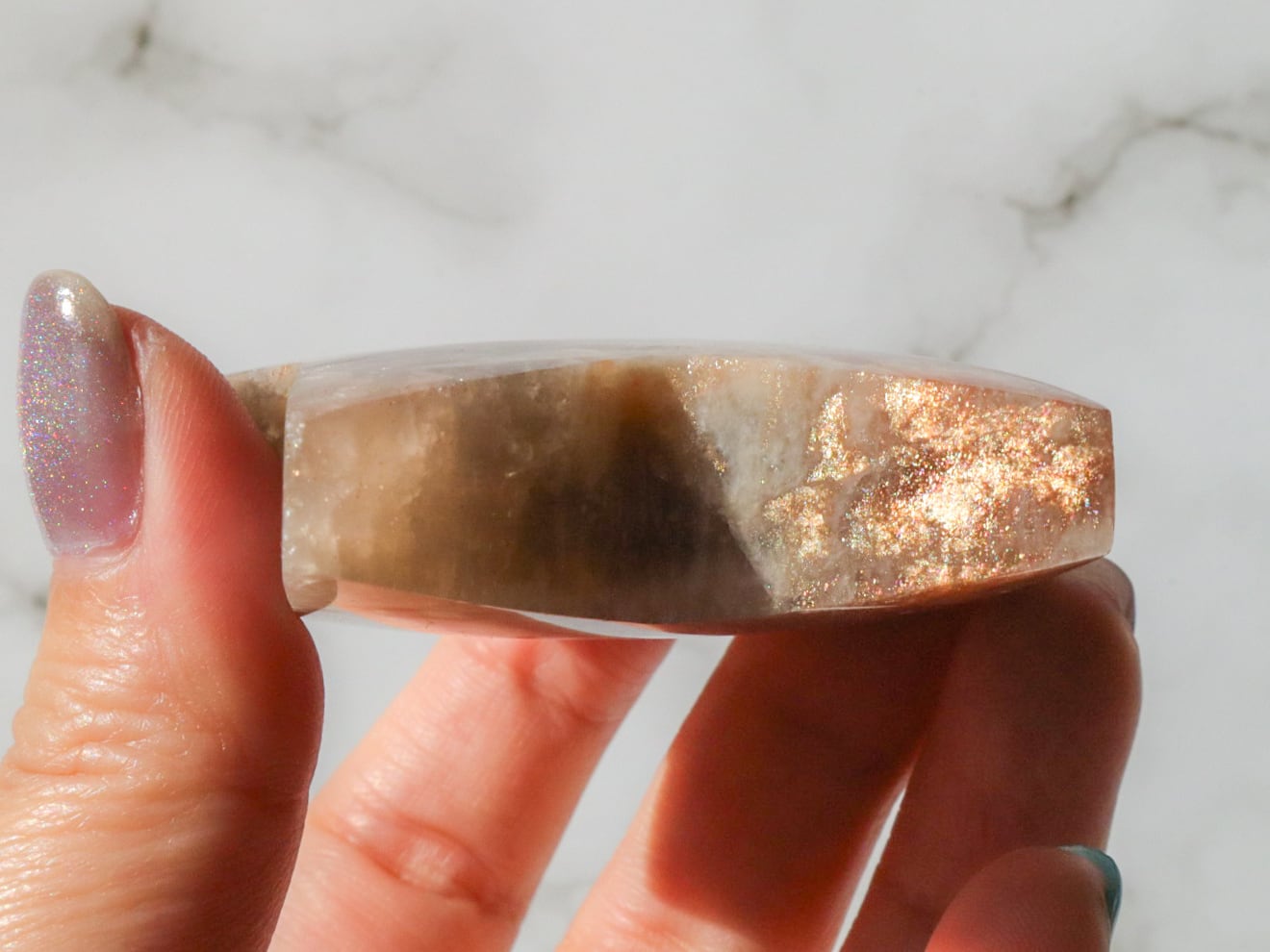 自然光と室内光だとまた違った良さを感じることが出来ます✨暗めの室内でムーンストーンにだけ光を当てるようにしてみると、余すところなくこのこの良さをご堪能出来ると思います♡側面すらも美しいシラーが見られるので、是非♡余すところなくお楽しみください♪