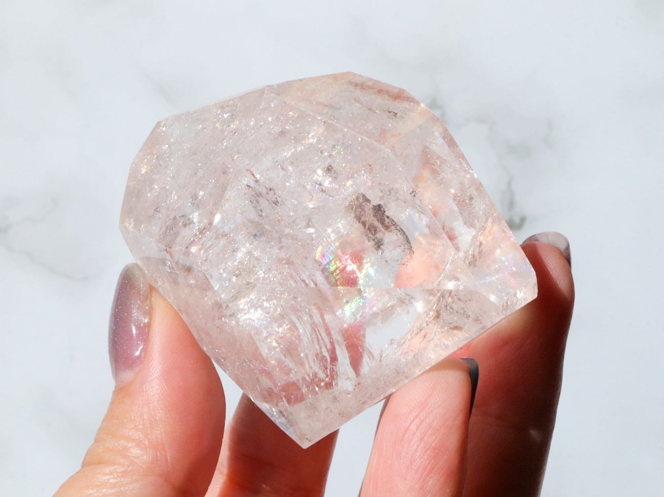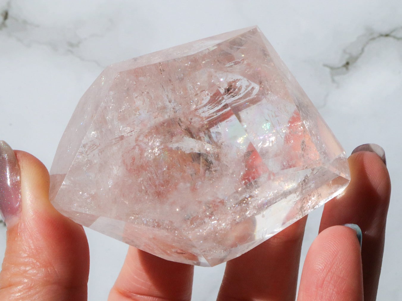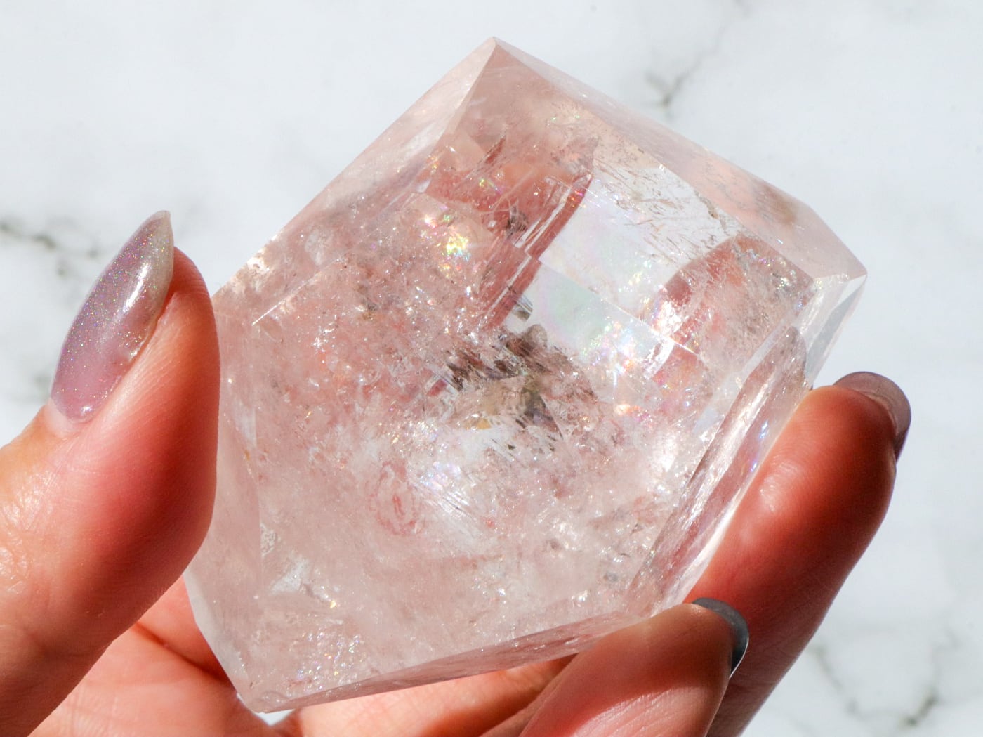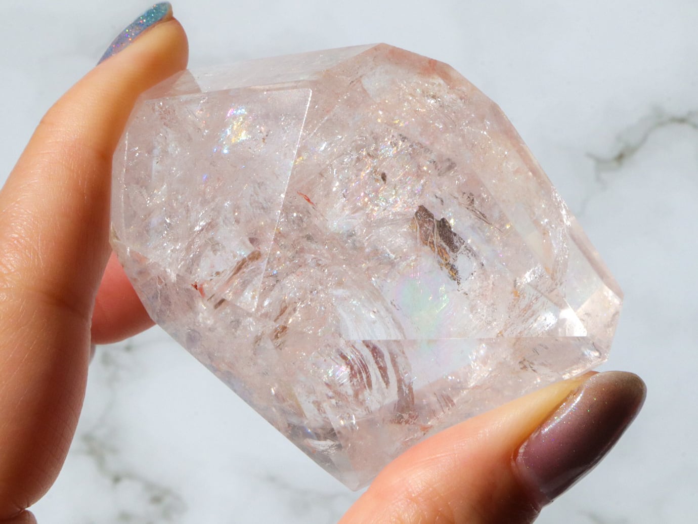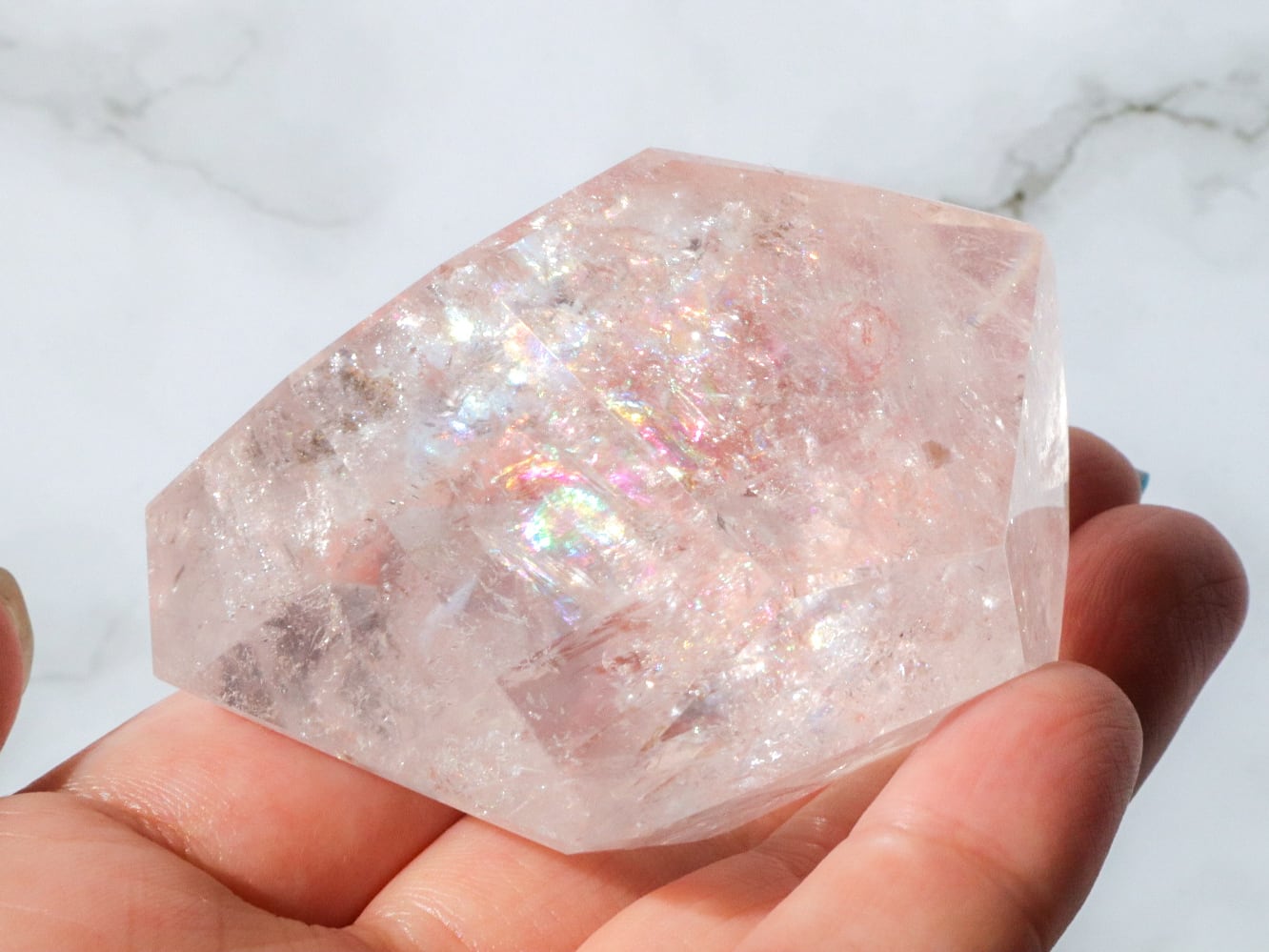 大きな虹が一際存在感を醸し出す、ピンクファイアーアゼツライトのフリーフォームのご紹介です♡このこはピンクはかなり薄めです。動画のように白バックだとピンクがあるとわかります✨