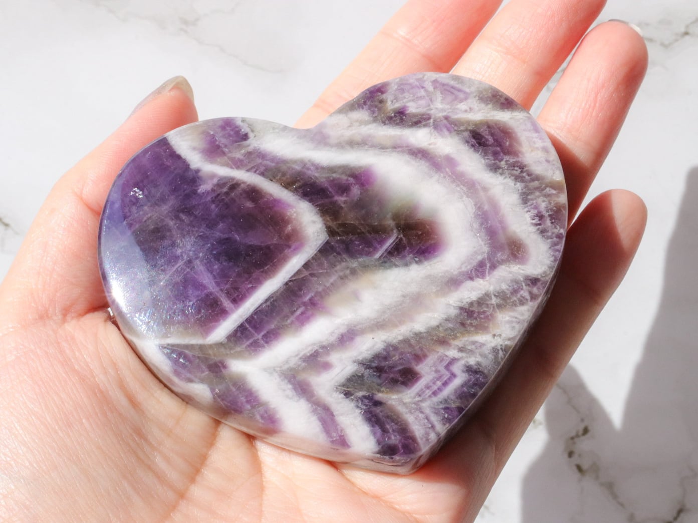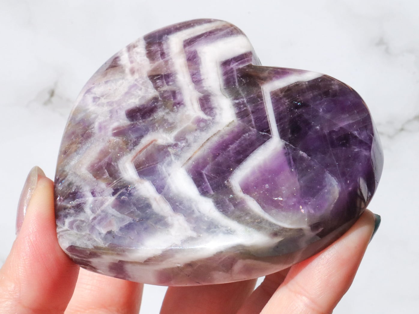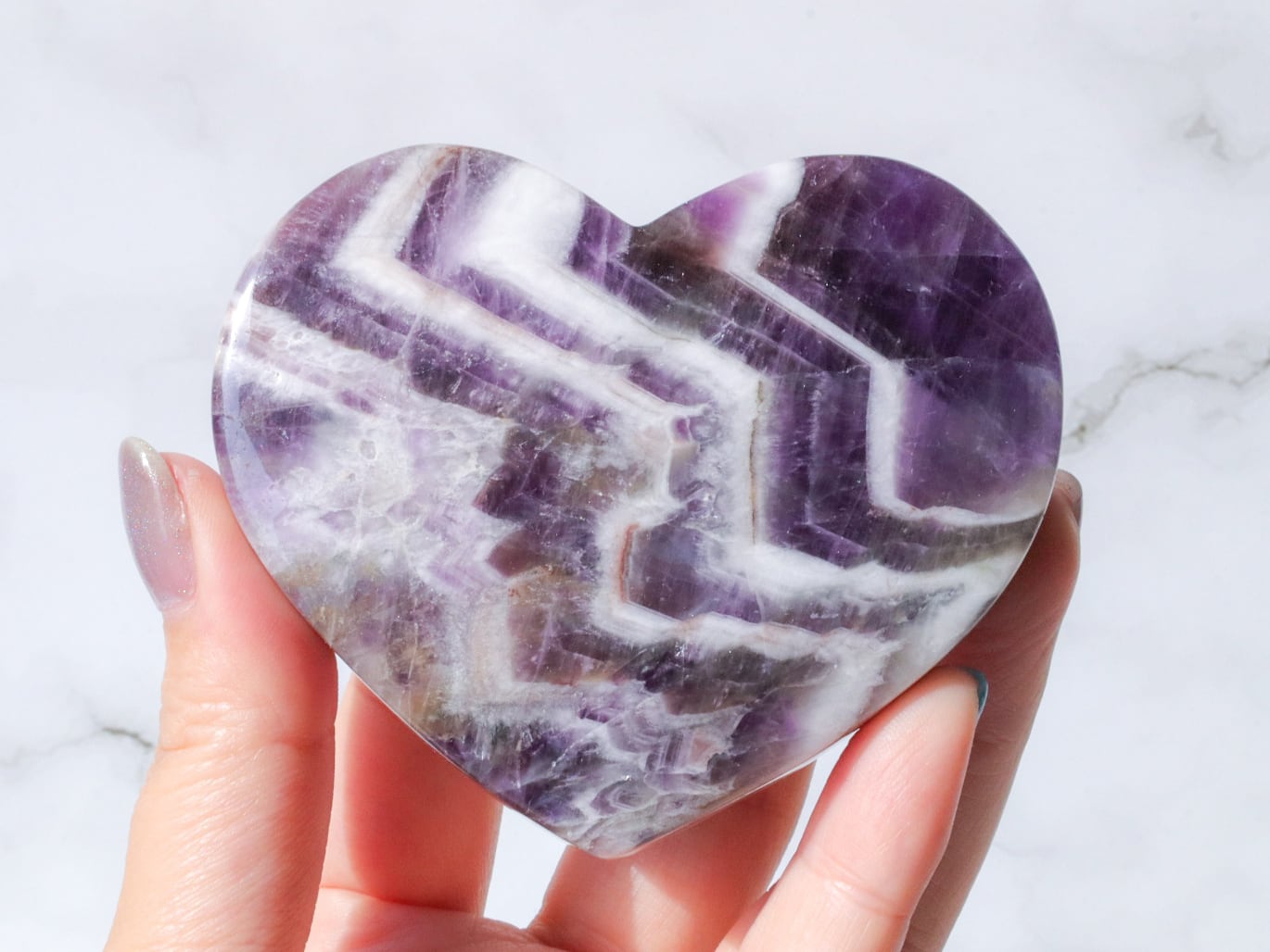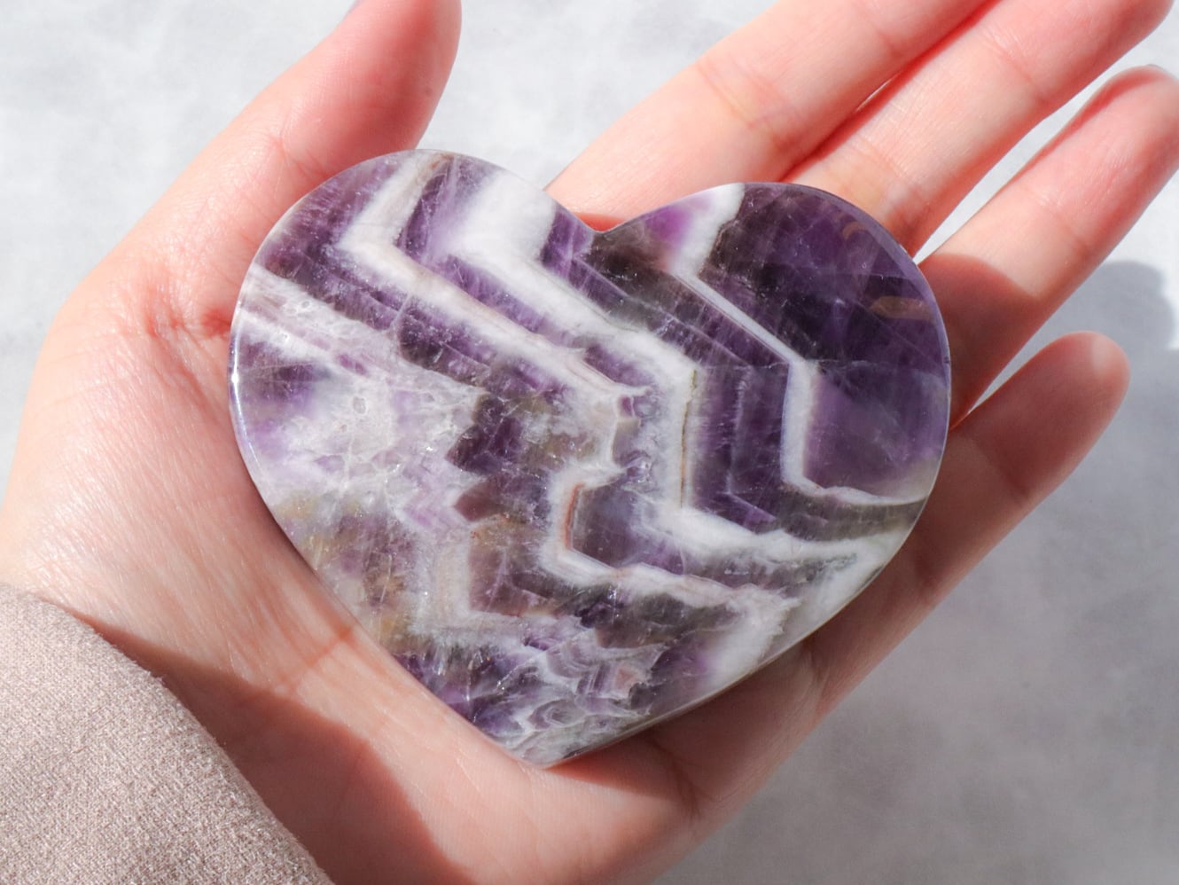 ドリームアメジストはシェブロンアメジストとも呼ばれ、紫色の部分と、白い部分などを含むファントム(結晶の成長痕)が綺麗に分かれ、アメジストの神秘的なグラデーションやファントムの模様が楽しめるお石さんです✨✨白い部分と、濃くハッキリとした紫のコントラストで、花びらのようにも見える模様が楽しませてくれます♡