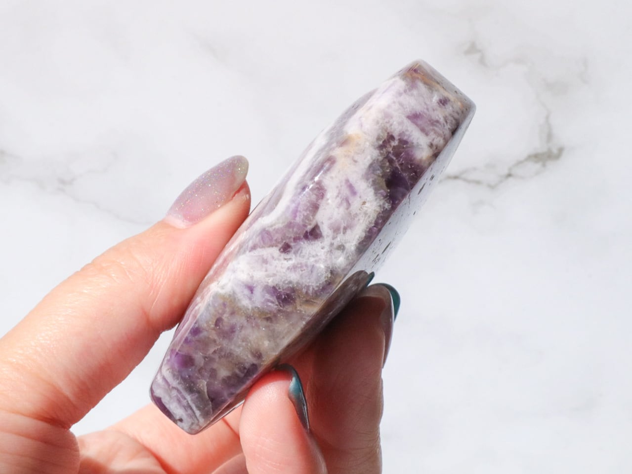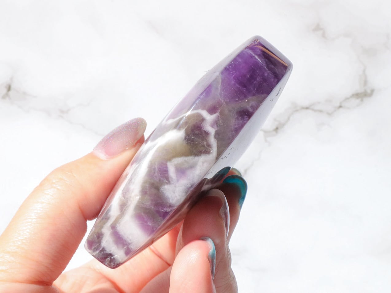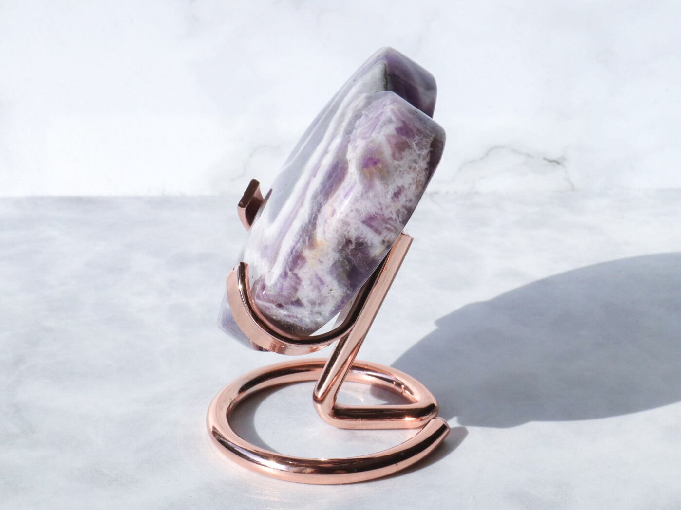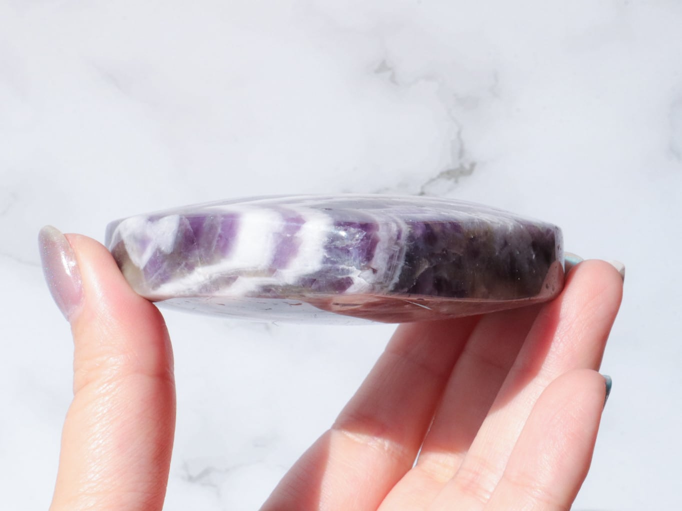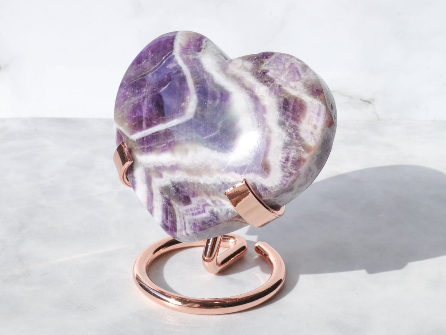 ドリームアメジストはシェブロンアメジストとも呼ばれ、紫色の部分と、白い部分などを含むファントム(結晶の成長痕)が綺麗に分かれ、アメジストの神秘的なグラデーションやファントムの模様が楽しめるお石さんです✨✨白い部分と、濃くハッキリとした紫のコントラストで、花びらのようにも見える模様が楽しませてくれます♡