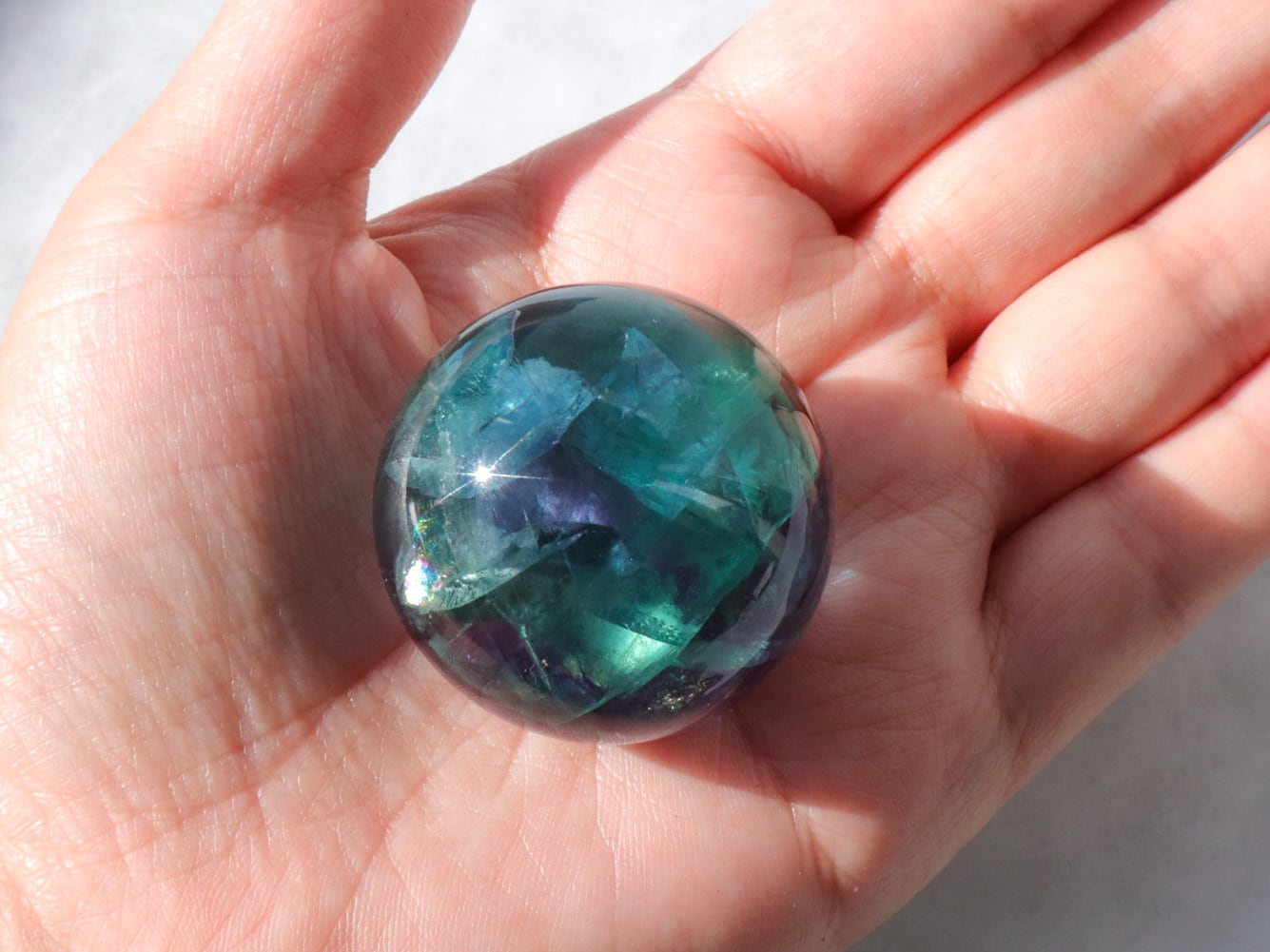 このこは、ブルーグリーン、パープル、パープルの真ん中に美しいブルーが輝くスフィアです✨✨虹もたくさん見ることが出来、小さいですが、どこを見ても楽しませてくれます✨✨
