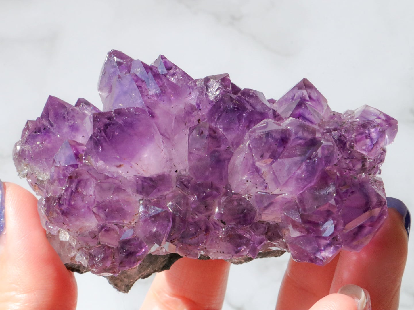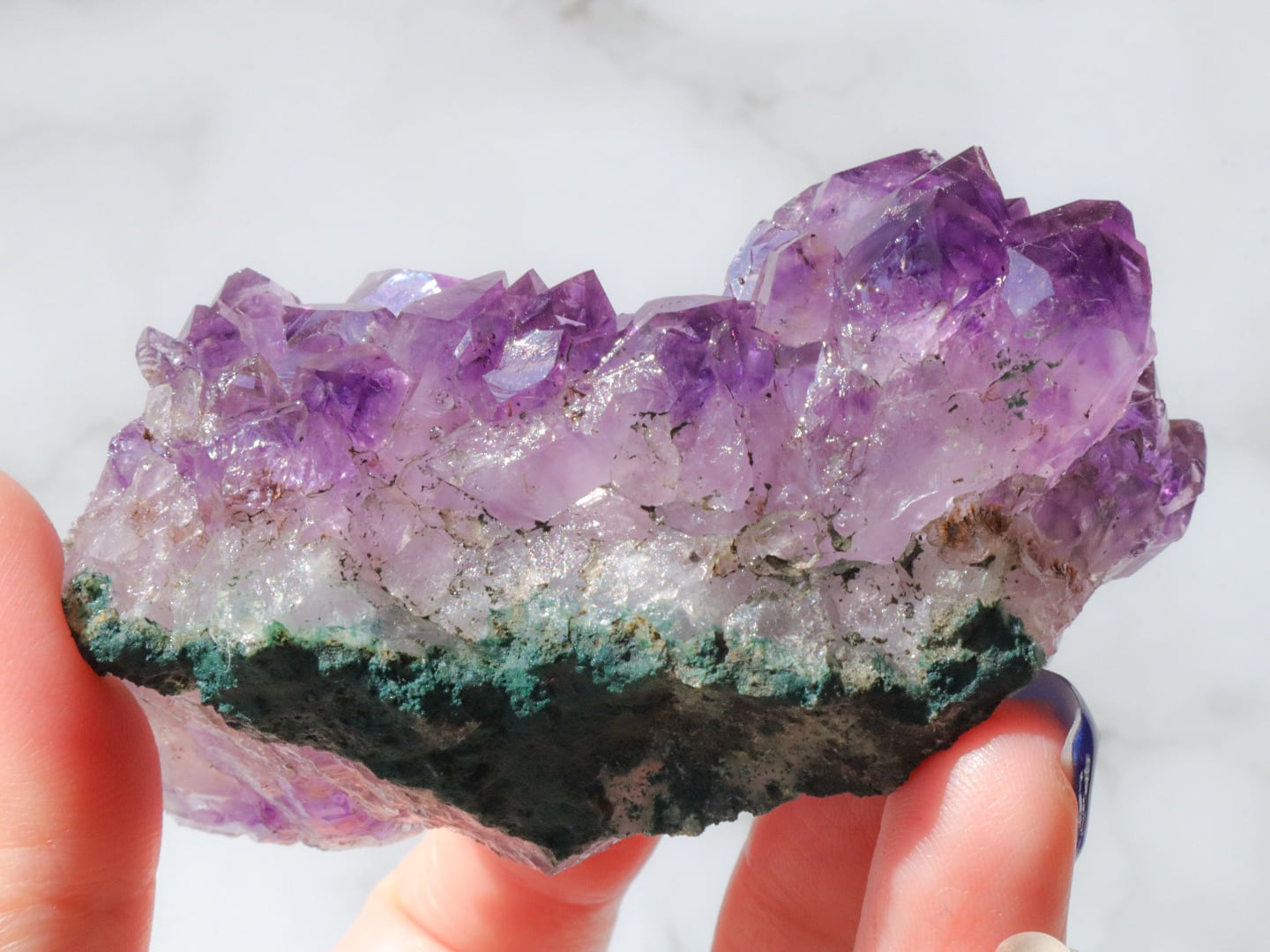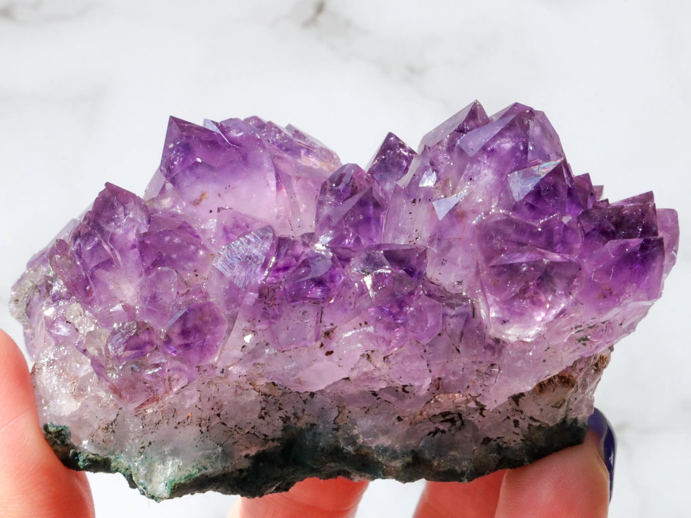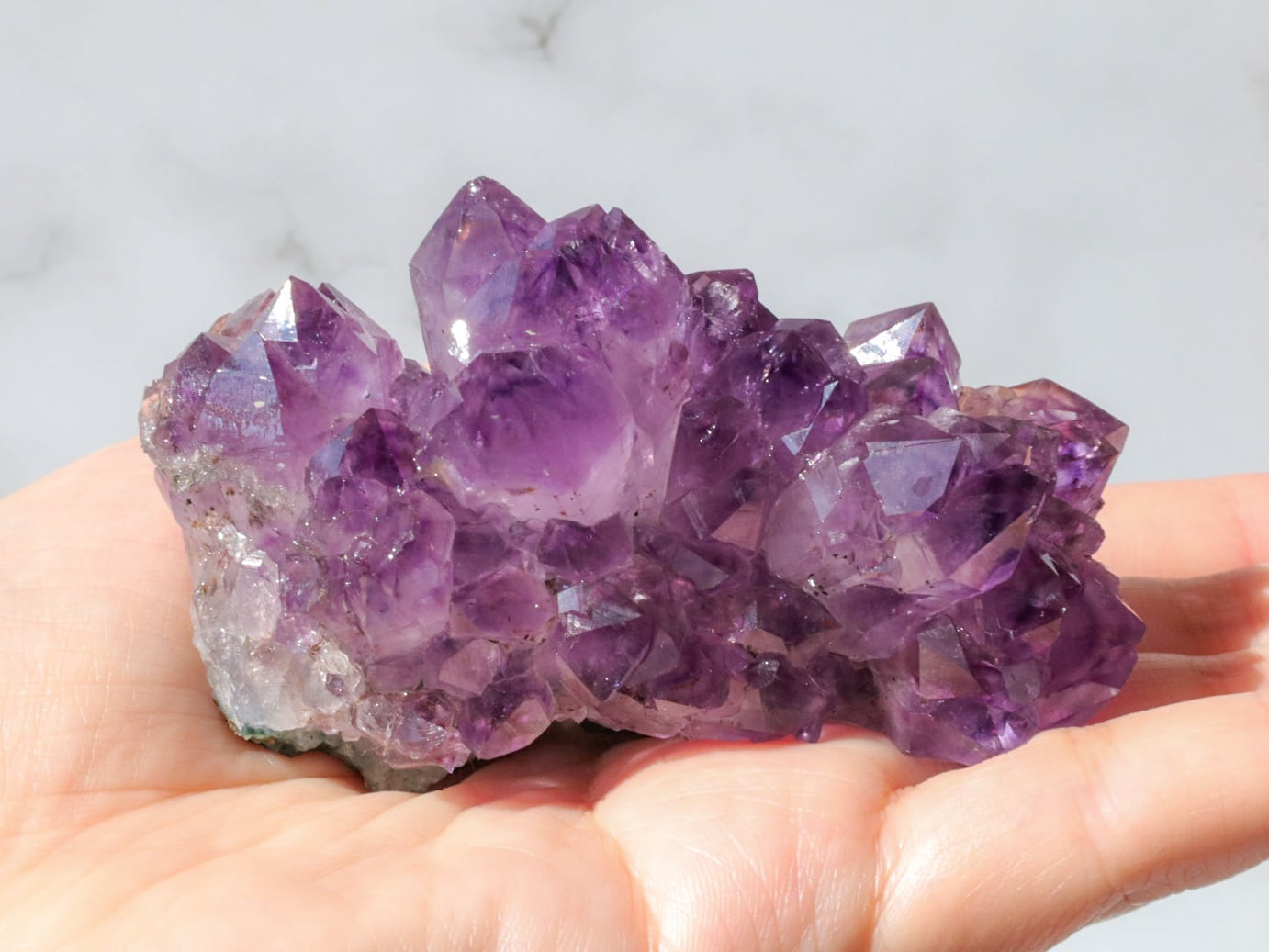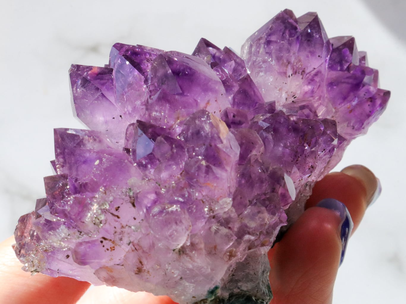 結晶には濃い紫のファントム模様も見られます✨大きな結晶のまわりに小さな結晶がたくさん付いている箇所もあります✨