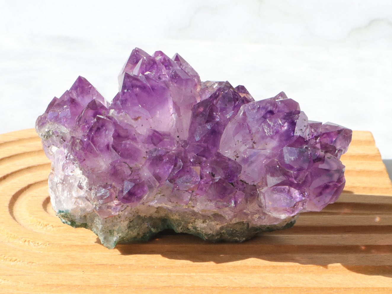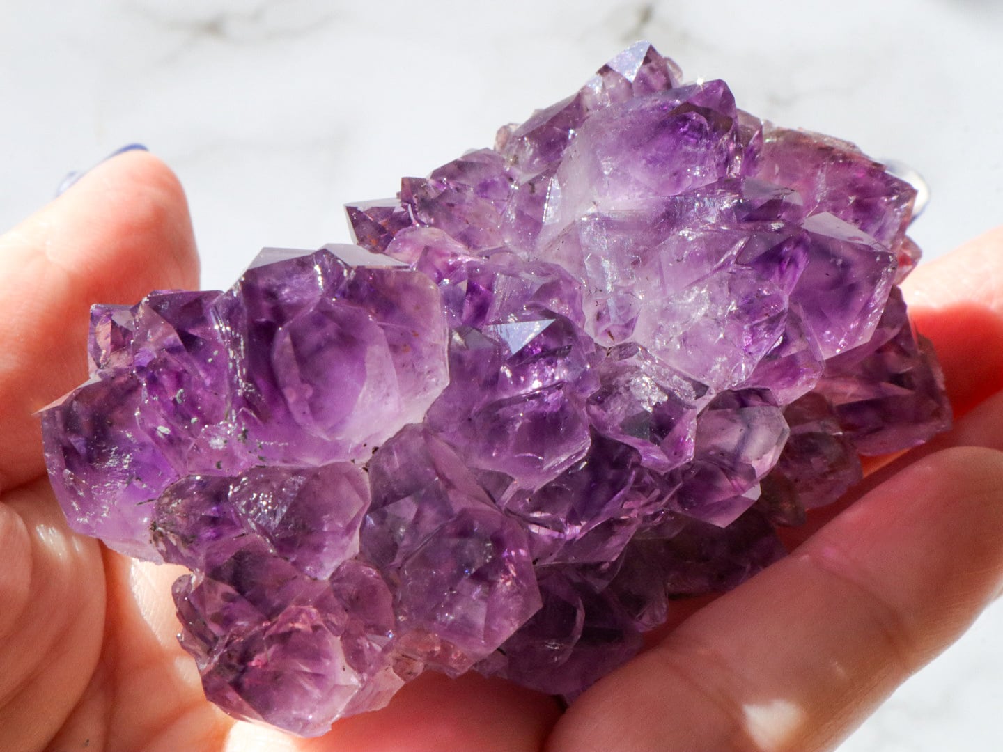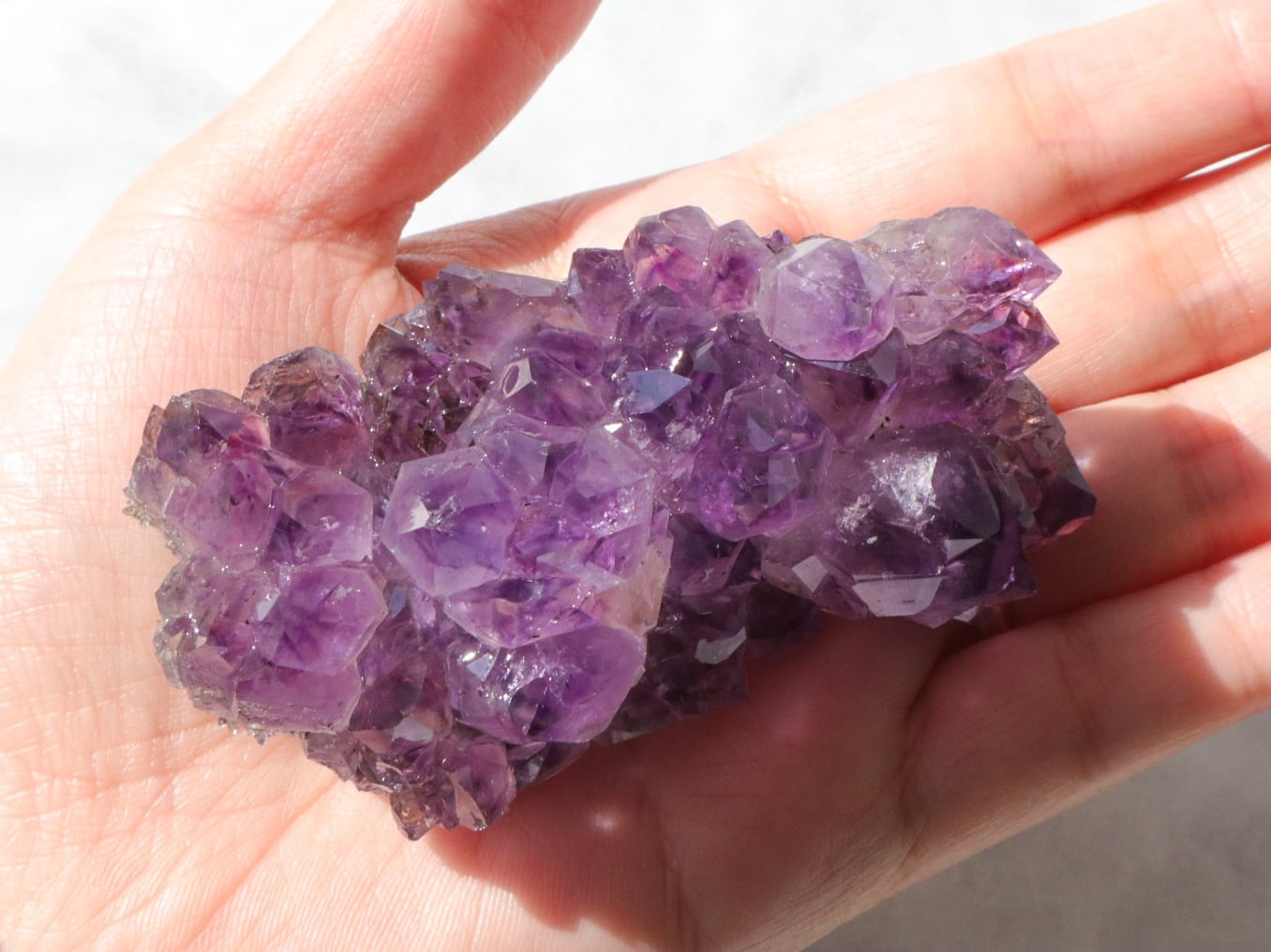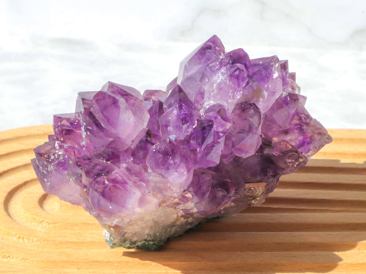 結晶には濃い紫のファントム模様も見られます✨大きな結晶のまわりに小さな結晶がたくさん付いている箇所もあります✨