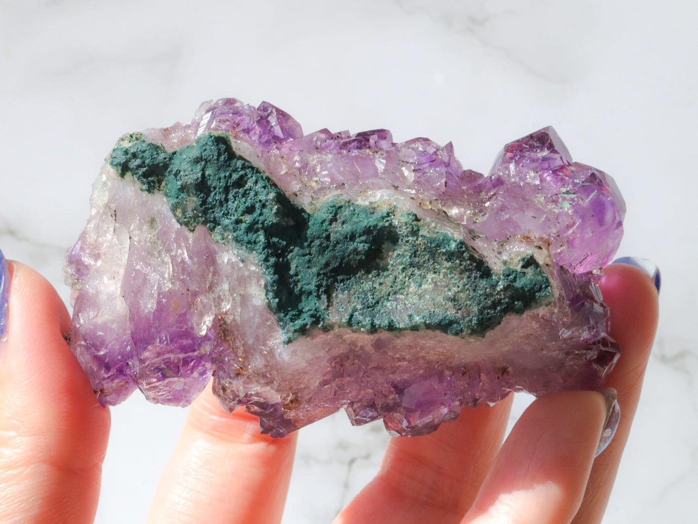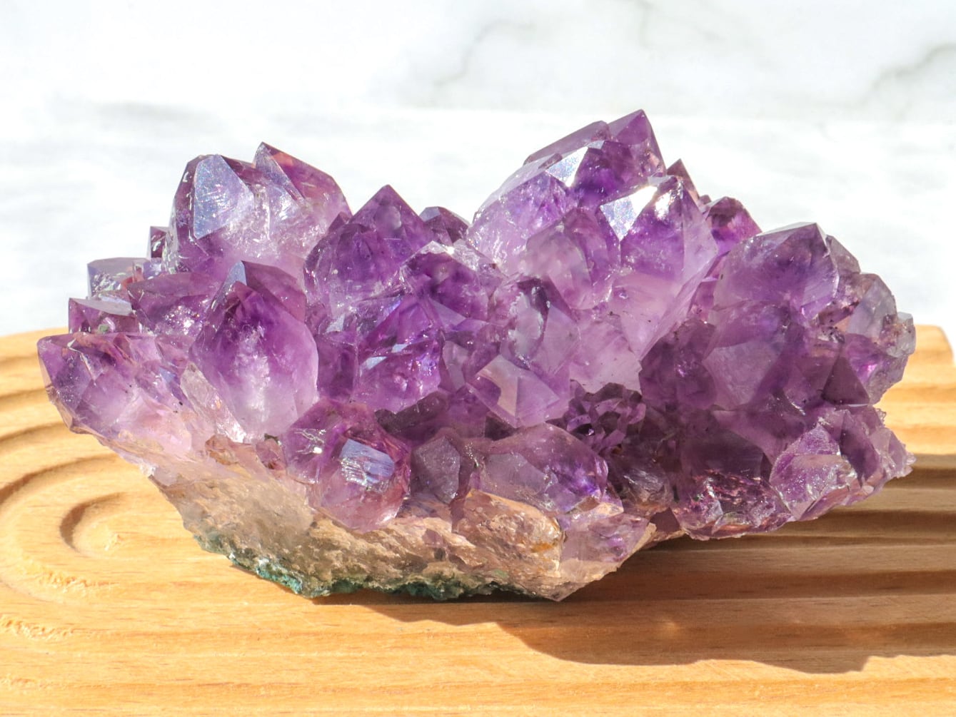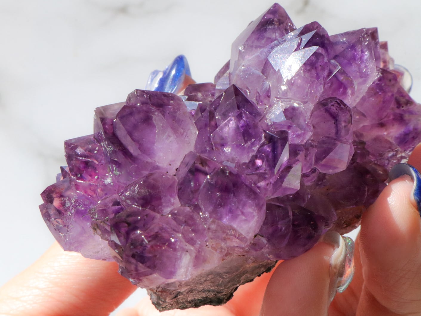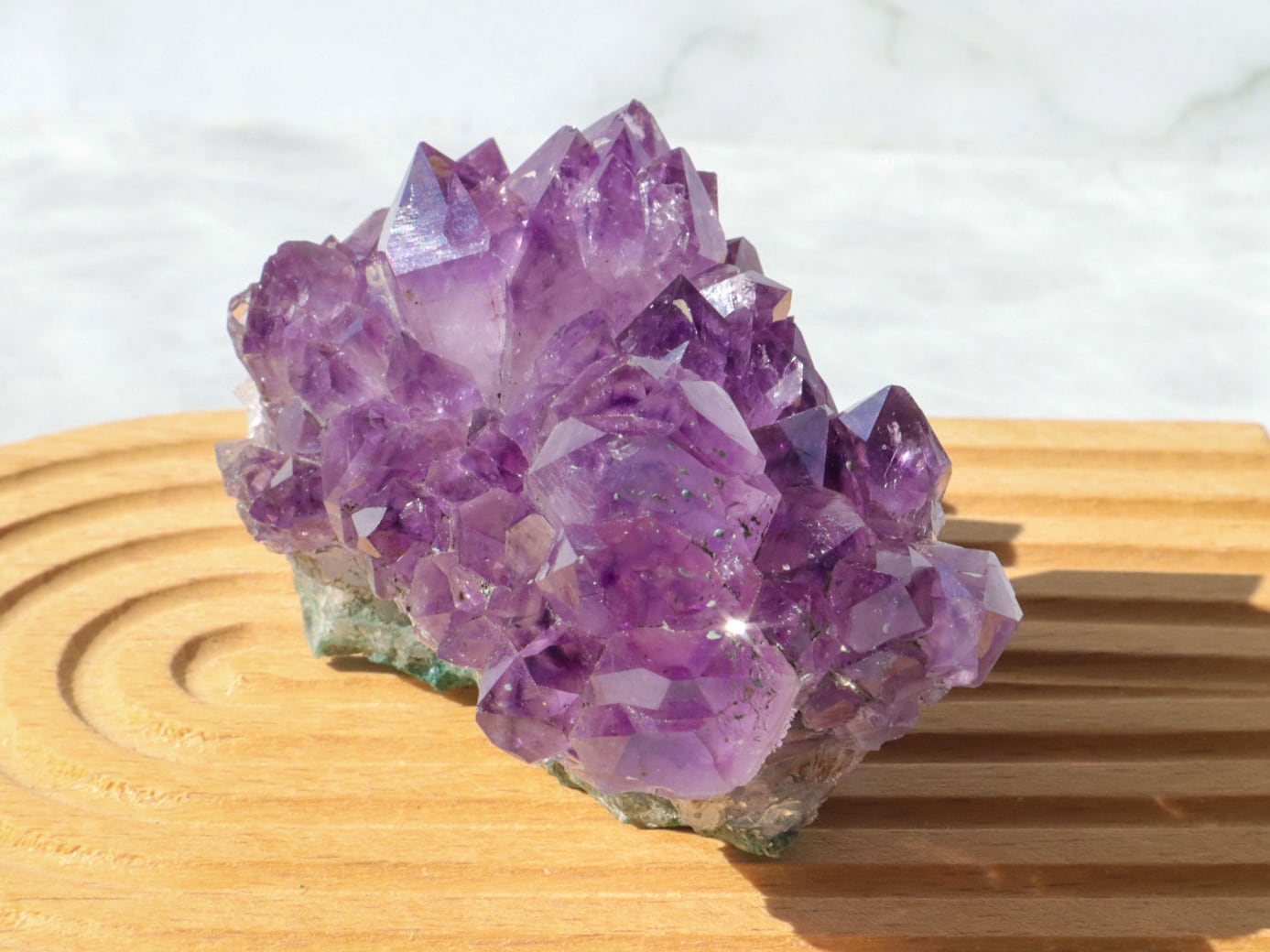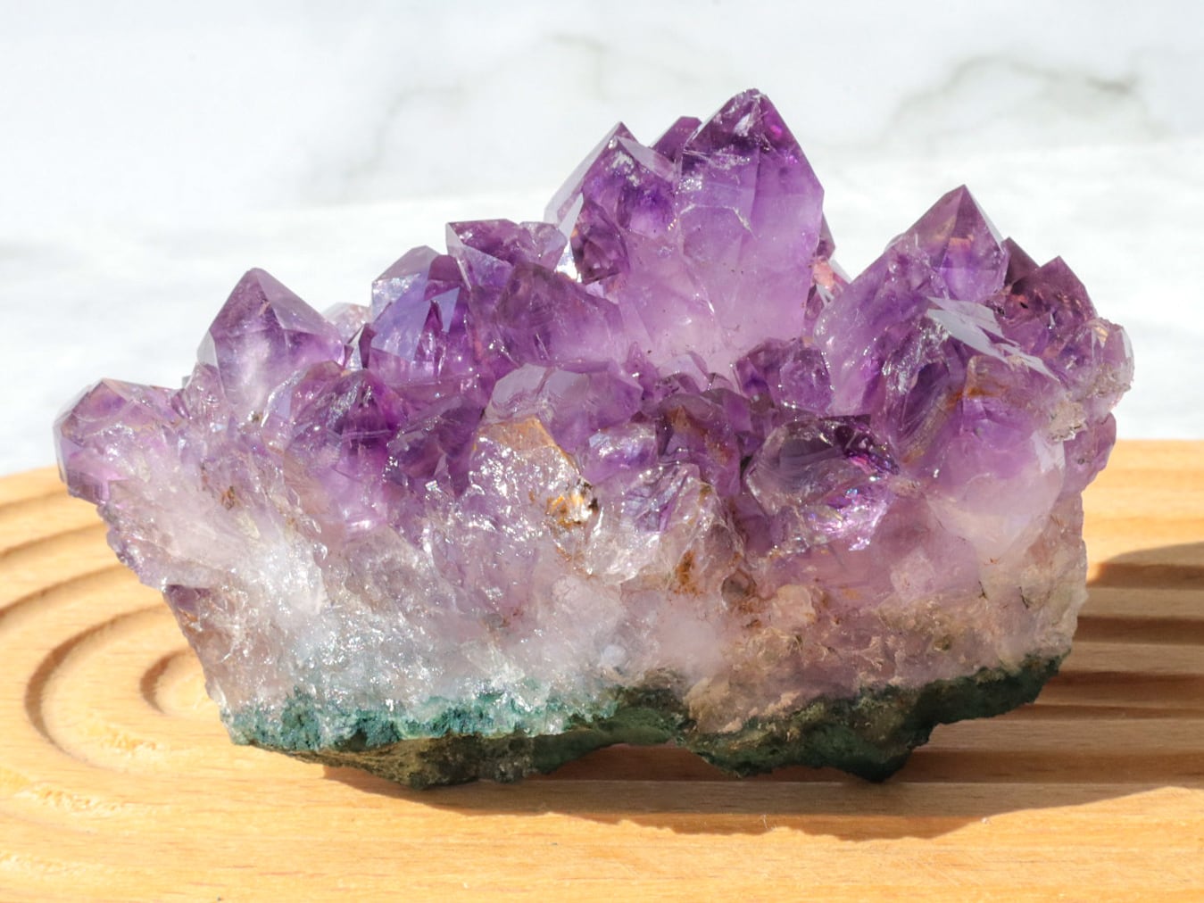 結晶には濃い紫のファントム模様も見られます✨大きな結晶のまわりに小さな結晶がたくさん付いている箇所もあります✨