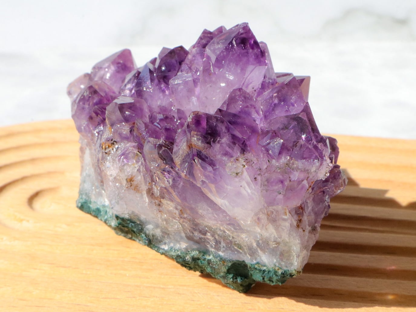 母岩はコンクリートなどで加工されていないので、触ると少し手に緑の粉が付きますがナチュラルな証拠です✨置いておく際には、ガラスのお皿か、木製の板など敷いて頂くとよいかと思います✨