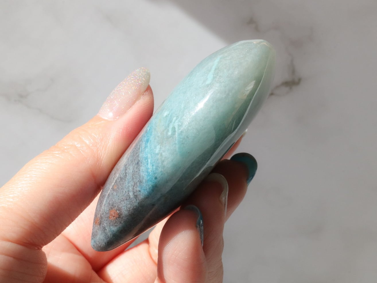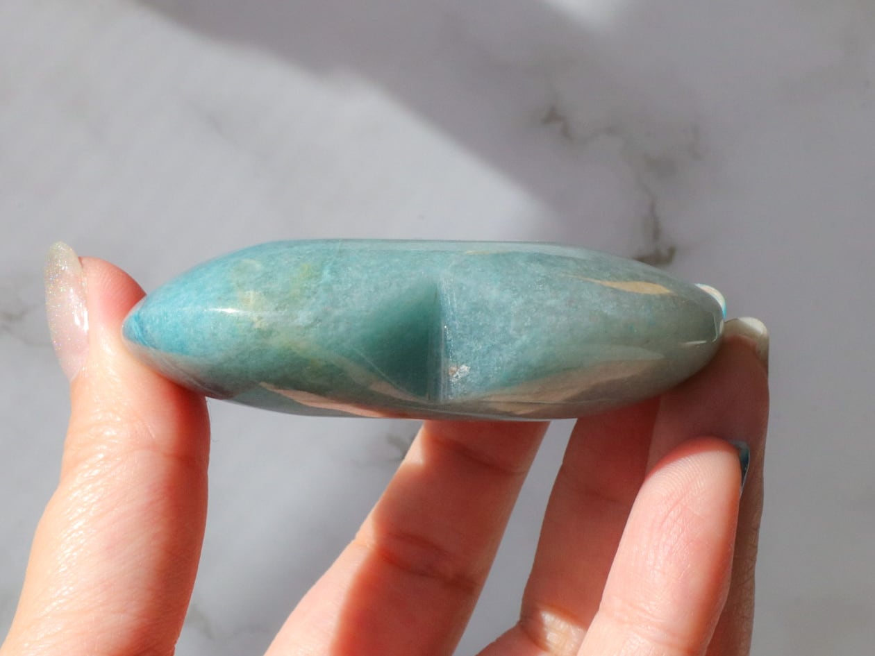 淡いブルーであっても、どことなくくすみを感じる優しい色合いで、なんとも不思議な神秘的な魅力があり、癒しを感じる人も多く、近年とても人気が出てきた石です♡