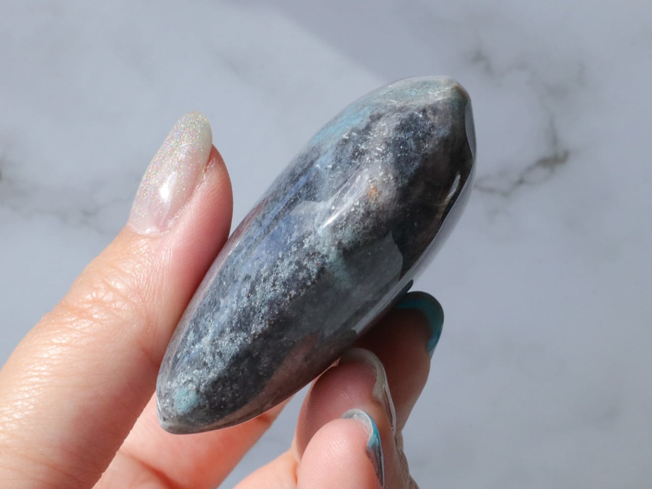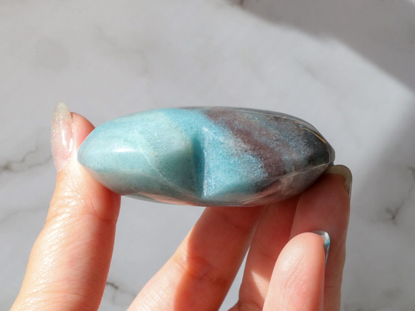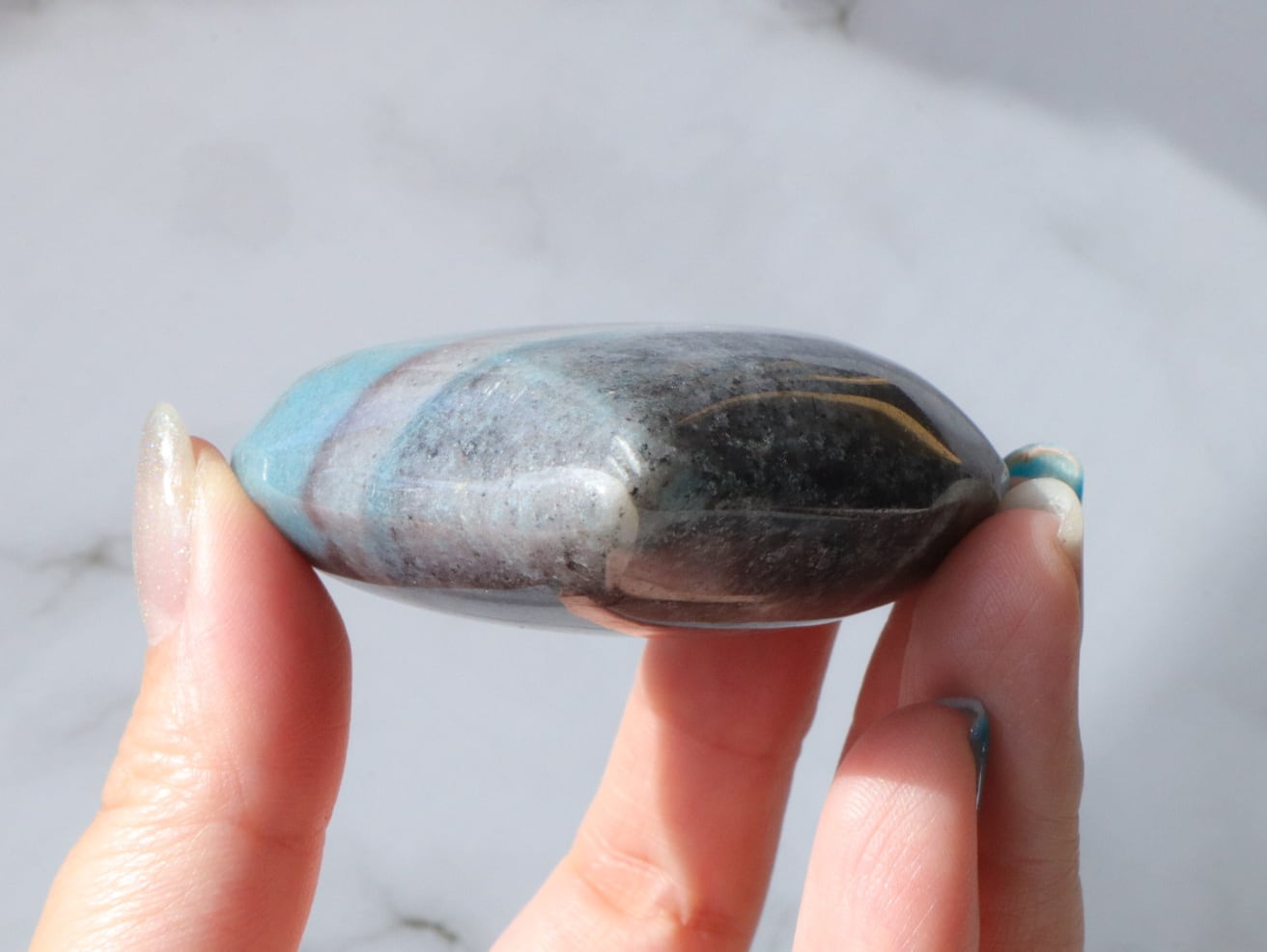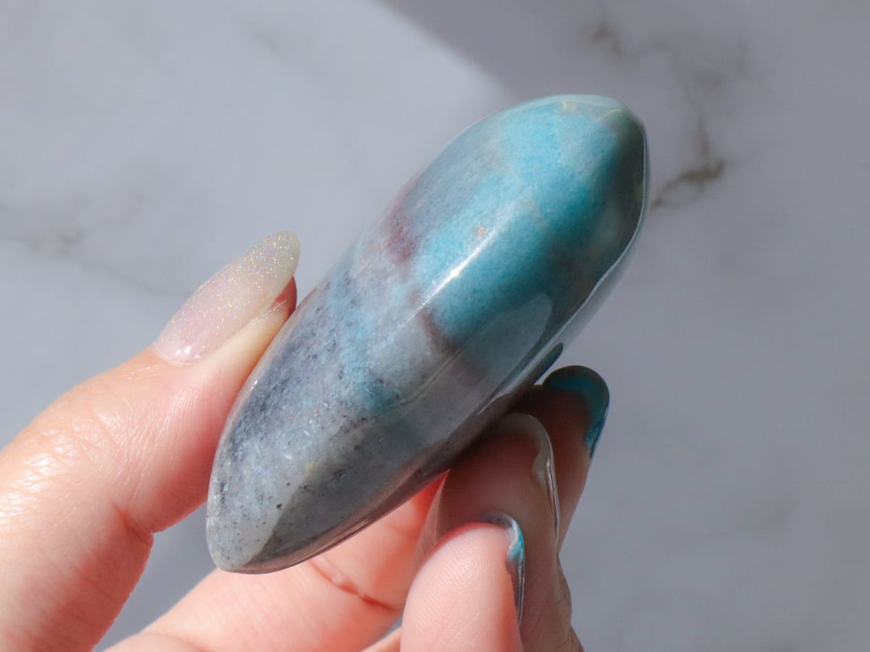 淡いブルーであっても、どことなくくすみを感じる優しい色合いで、なんとも不思議な神秘的な魅力があり、癒しを感じる人も多く、近年とても人気が出てきた石です♡