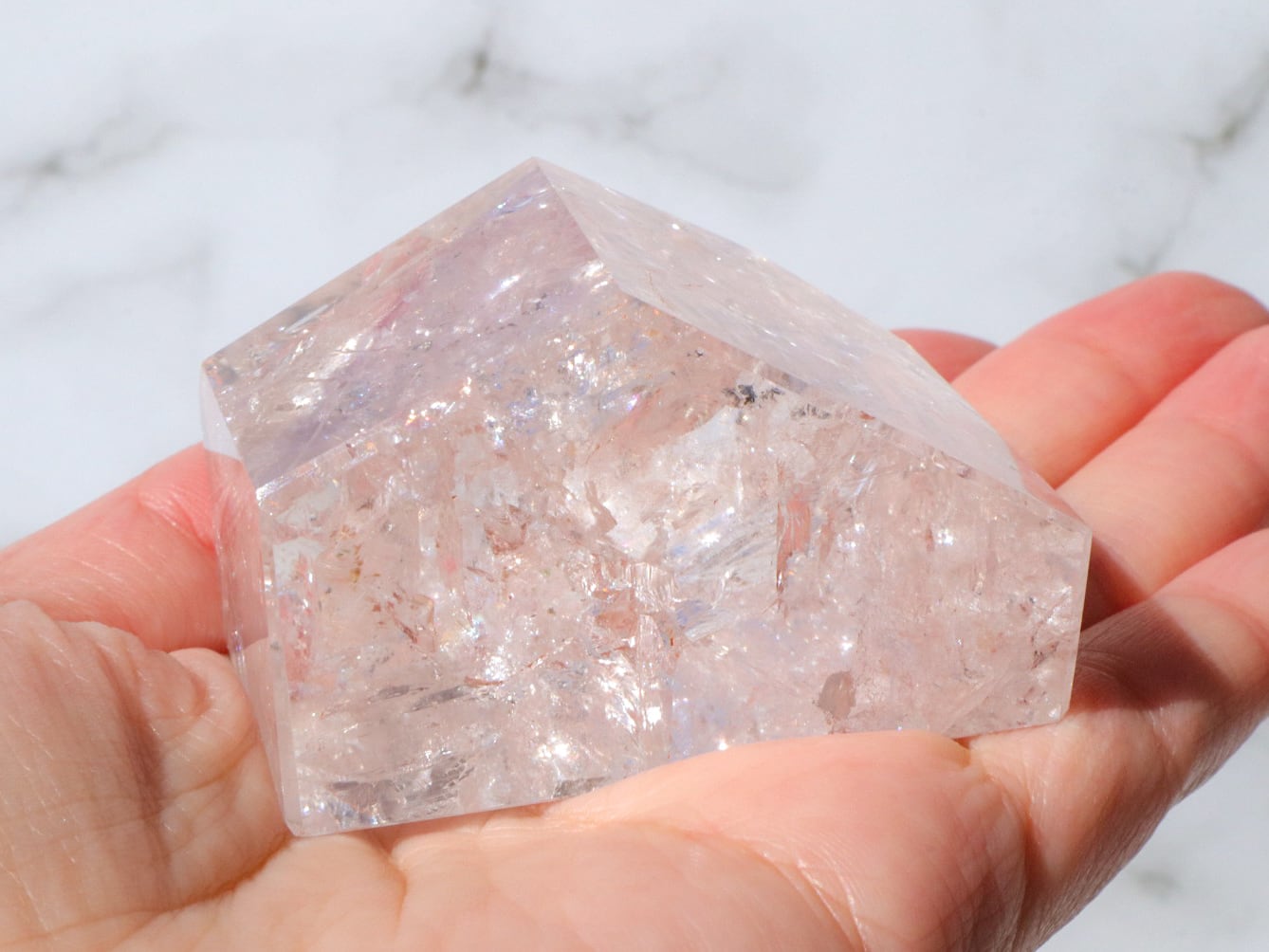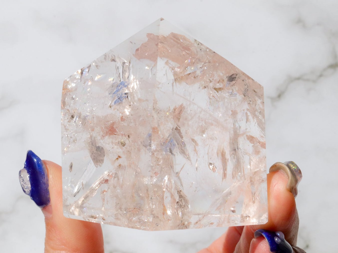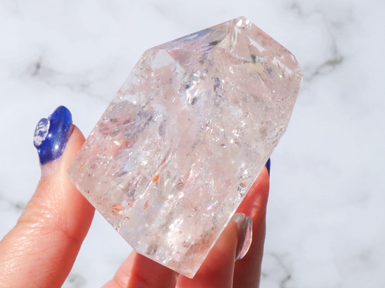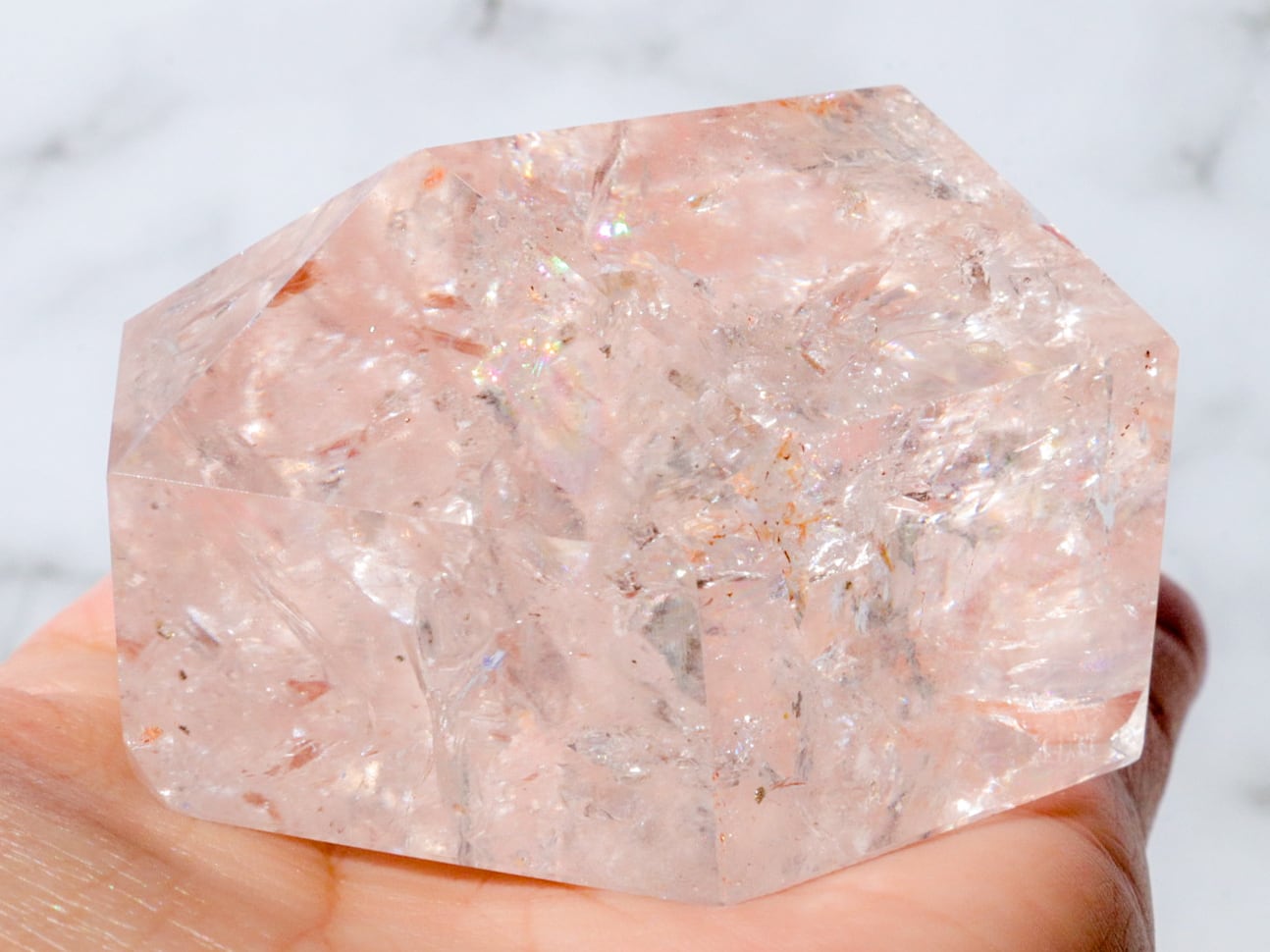 透明感と細かに散らばる虹がキラキラ光る、ピンクファイアーアゼツライトのフリーフォームのご紹介です♡このこはピンクはかなり薄めです。動画のように白バックだとピンクがあるとわかります✨