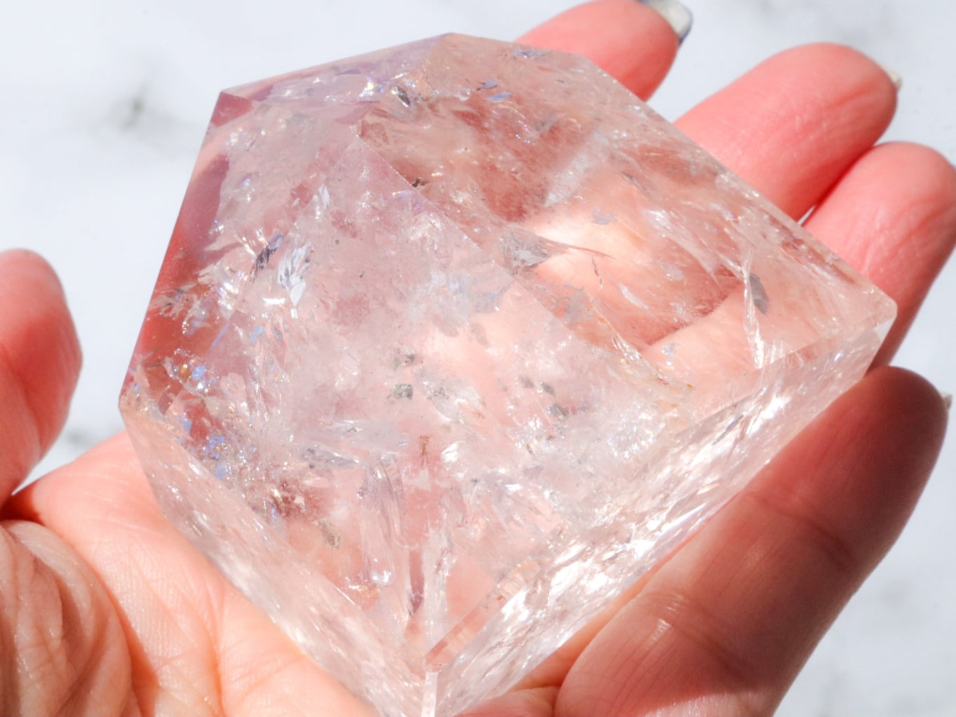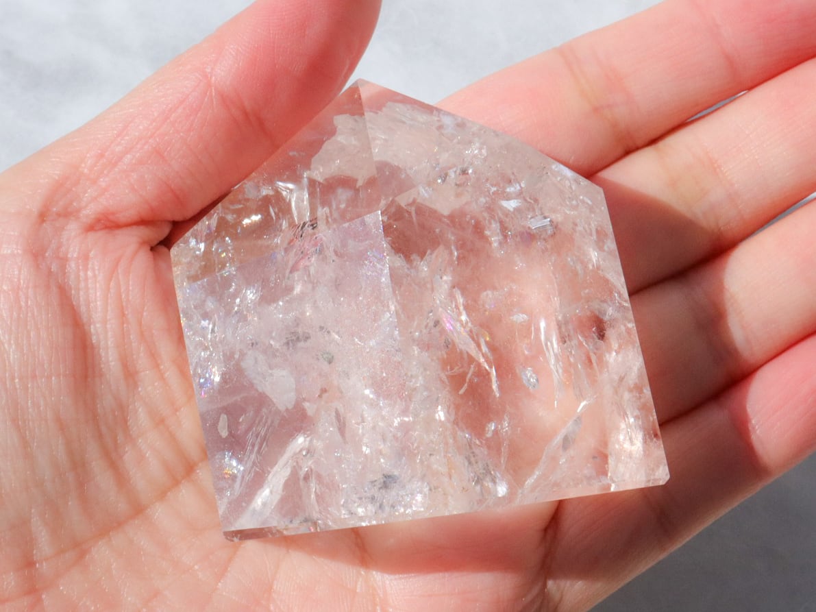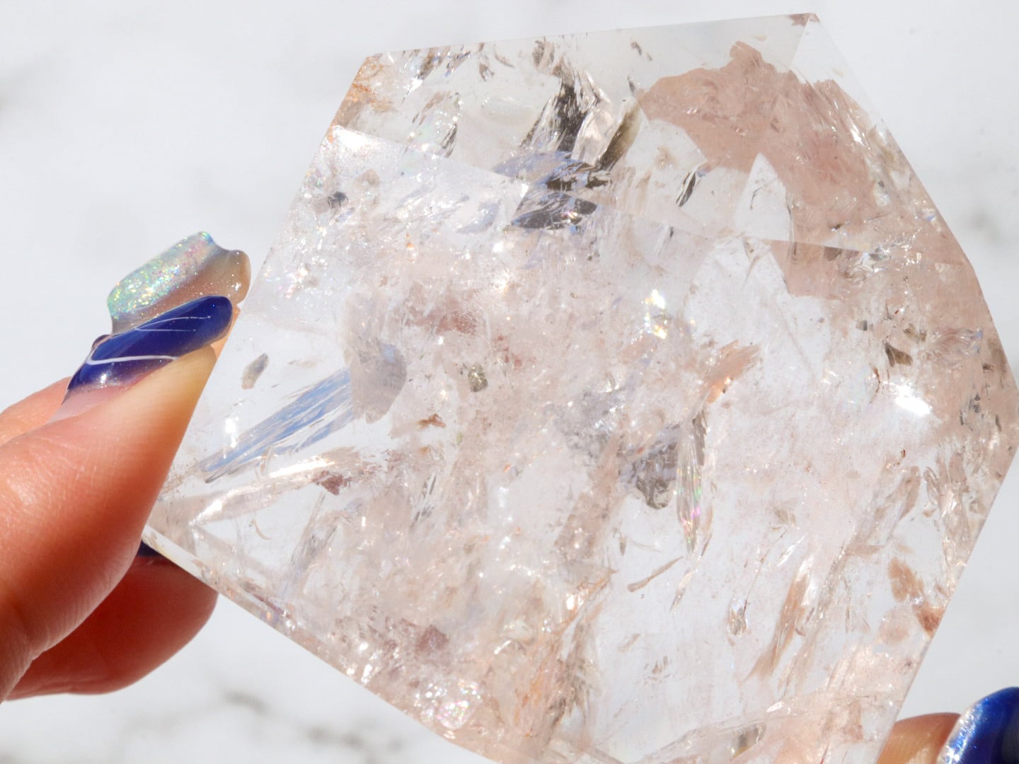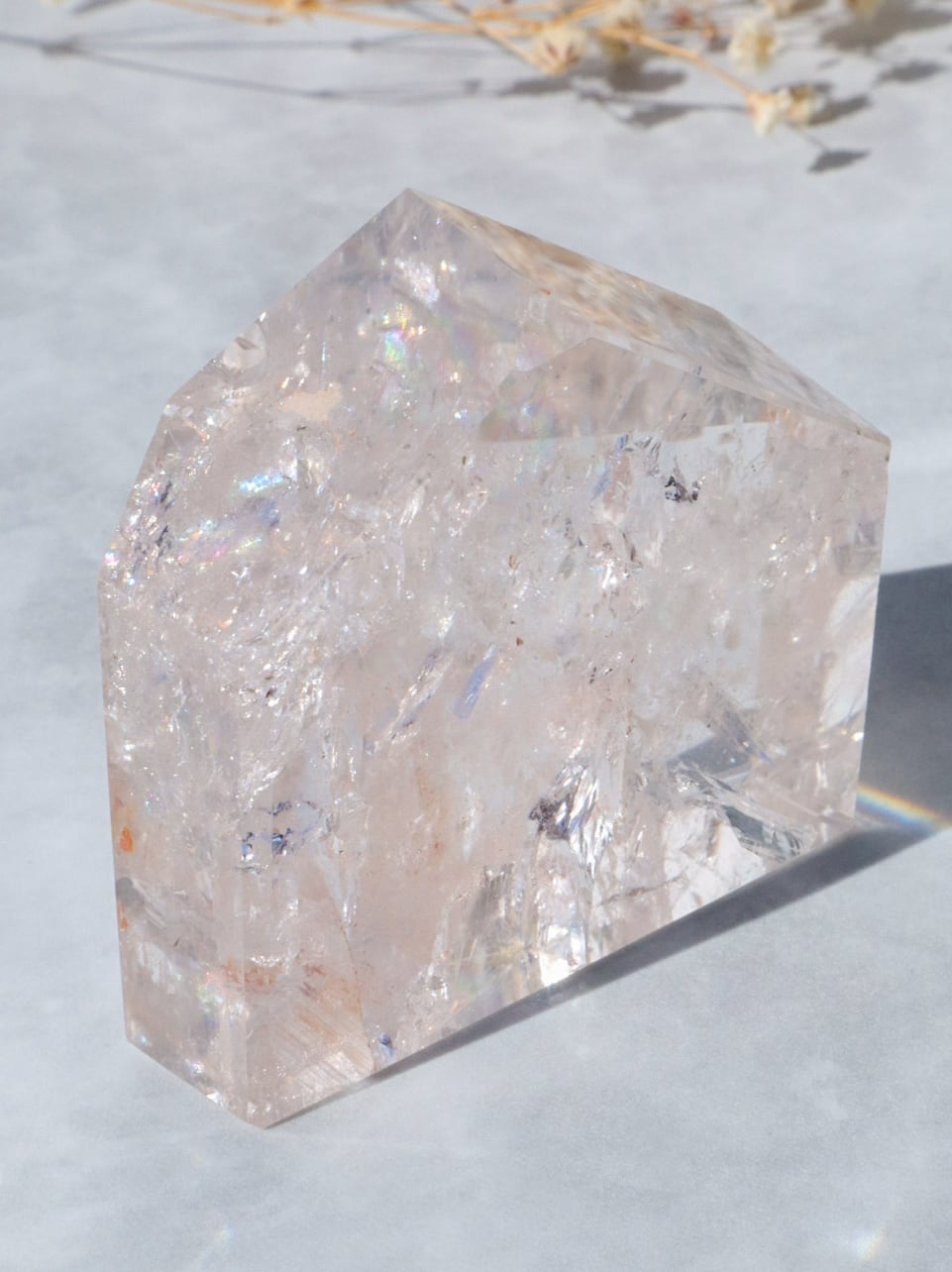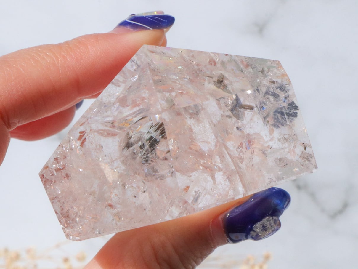 透明感と細かに散らばる虹がキラキラ光る、ピンクファイアーアゼツライトのフリーフォームのご紹介です♡このこはピンクはかなり薄めです。動画のように白バックだとピンクがあるとわかります✨