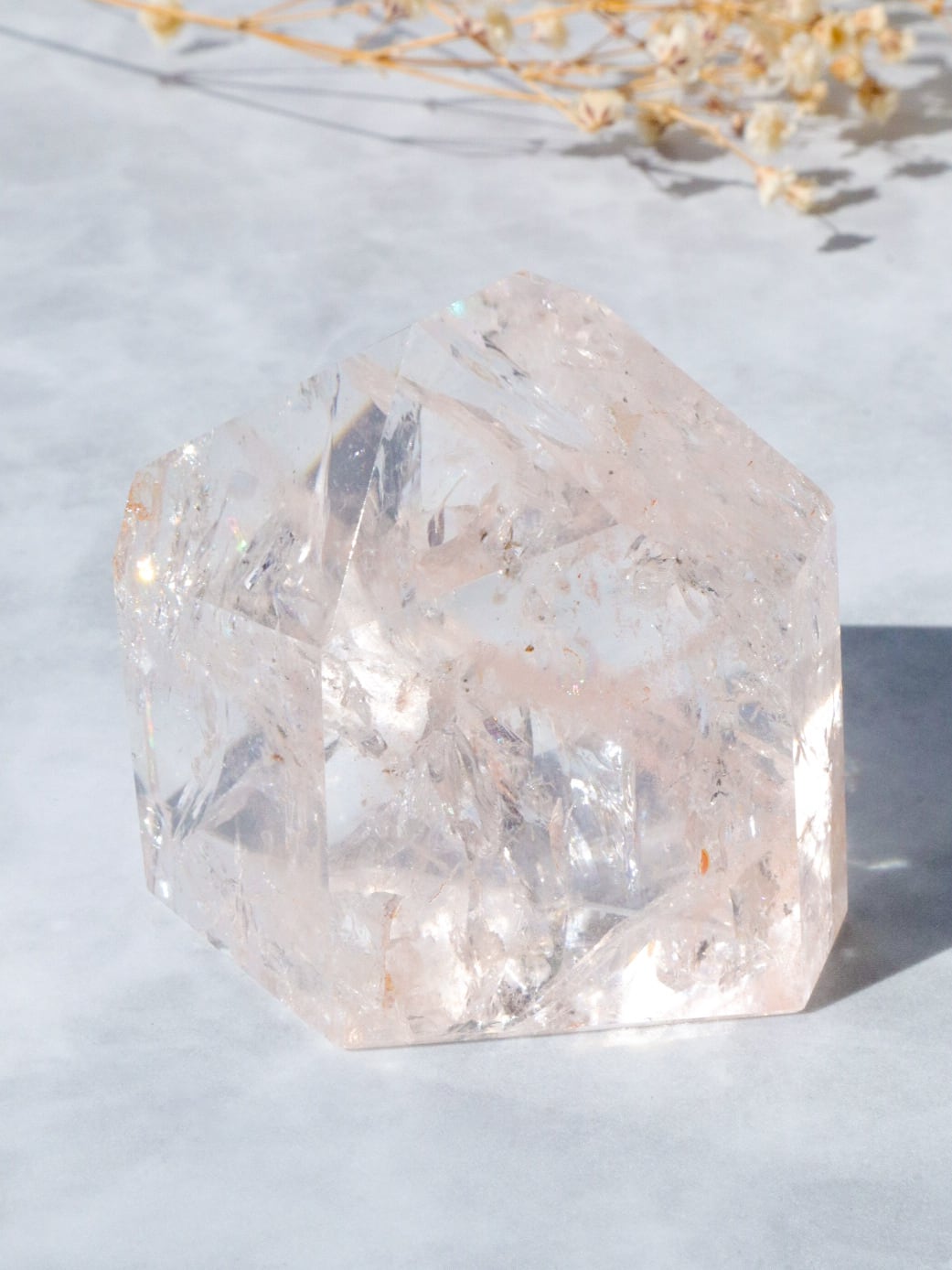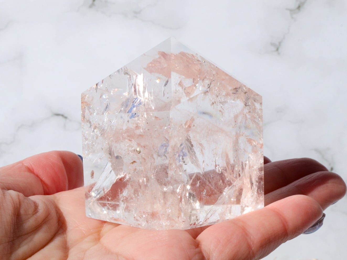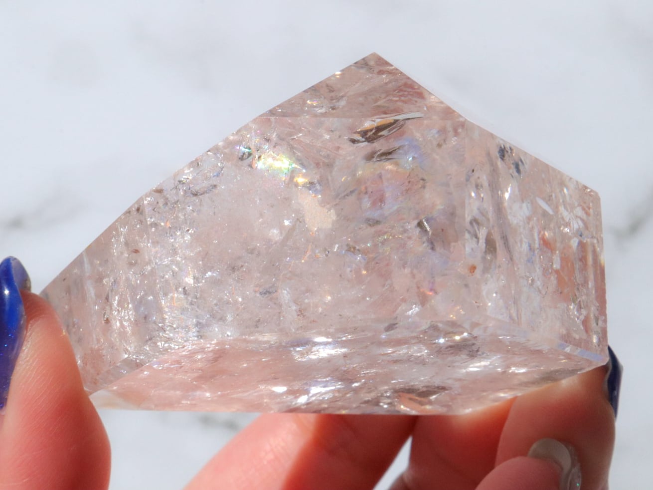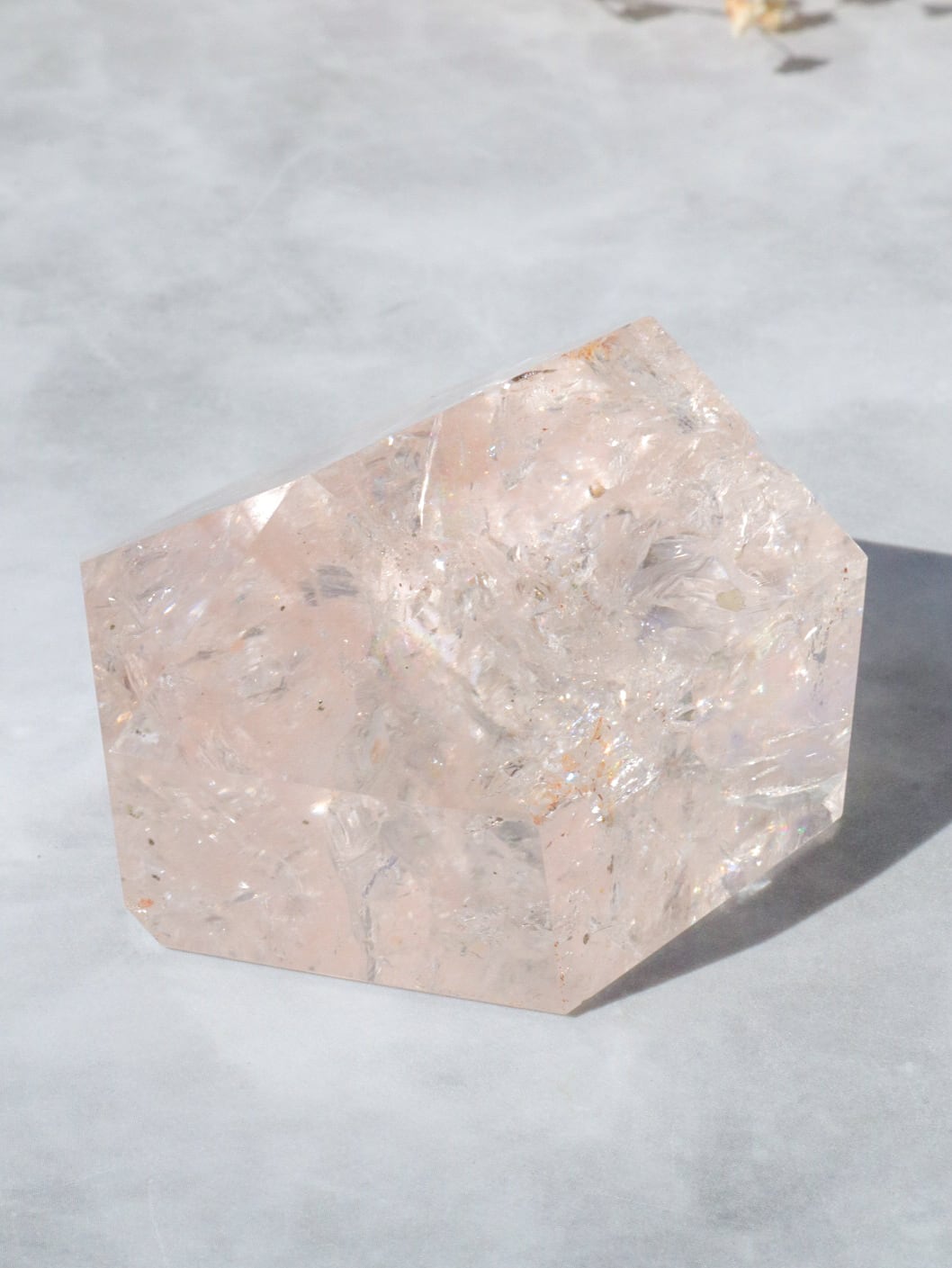 透明感と細かに散らばる虹がキラキラ光る、ピンクファイアーアゼツライトのフリーフォームのご紹介です♡このこはピンクはかなり薄めです。動画のように白バックだとピンクがあるとわかります✨