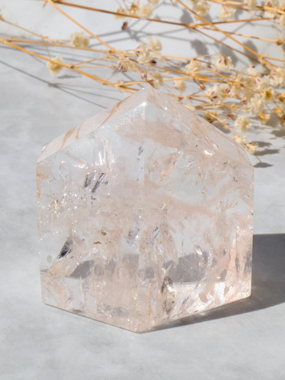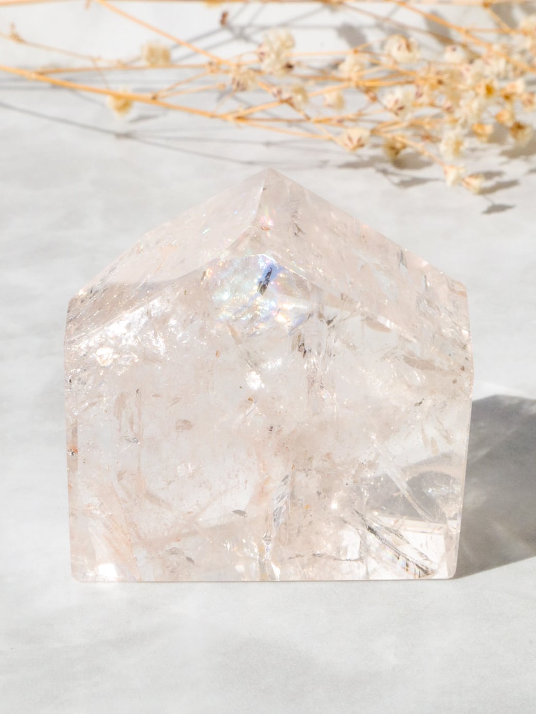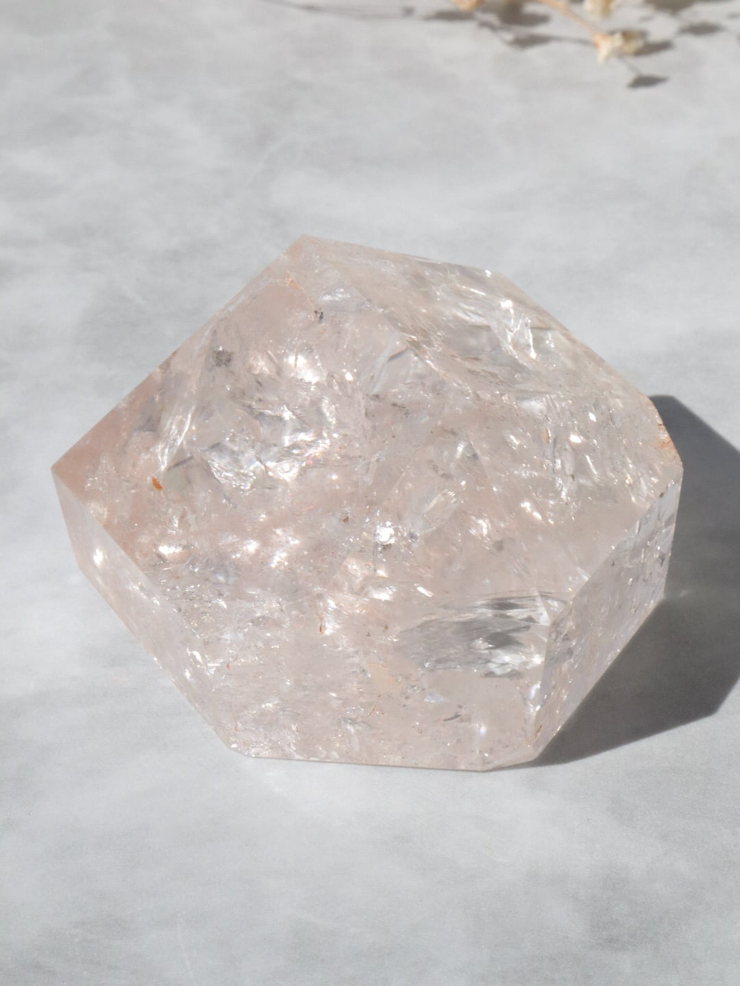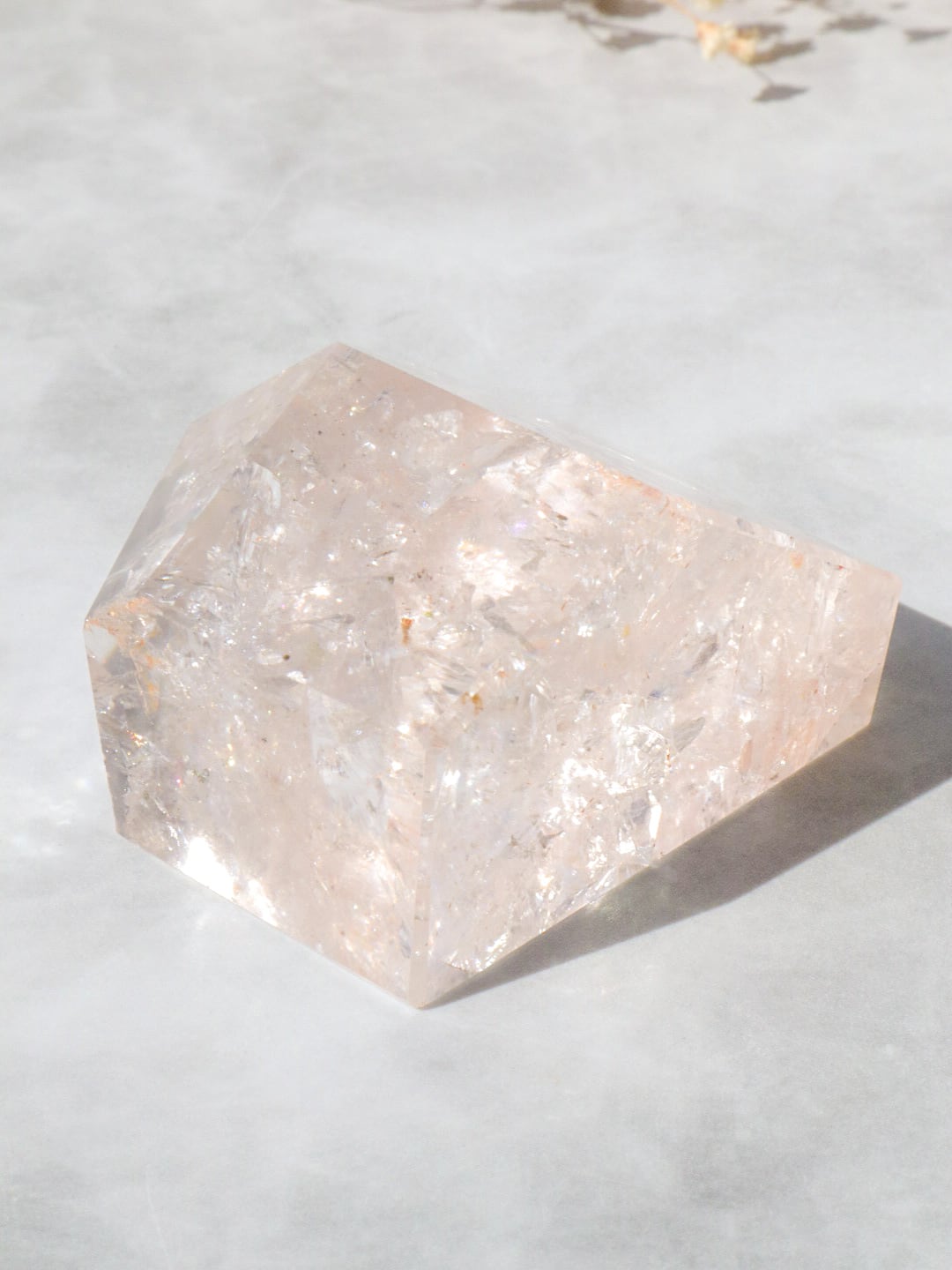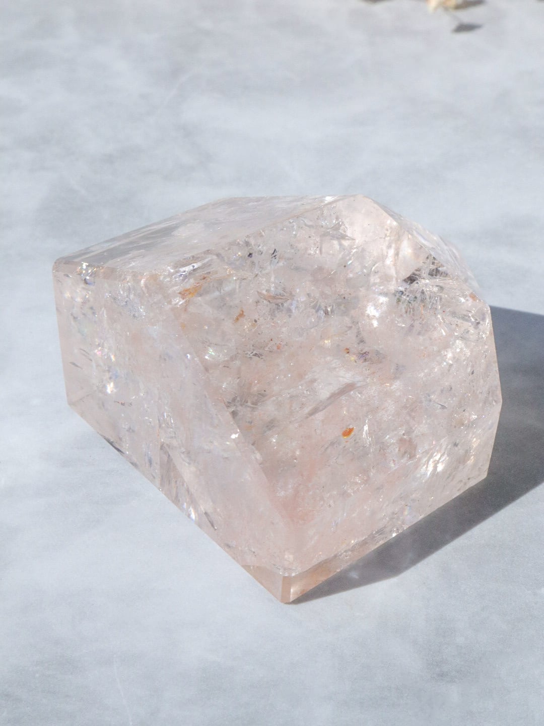 透明感と細かに散らばる虹がキラキラ光る、ピンクファイアーアゼツライトのフリーフォームのご紹介です♡このこはピンクはかなり薄めです。動画のように白バックだとピンクがあるとわかります✨