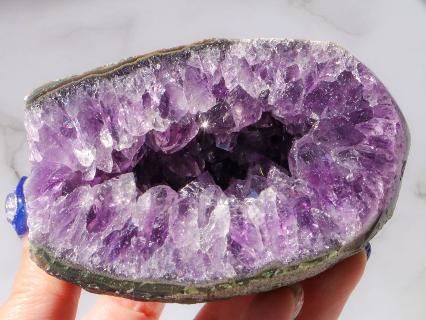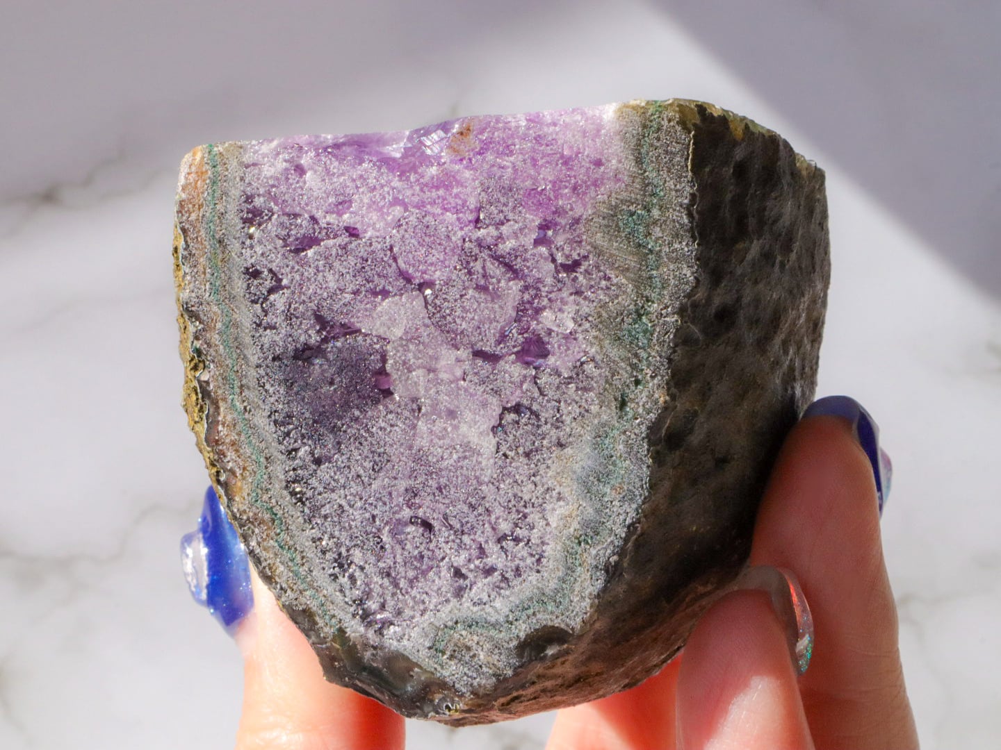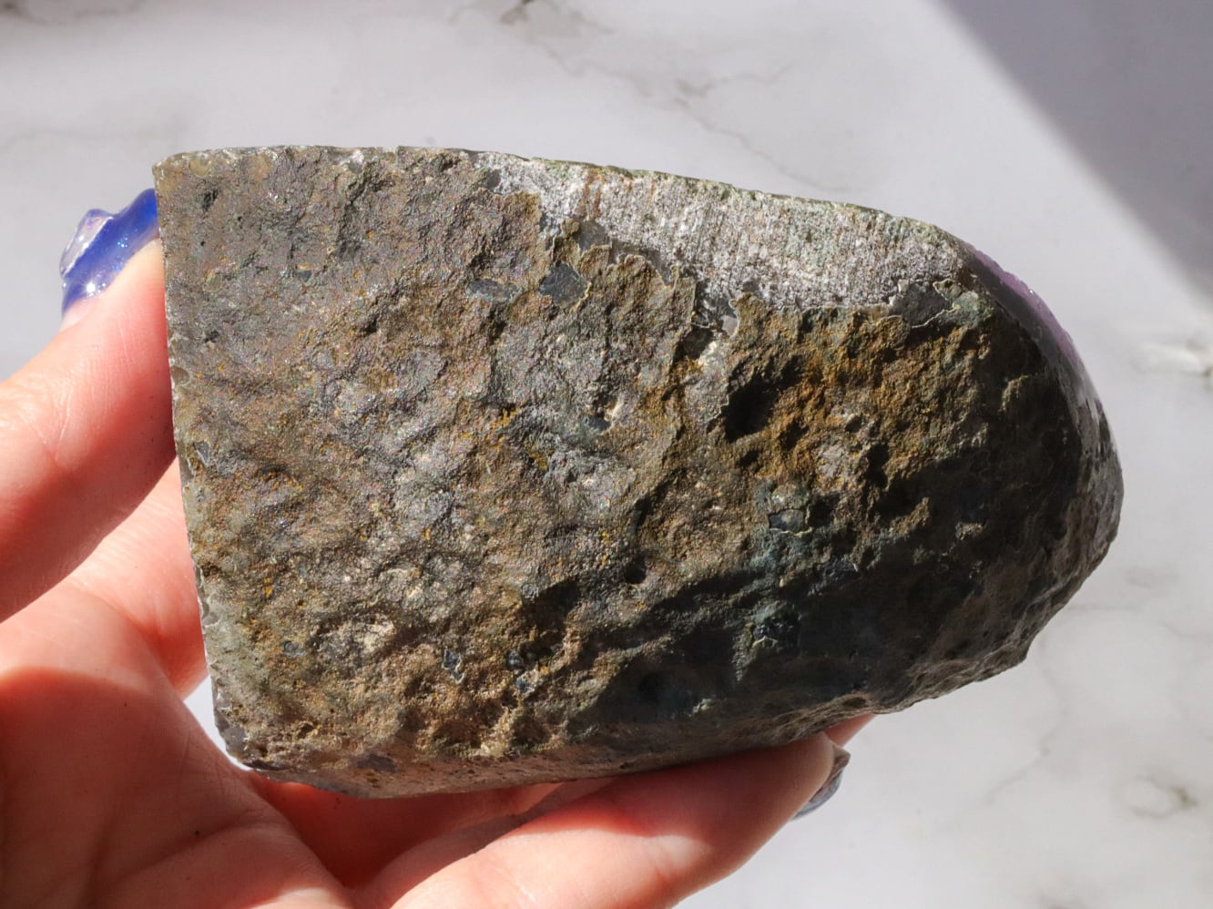 結晶は大きめで、断面はキラキラ✨まるで食べかけの果実のようです✨濃いめの紫に虹もいたるところでキラキラしたパワフルなエネルギーのこです(о´∀`о)✨