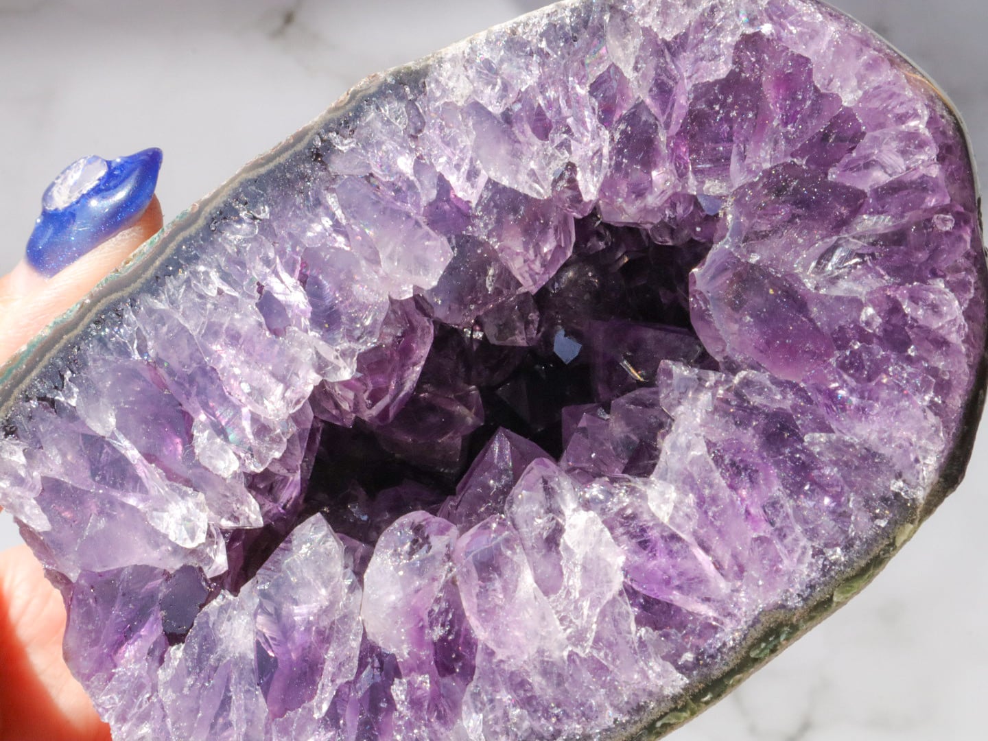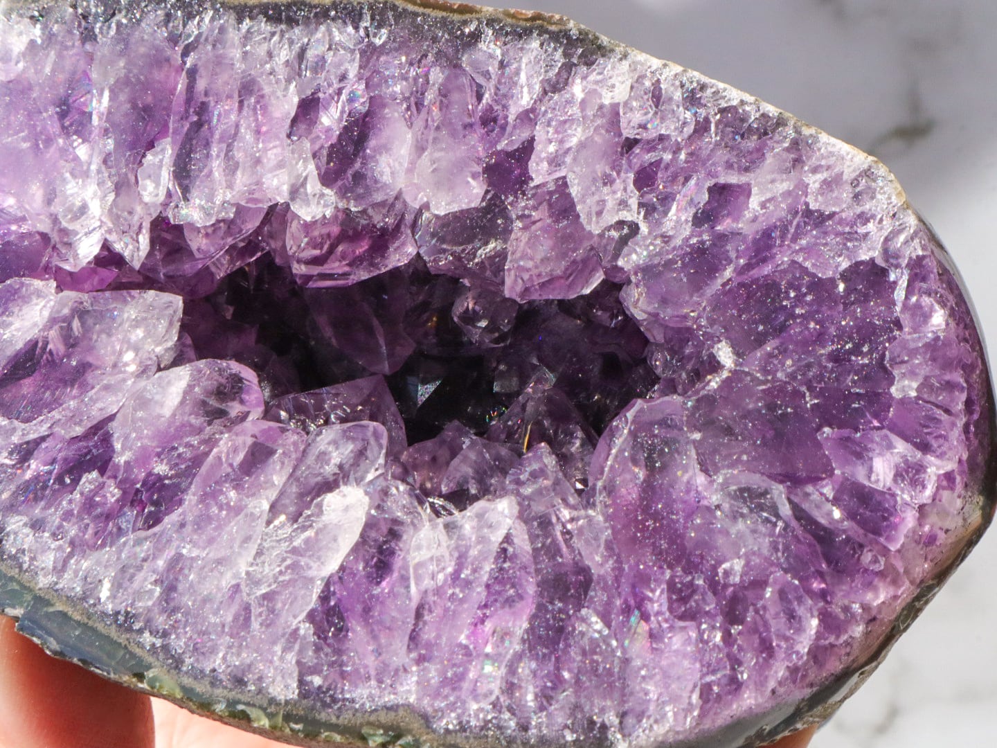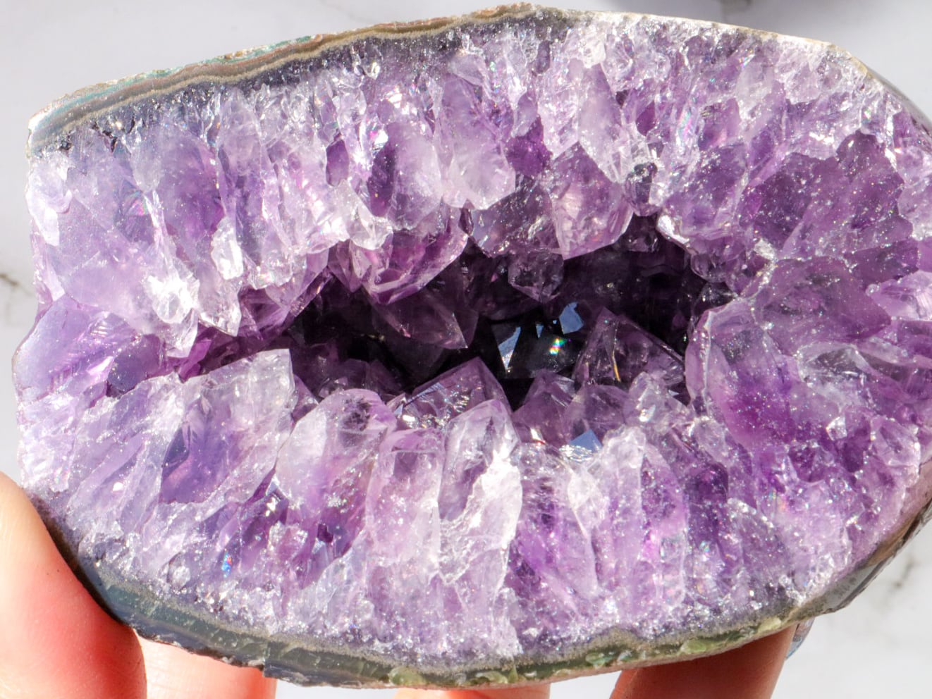 結晶は大きめで、断面はキラキラ✨まるで食べかけの果実のようです✨濃いめの紫に虹もいたるところでキラキラしたパワフルなエネルギーのこです(о´∀`о)✨