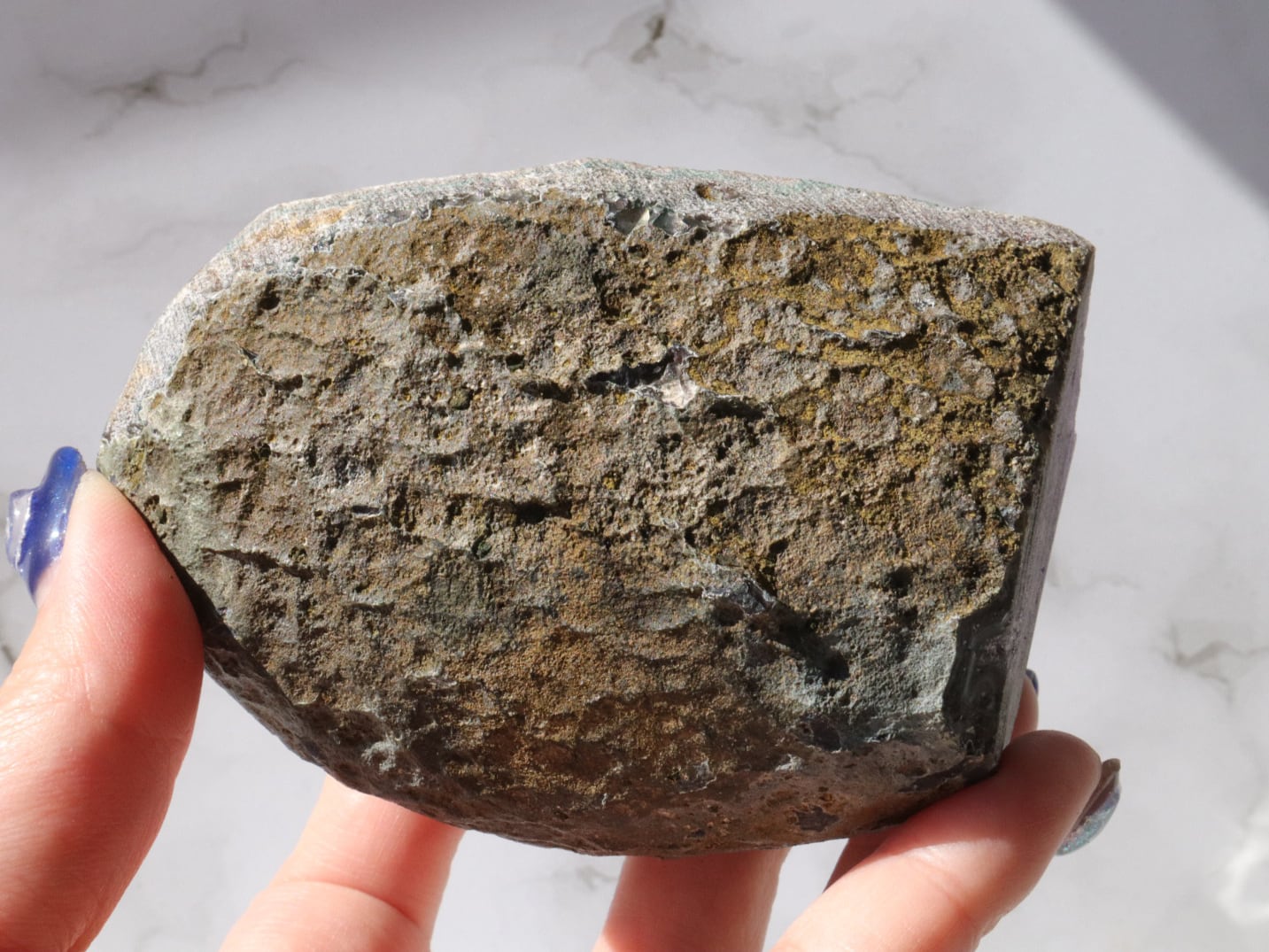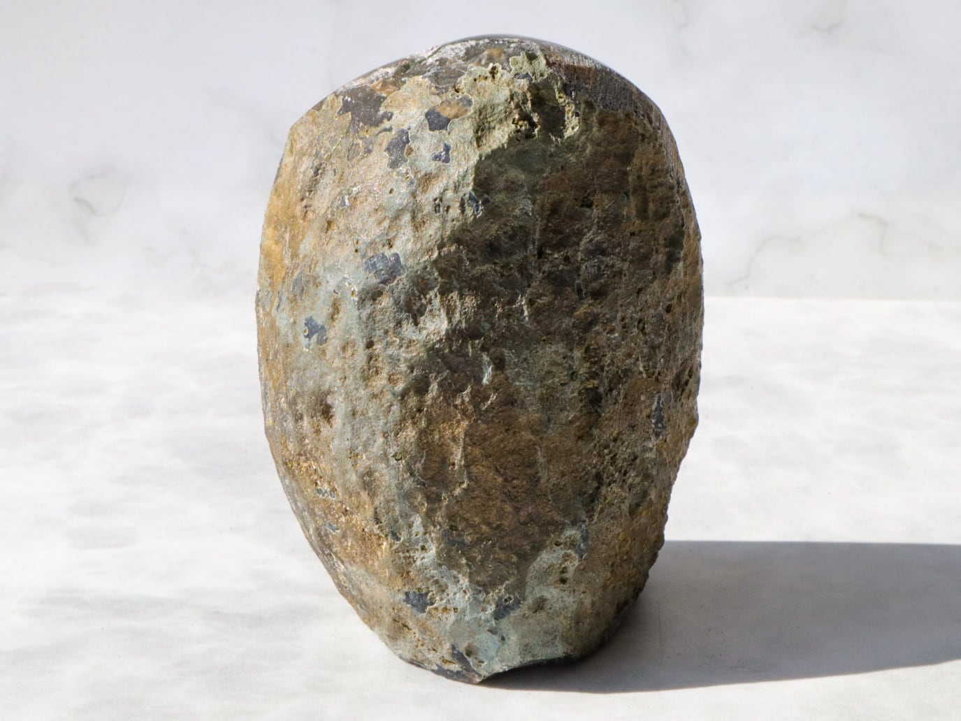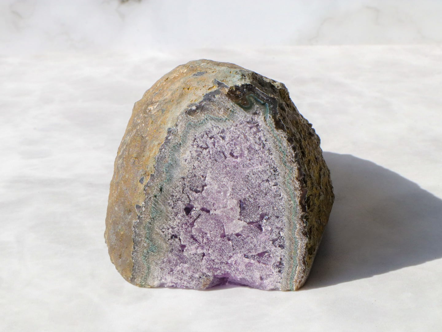 このこは、真ん中にジオード(結晶が形成された空洞)があり、まるで笑口のようですが、自立するこです✨飾る場合は不安定な場合もありますので、布を敷いた上でお皿などに乗せて頂くと安定しやすいです✨