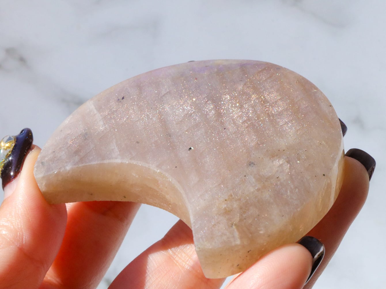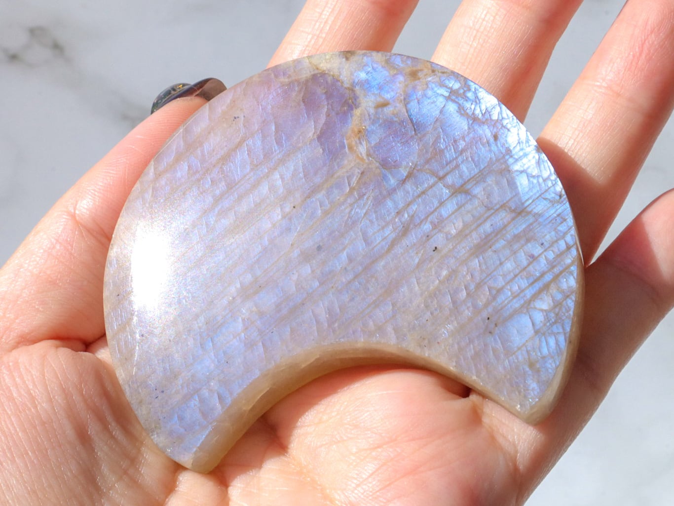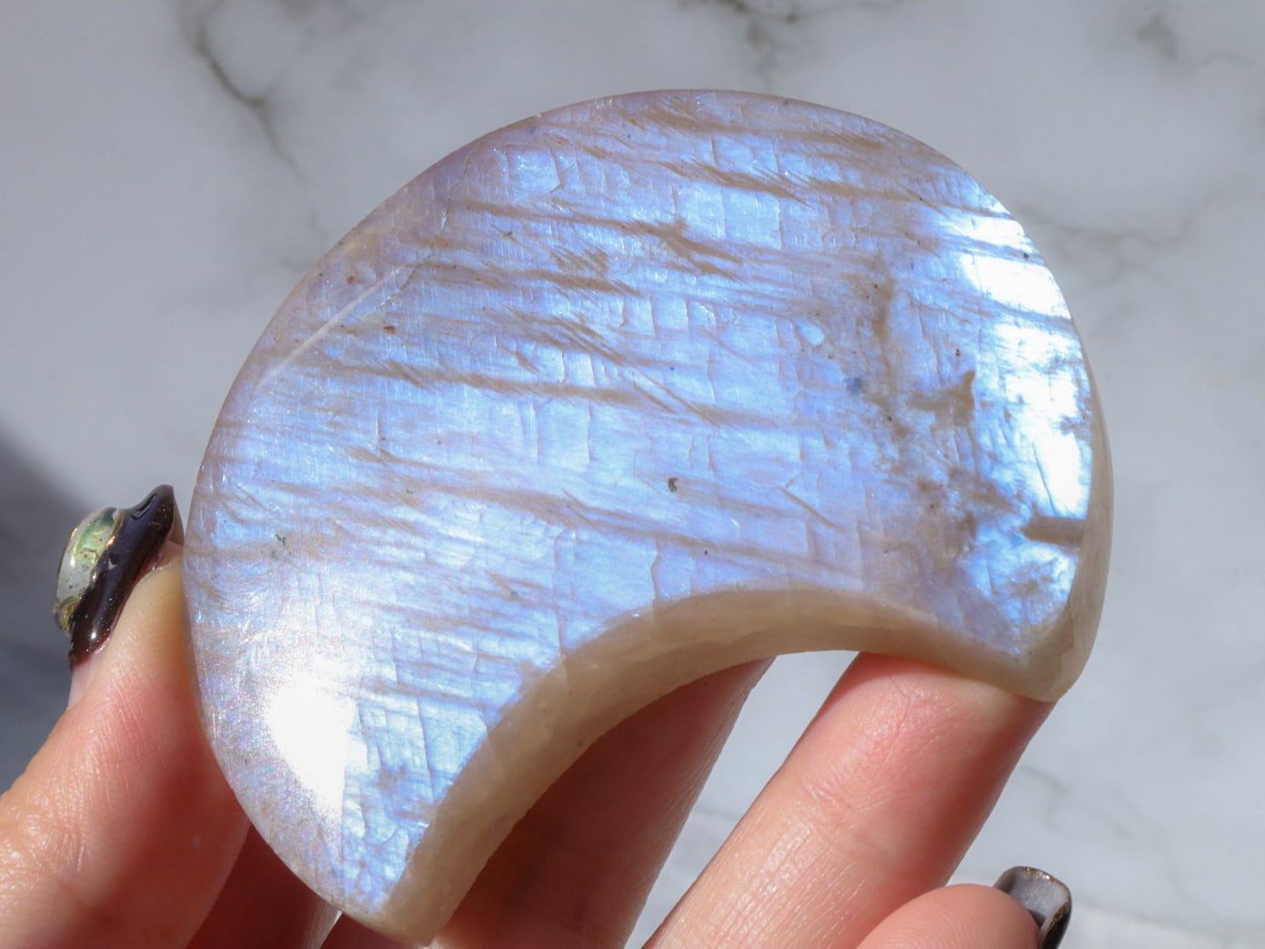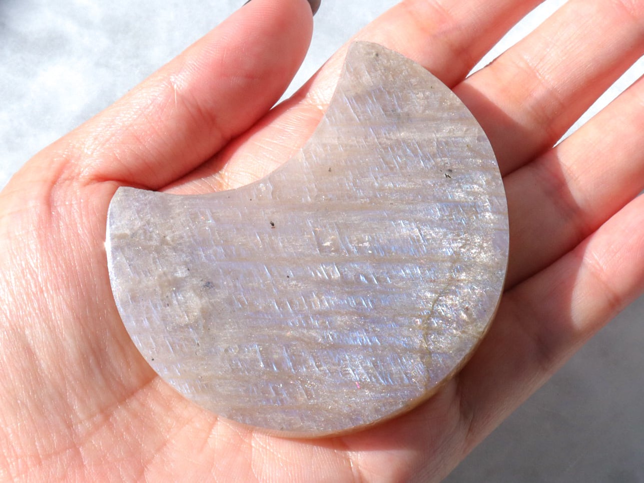 自然光と室内光だとまた違った良さを感じることが出来ます✨暗めの室内でムーンストーンにだけ光を当てるようにしてみると、余すところなくこのこの良さをご堪能出来ると思います♡ブルーシラー、虹シラー、アベンチュレッセンスが同時に楽しめて♡どこを見ていても美しいです♡♡♡まるっこい三日月型もかわよきです♡
