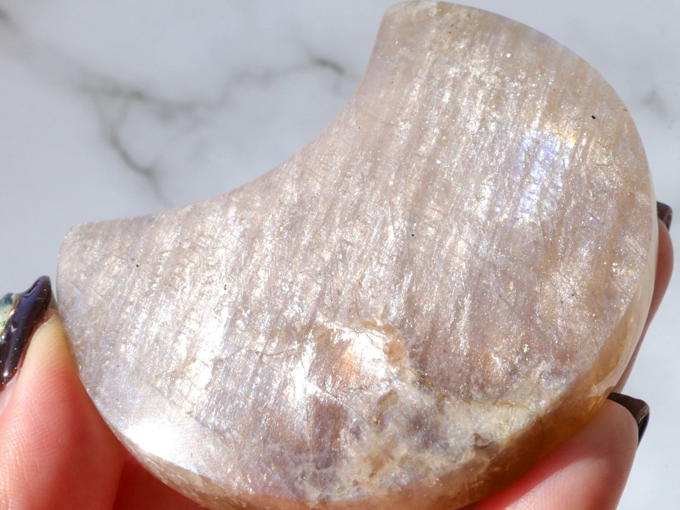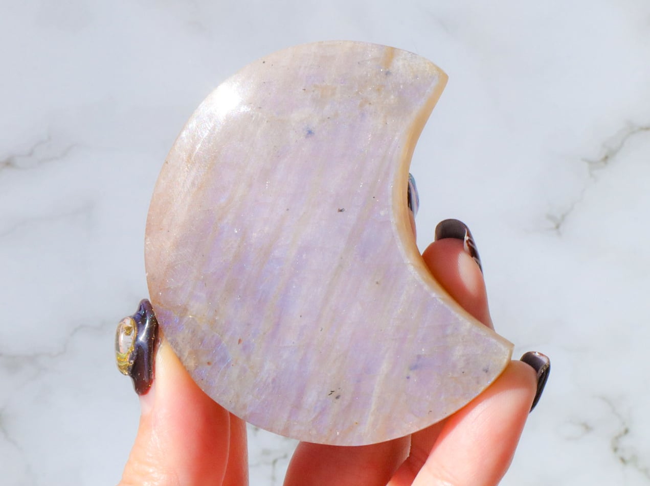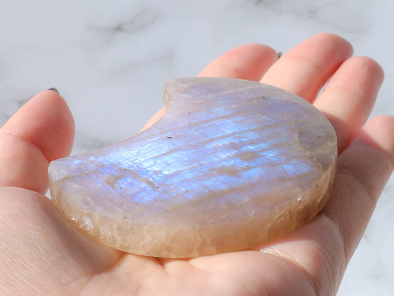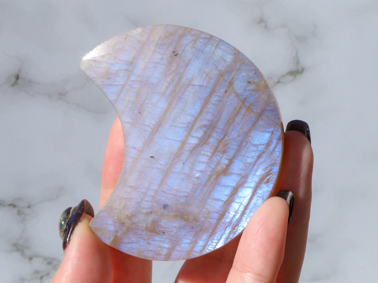 自然光と室内光だとまた違った良さを感じることが出来ます✨暗めの室内でムーンストーンにだけ光を当てるようにしてみると、余すところなくこのこの良さをご堪能出来ると思います♡ブルーシラー、虹シラー、アベンチュレッセンスが同時に楽しめて♡どこを見ていても美しいです♡♡♡まるっこい三日月型もかわよきです♡