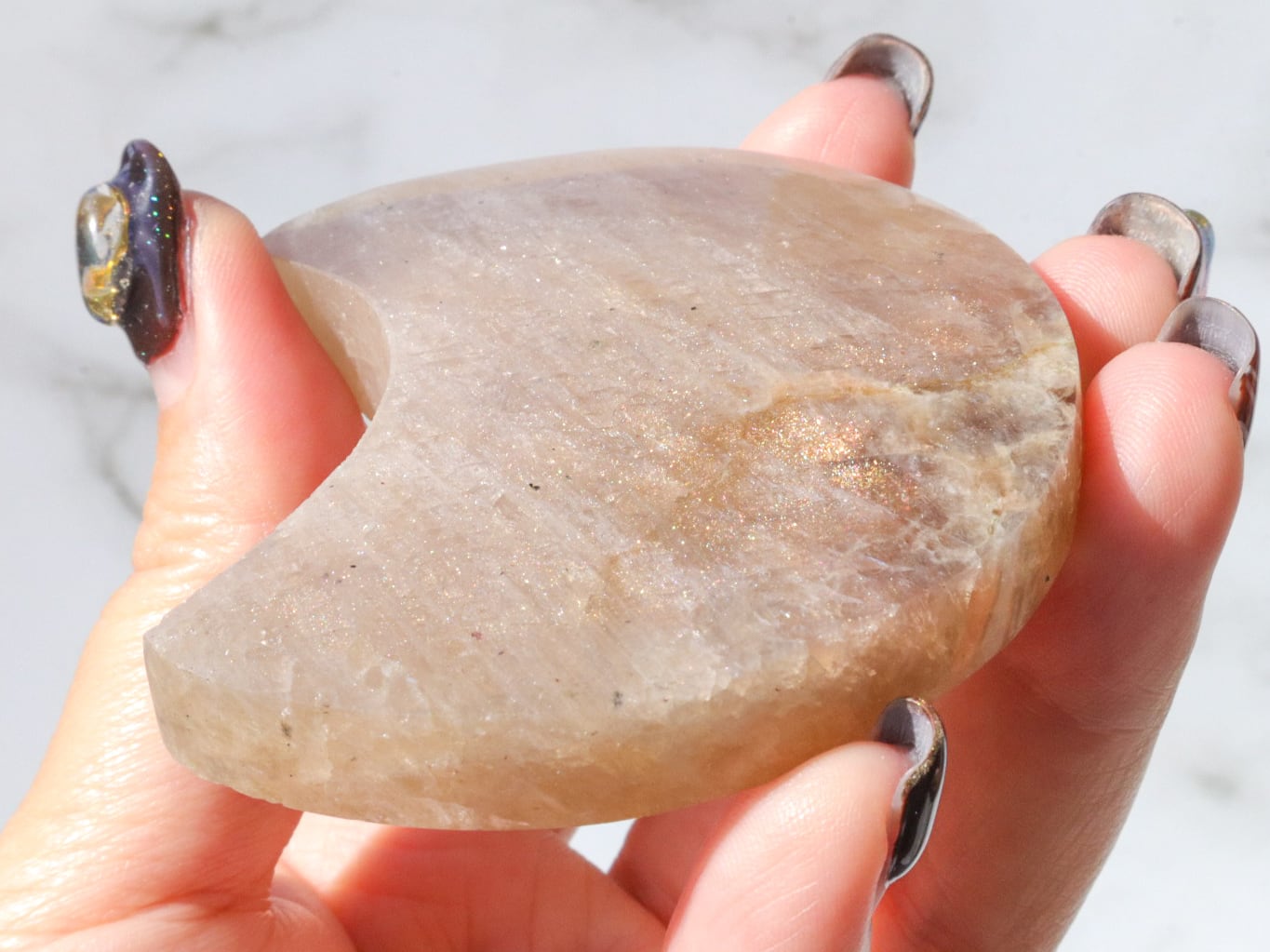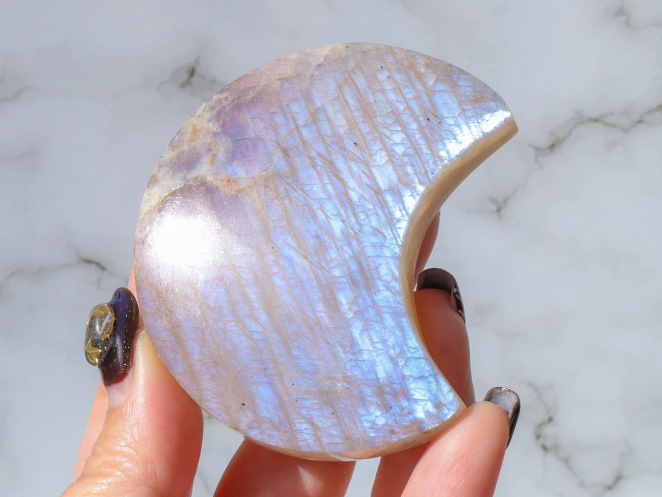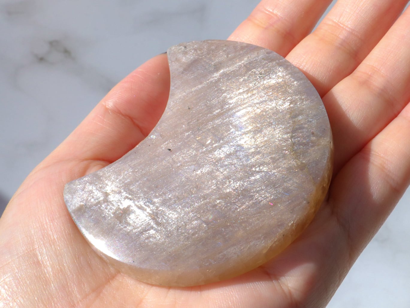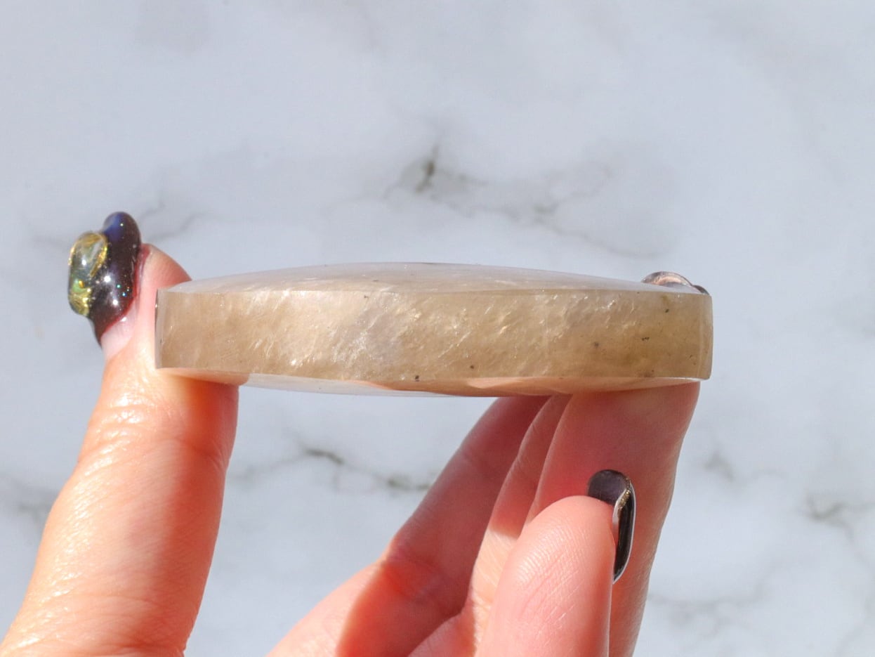 自然光と室内光だとまた違った良さを感じることが出来ます✨暗めの室内でムーンストーンにだけ光を当てるようにしてみると、余すところなくこのこの良さをご堪能出来ると思います♡ブルーシラー、虹シラー、アベンチュレッセンスが同時に楽しめて♡どこを見ていても美しいです♡♡♡まるっこい三日月型もかわよきです♡