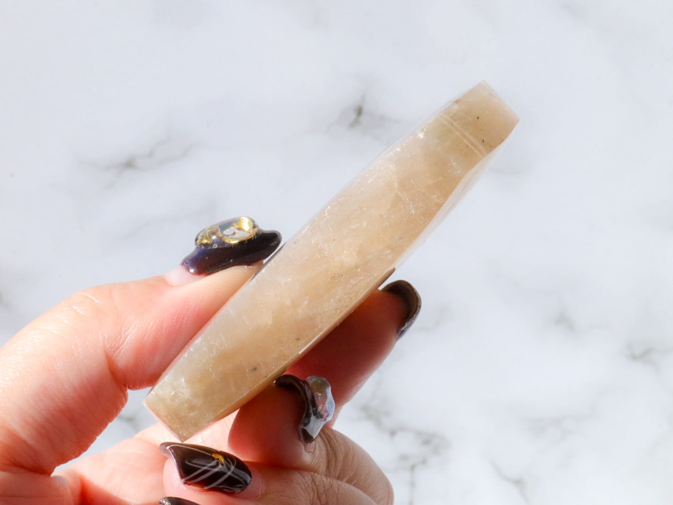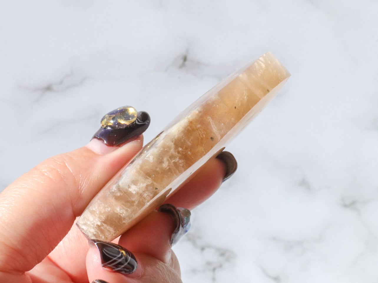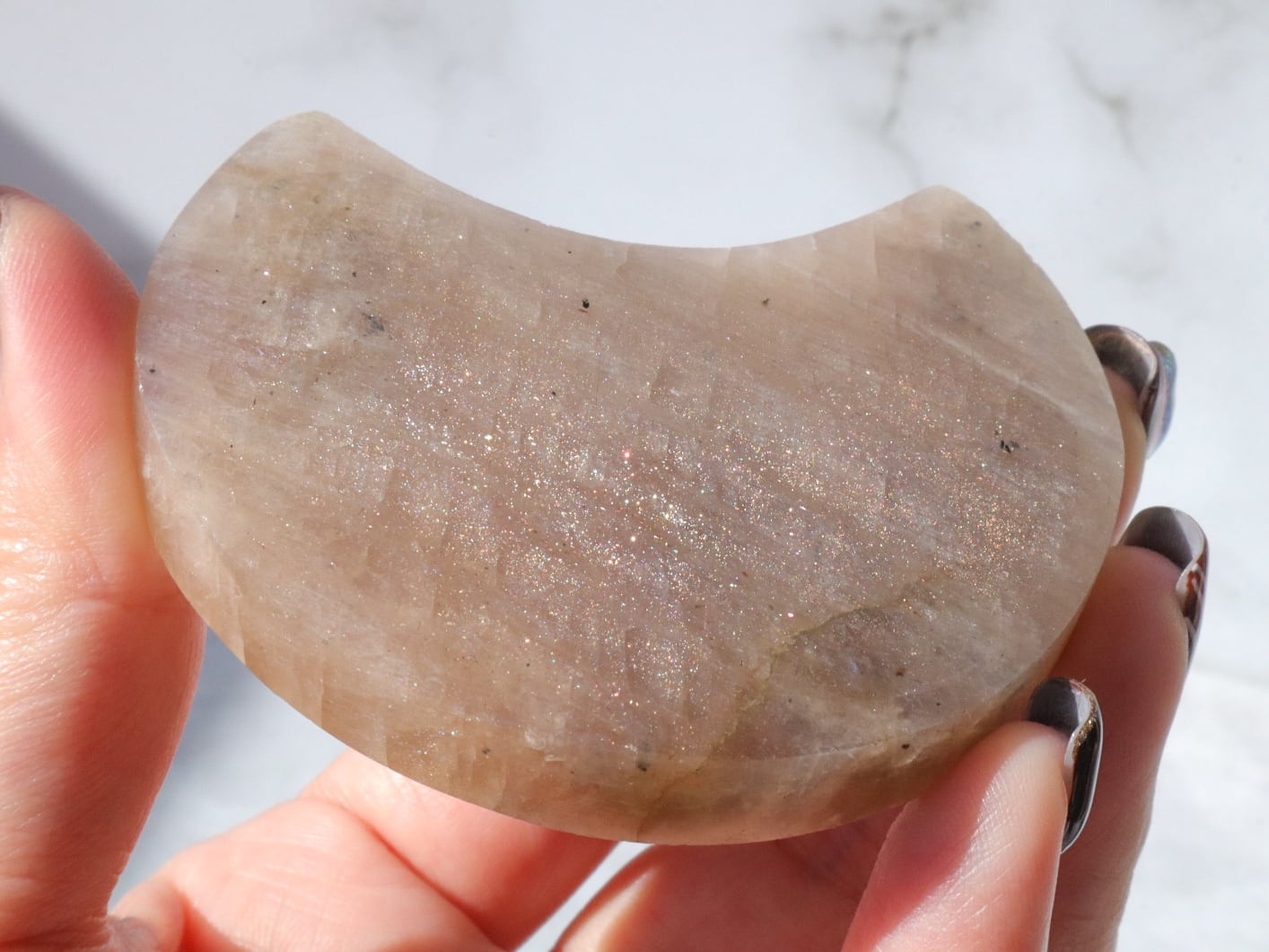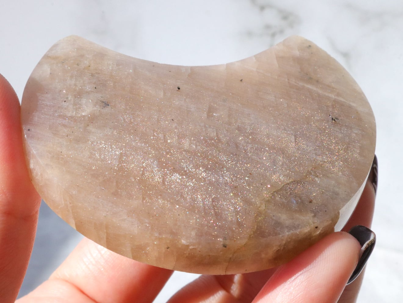 自然光と室内光だとまた違った良さを感じることが出来ます✨暗めの室内でムーンストーンにだけ光を当てるようにしてみると、余すところなくこのこの良さをご堪能出来ると思います♡ブルーシラー、虹シラー、アベンチュレッセンスが同時に楽しめて♡どこを見ていても美しいです♡♡♡まるっこい三日月型もかわよきです♡