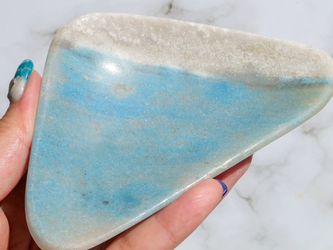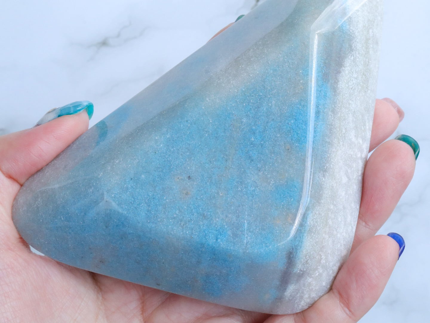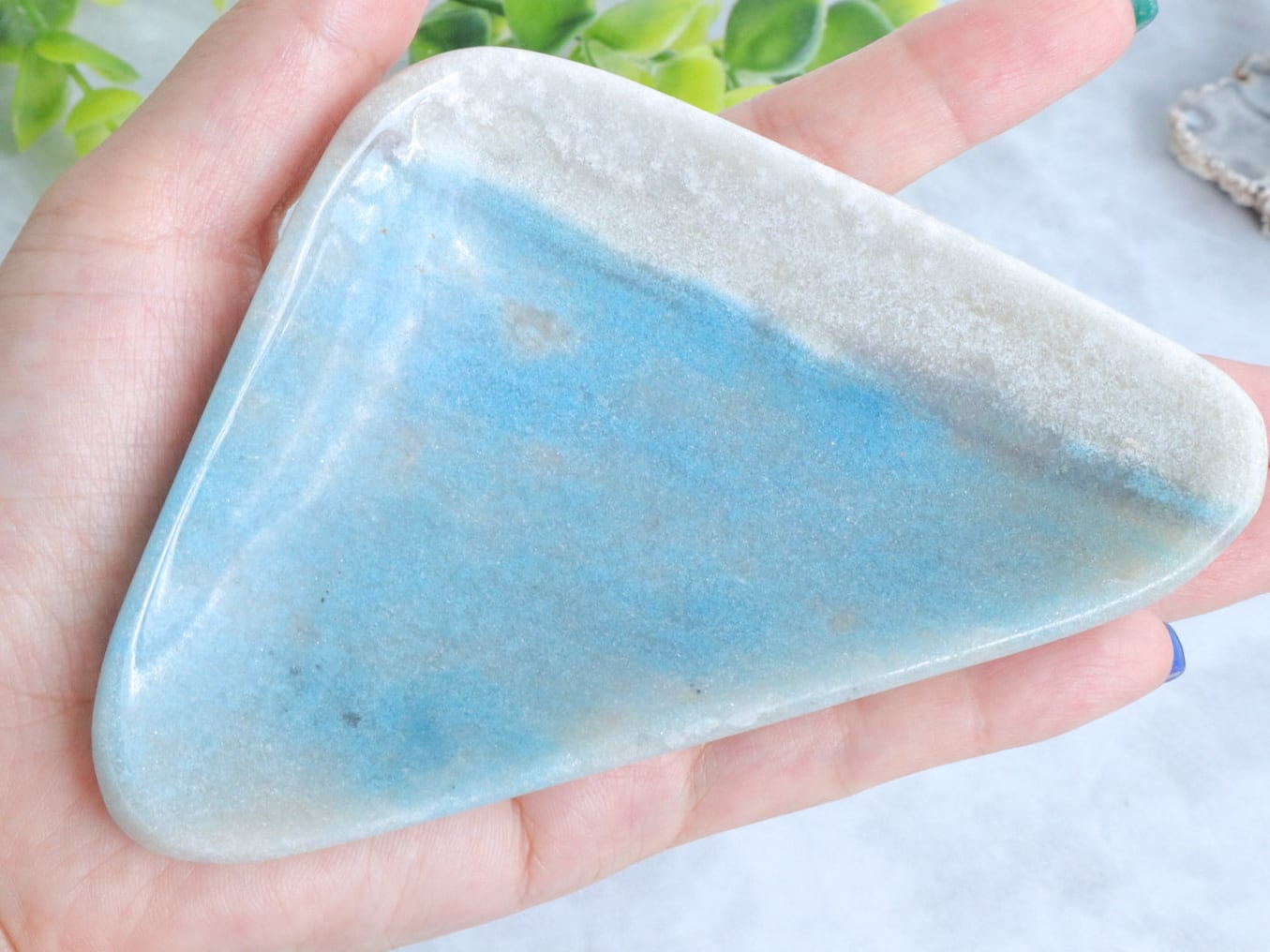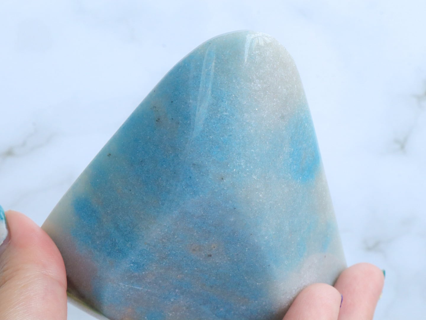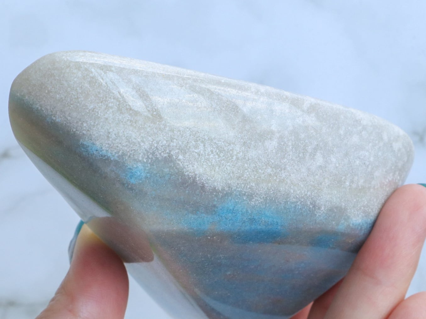 淡いブルーであっても、どことなくくすみを感じる優しい色合いで、なんとも不思議な神秘的な魅力があり、癒しを感じる人も多く、近年とても人気が出てきた石です♡