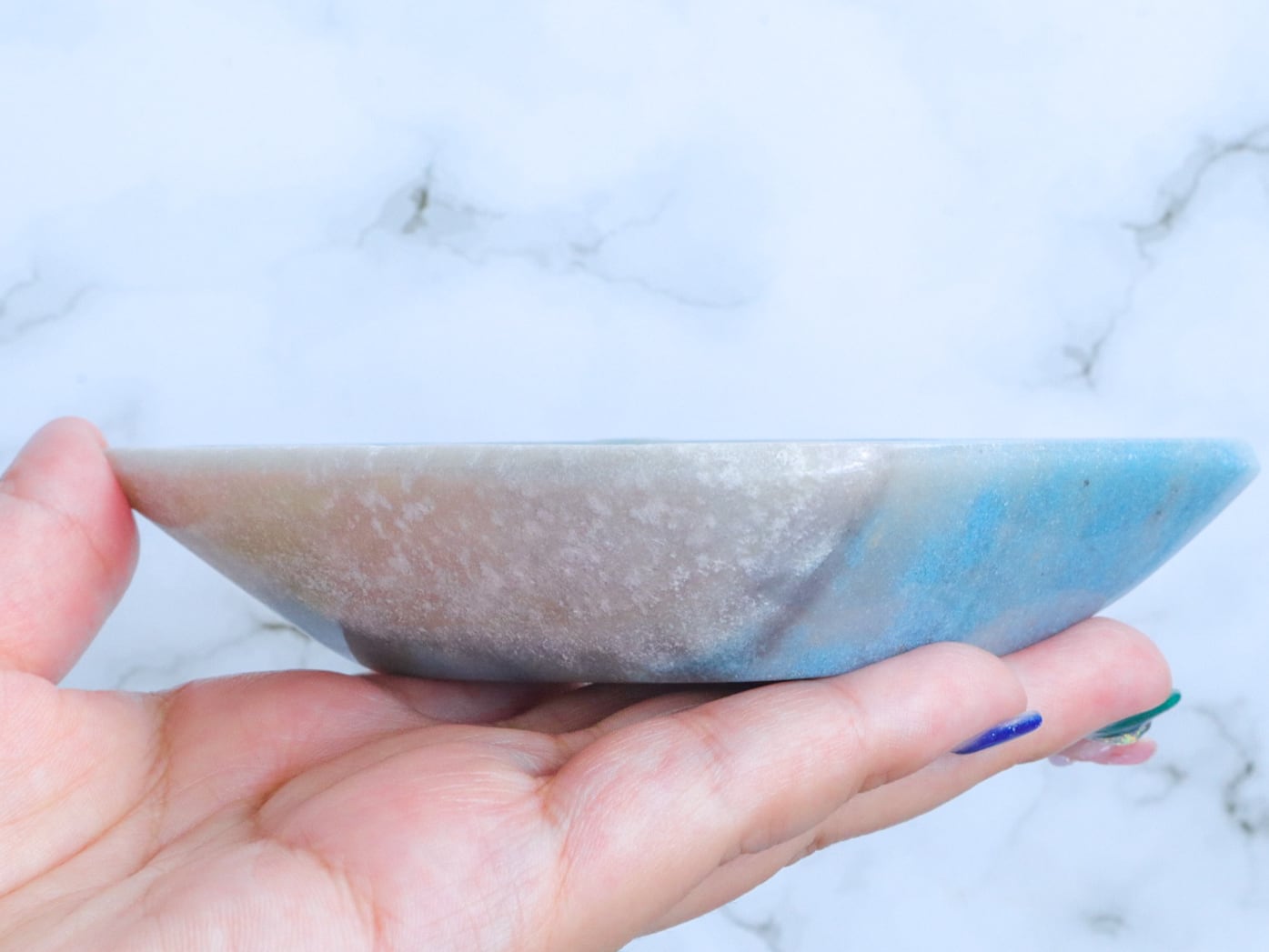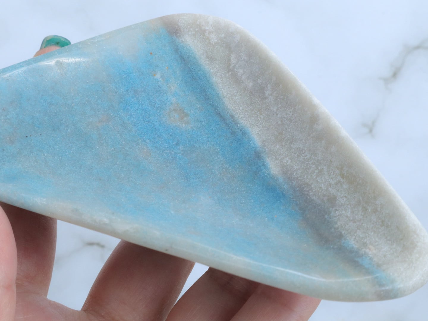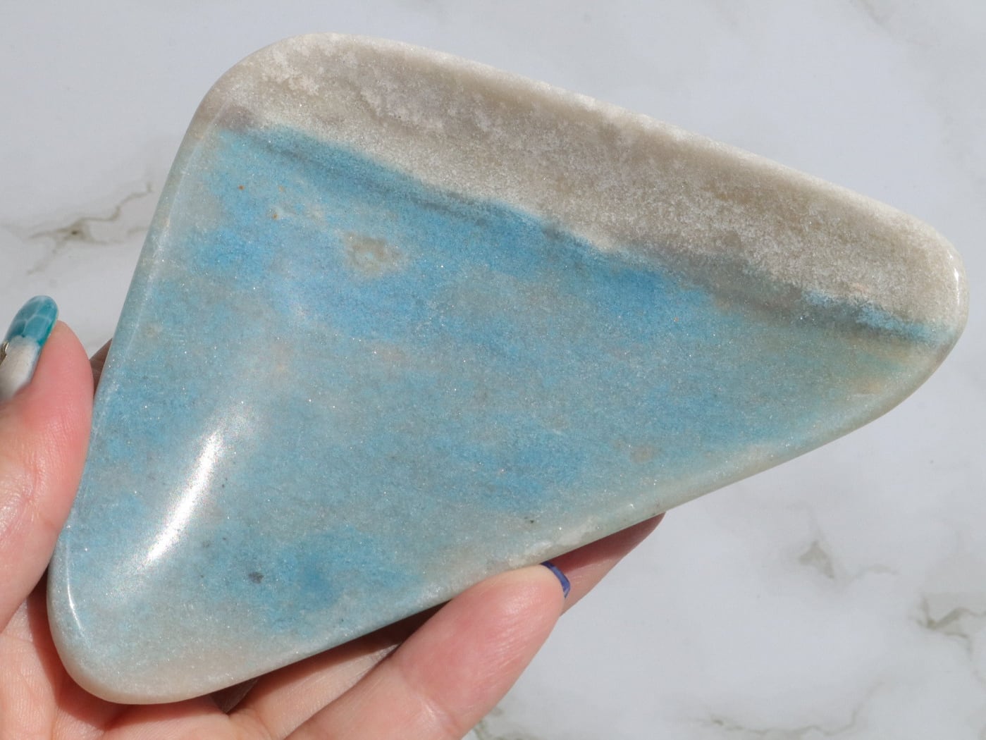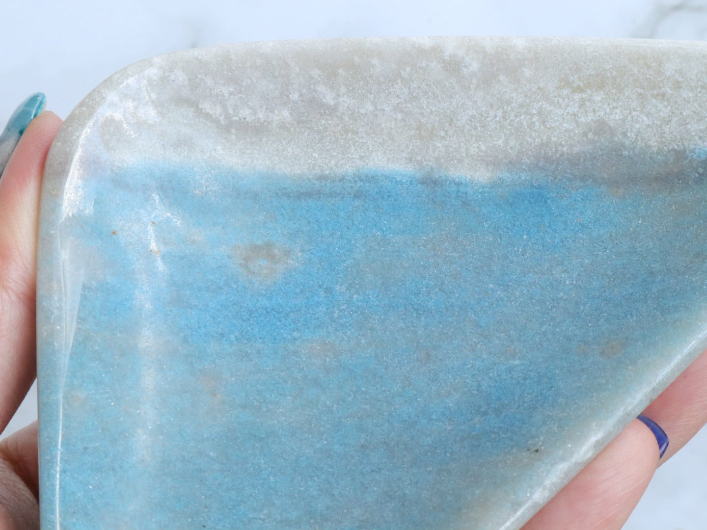 淡いブルーであっても、どことなくくすみを感じる優しい色合いで、なんとも不思議な神秘的な魅力があり、癒しを感じる人も多く、近年とても人気が出てきた石です♡