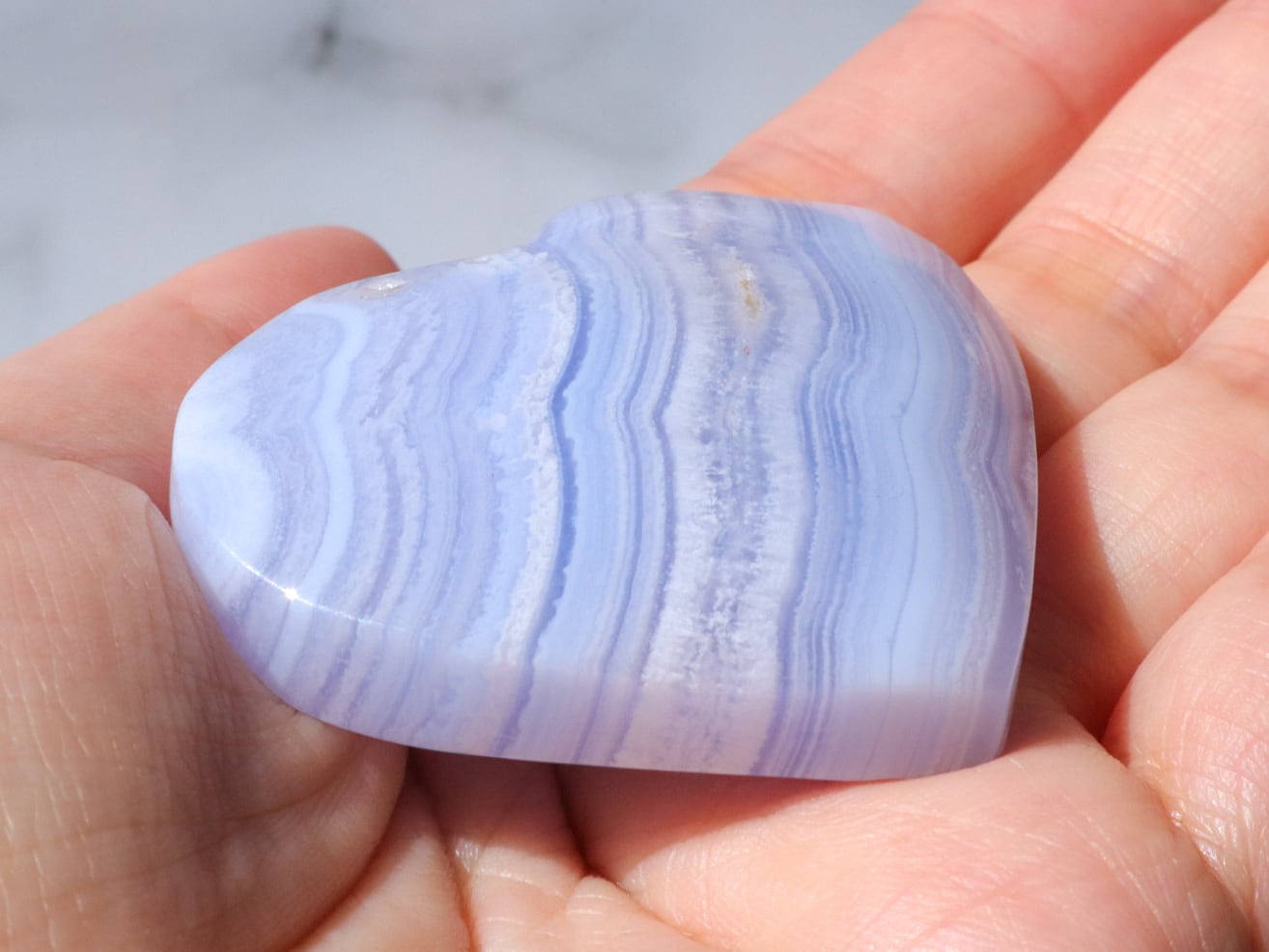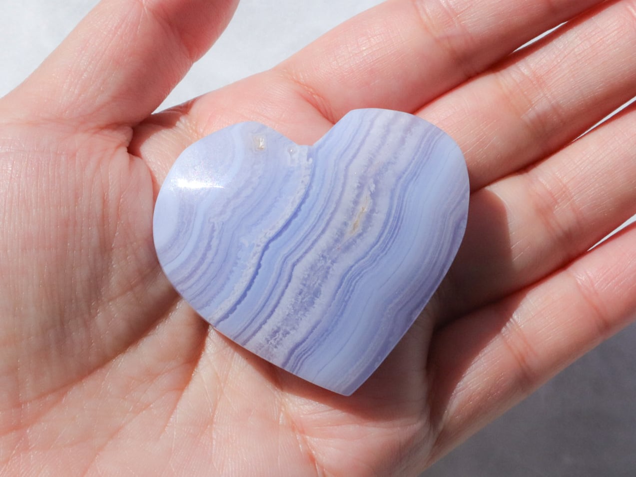 ブルーレースアゲートは和名を空色縞瑪瑙(そらいろしまめのう)と言います。その名の通り、水色の瑪瑙に縞模様が入ったものをブルーレース(またはブルーレースアゲート)と呼びます。淡い水色や白色が層状に重なって、まるでレースのように見えることからこの名が付けられました♡