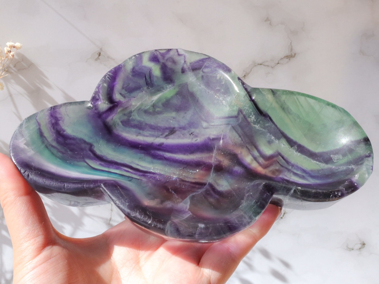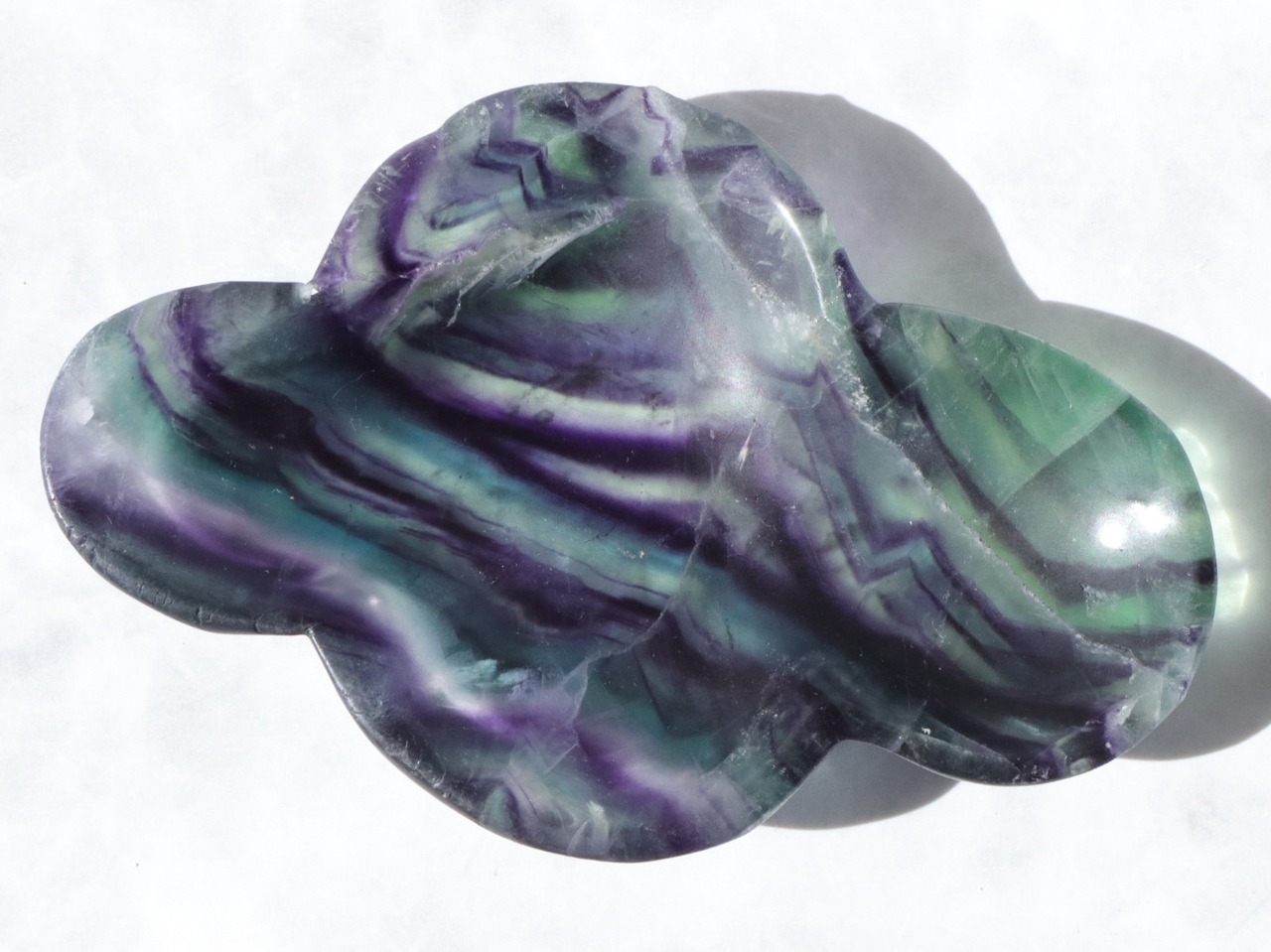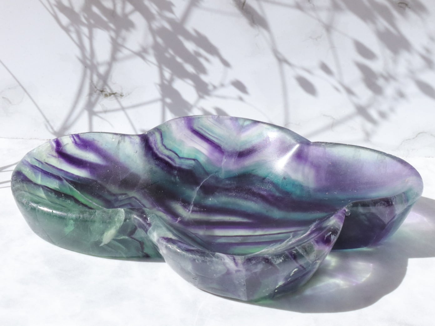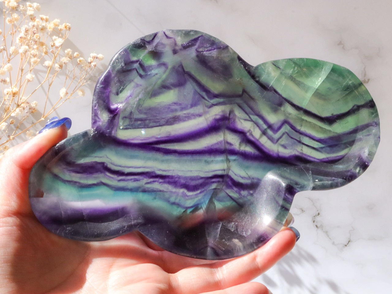 ブルー、グリーン、パープルの芸術的なストライプ柄が美しいフローライトのボウルをご紹介します♡♡♡そこまで深い器ではないですが、動画にもあるように、面積が大きいので、タンブルが10個以上は乗りますから、かなり幅広い用途にお使い頂けると思います♡✨