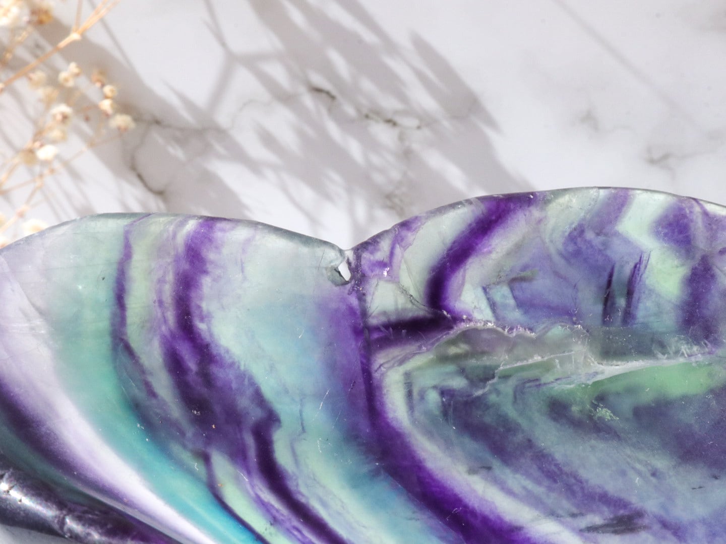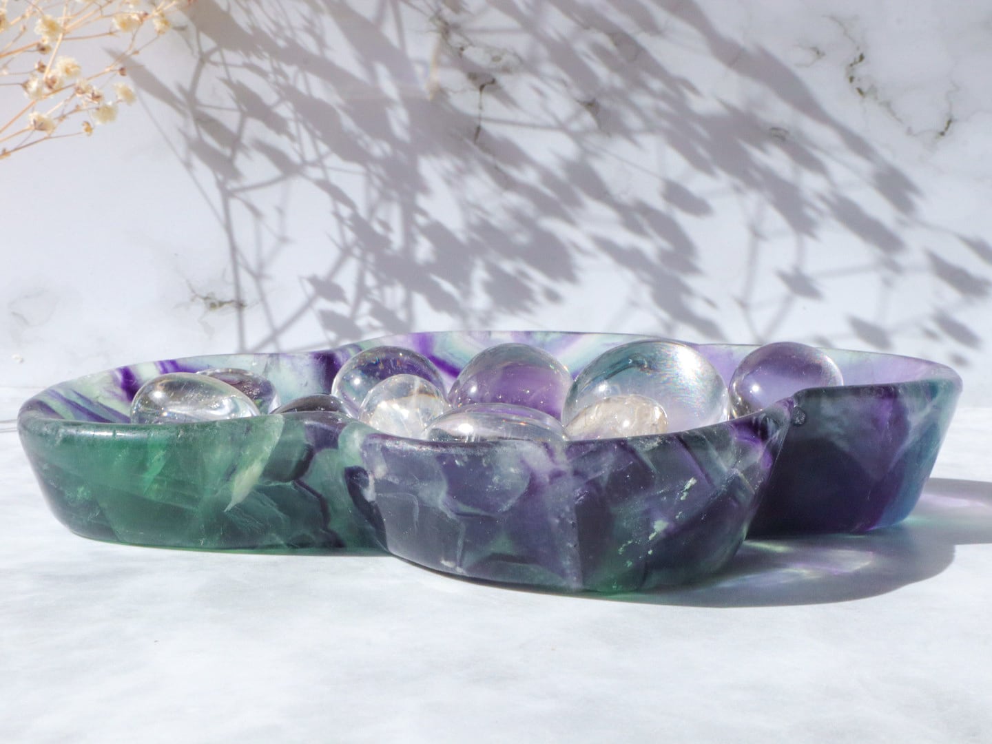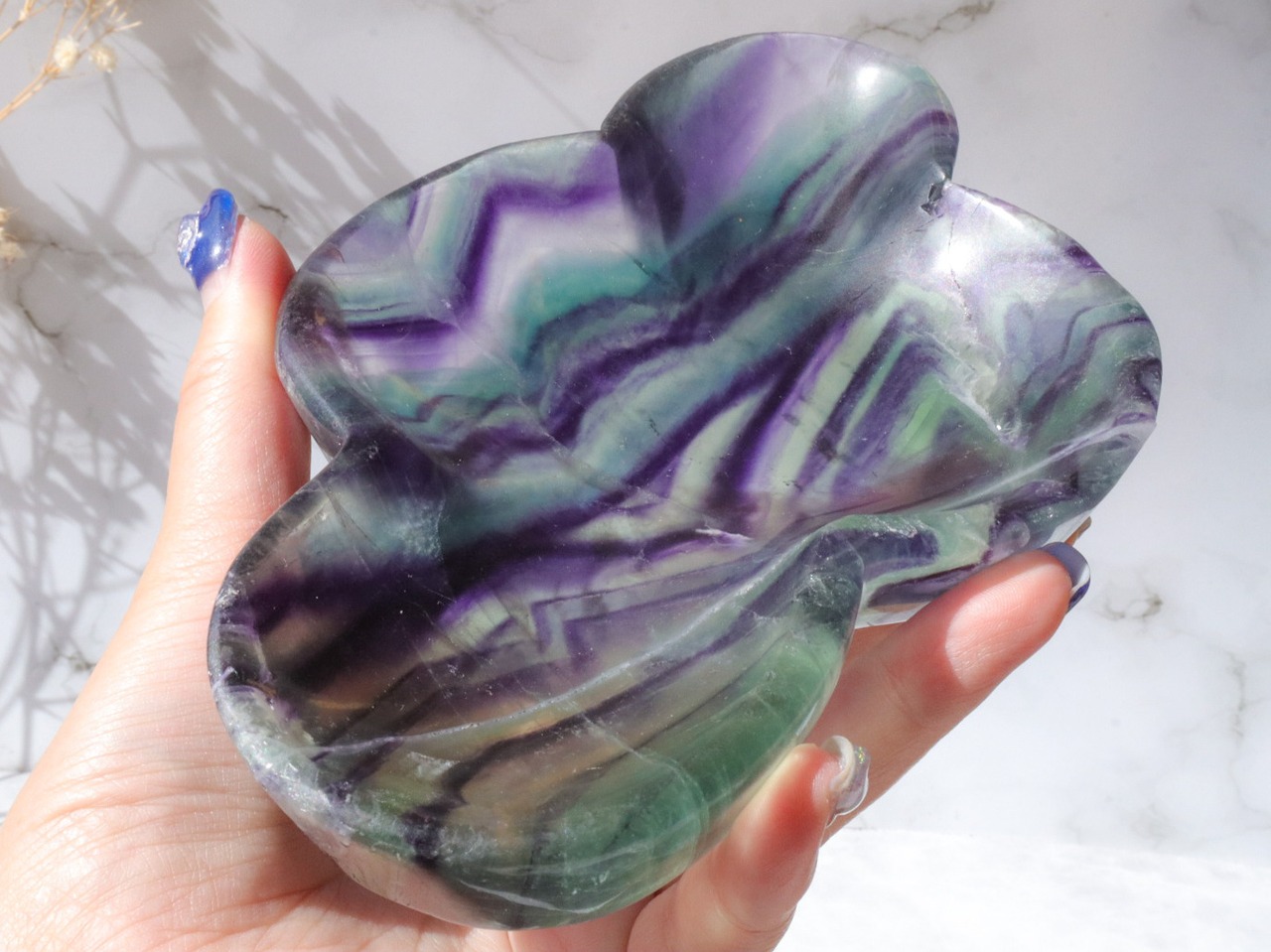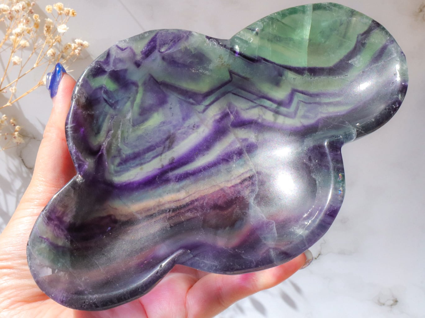 ブルー、グリーン、パープルの芸術的なストライプ柄が美しいフローライトのボウルをご紹介します♡♡♡そこまで深い器ではないですが、動画にもあるように、面積が大きいので、タンブルが10個以上は乗りますから、かなり幅広い用途にお使い頂けると思います♡✨