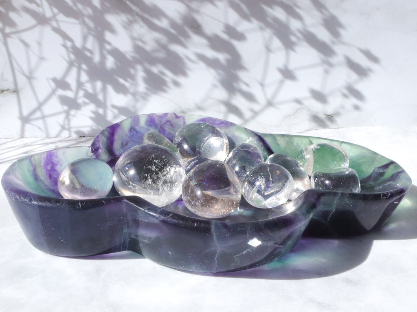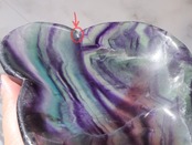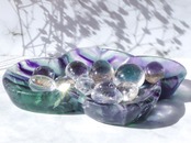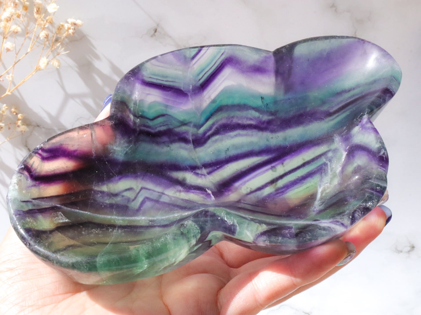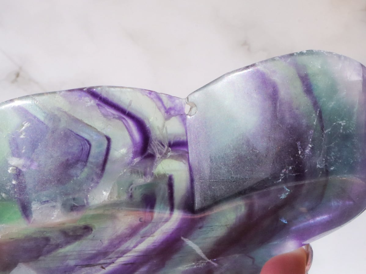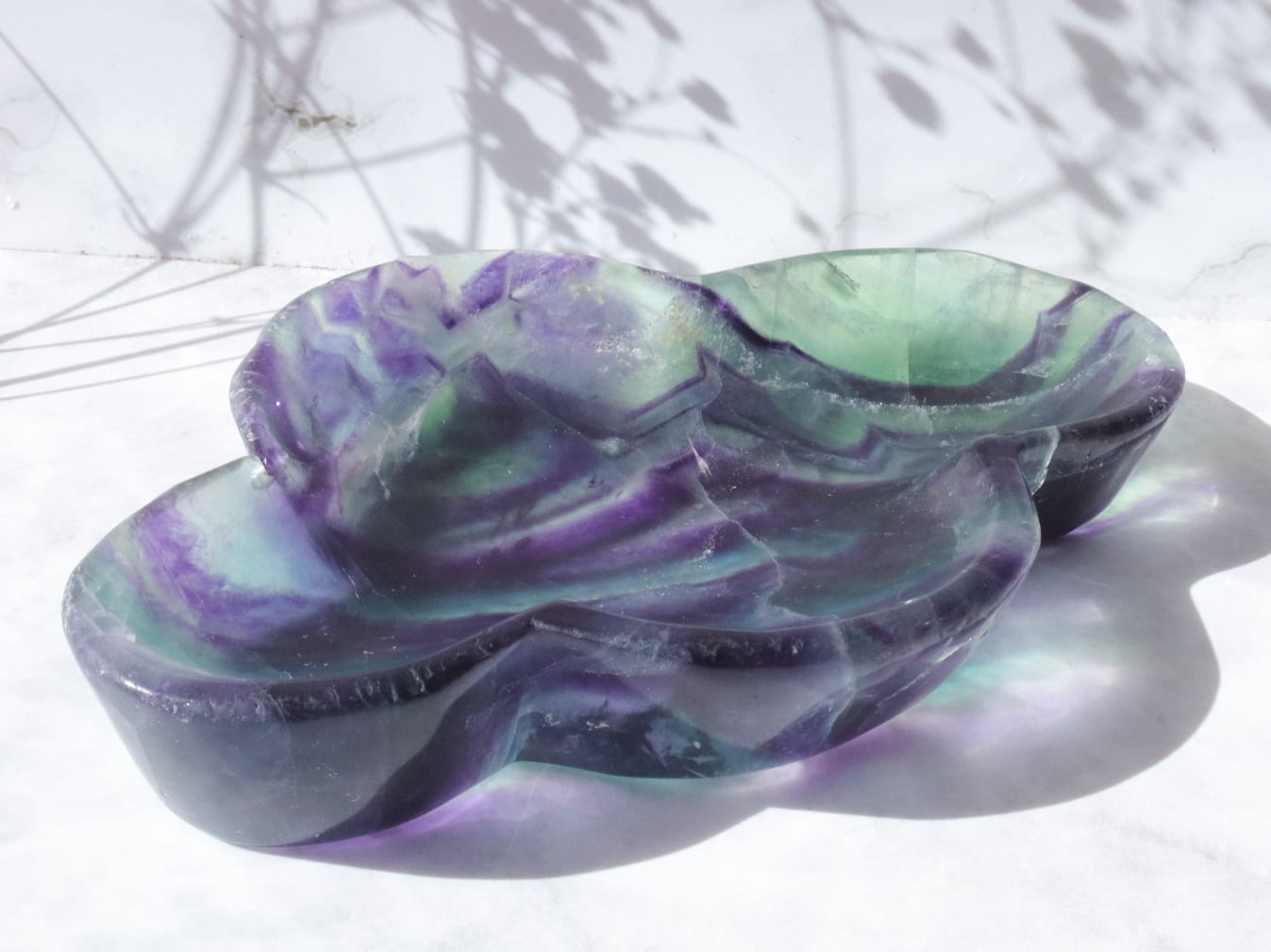 ブルー、グリーン、パープルの芸術的なストライプ柄が美しいフローライトのボウルをご紹介します♡♡♡そこまで深い器ではないですが、動画にもあるように、面積が大きいので、タンブルが10個以上は乗りますから、かなり幅広い用途にお使い頂けると思います♡✨