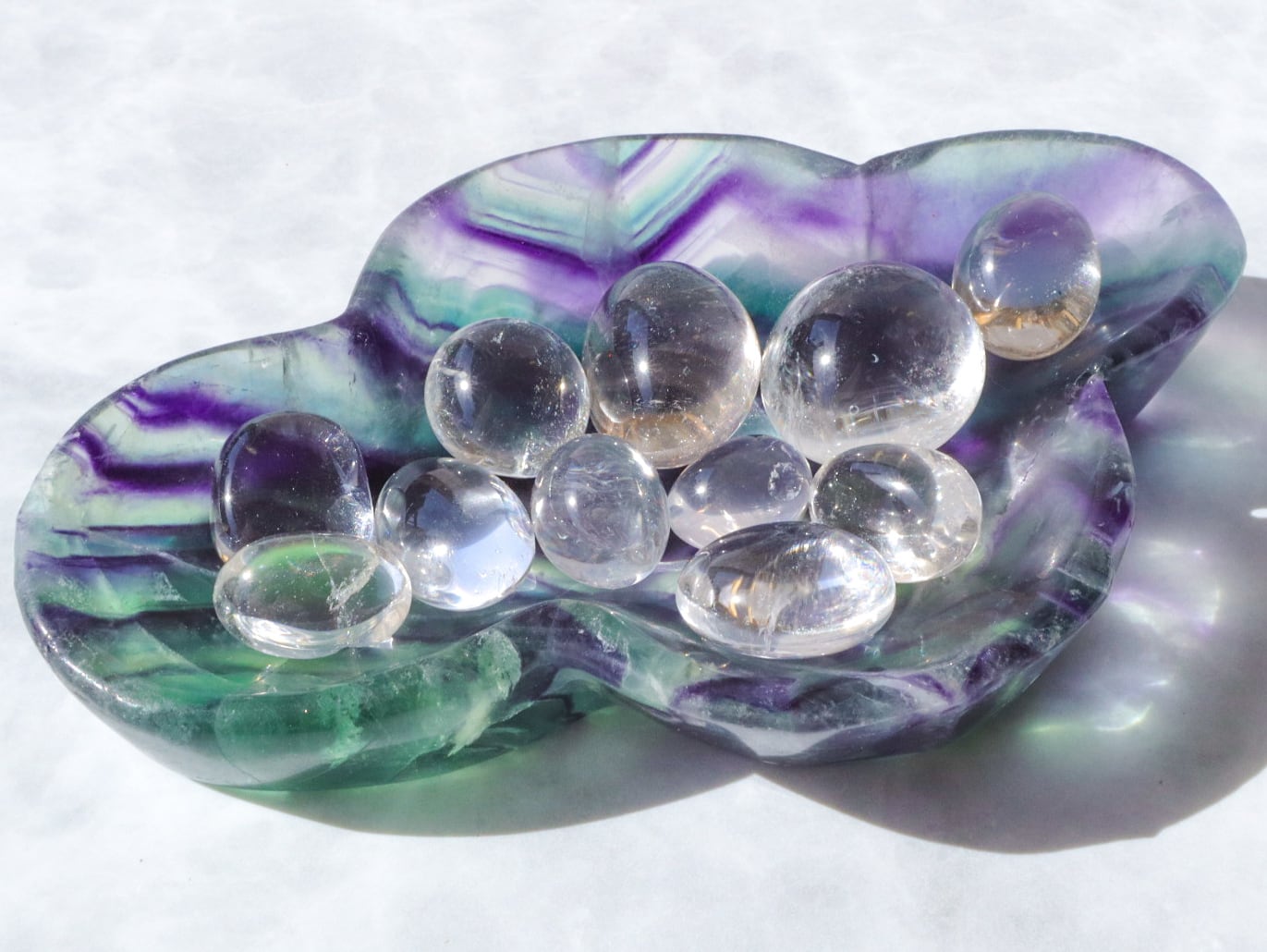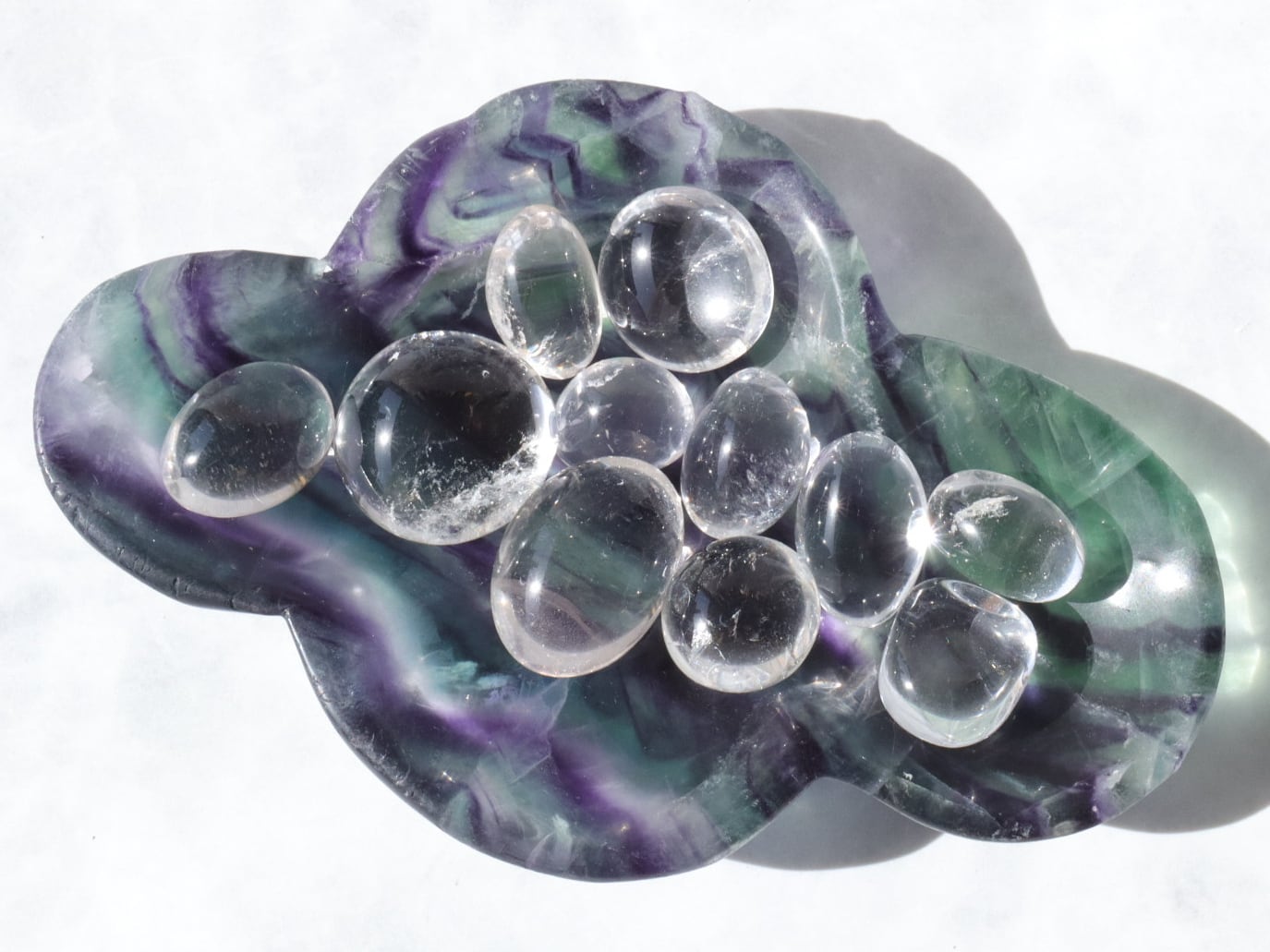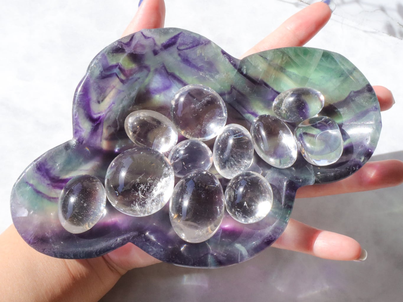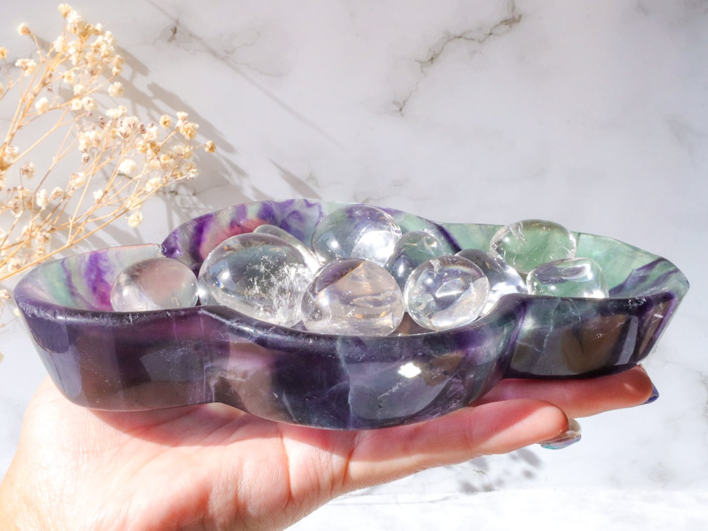 ブルー、グリーン、パープルの芸術的なストライプ柄が美しいフローライトのボウルをご紹介します♡♡♡そこまで深い器ではないですが、動画にもあるように、面積が大きいので、タンブルが10個以上は乗りますから、かなり幅広い用途にお使い頂けると思います♡✨