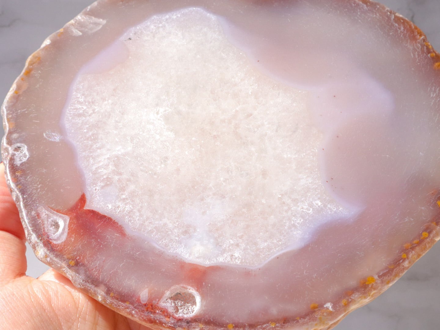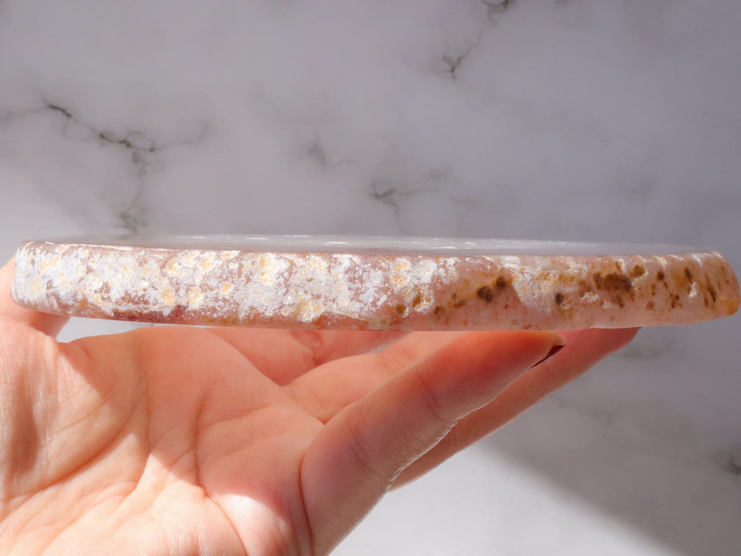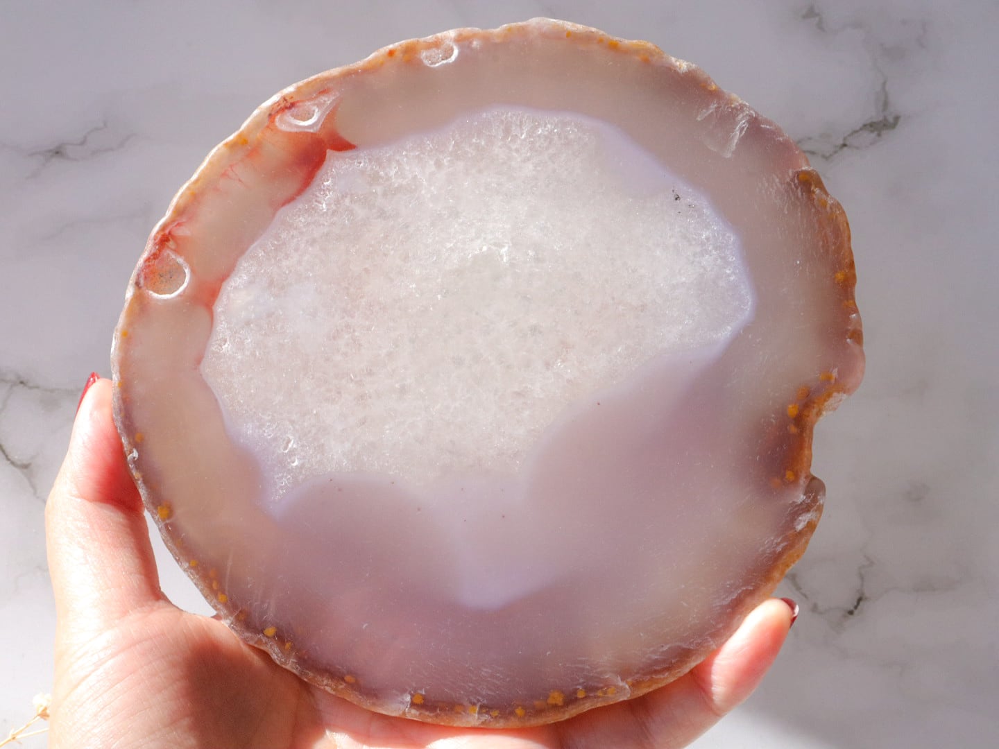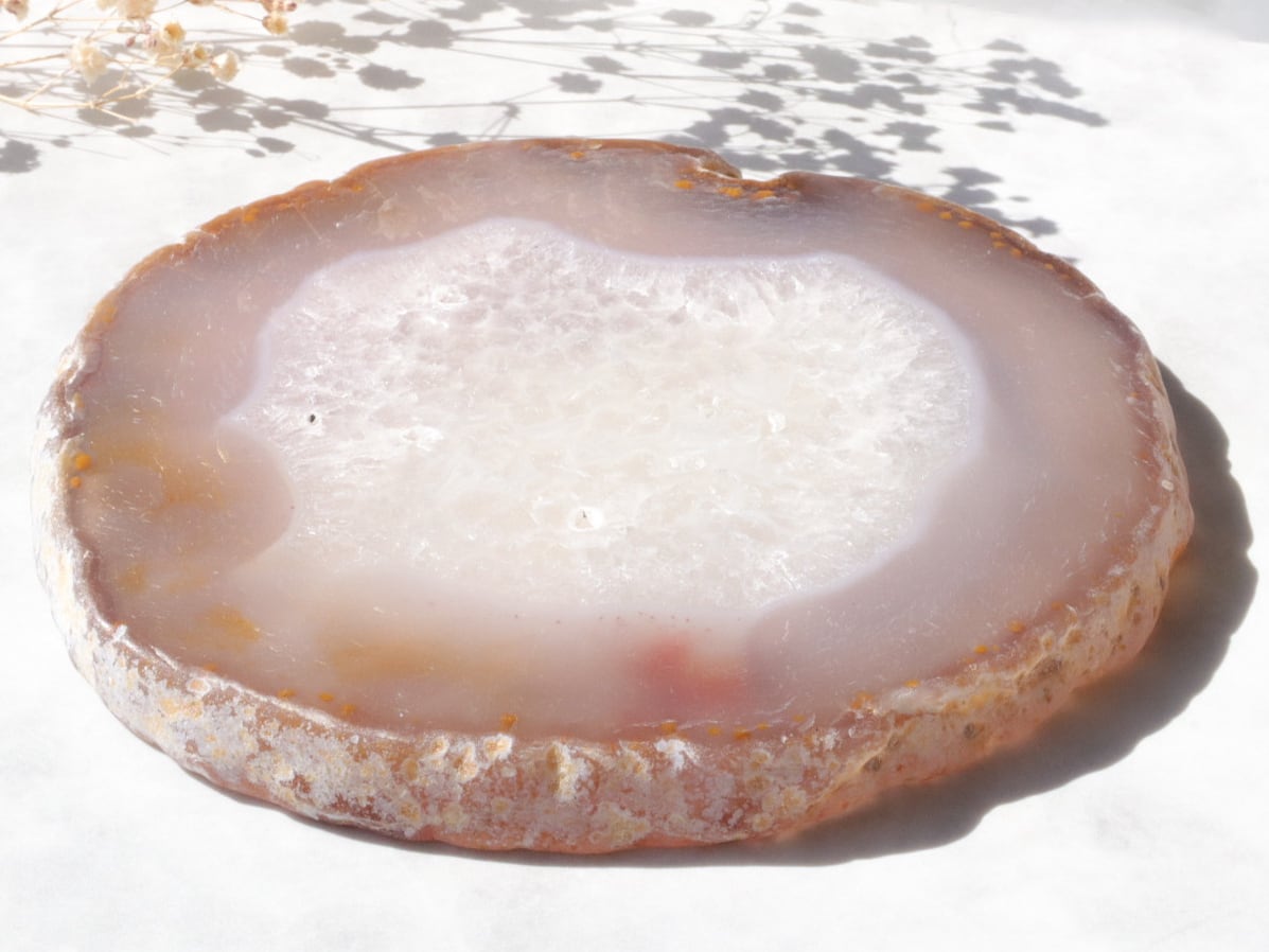 真ん中が白くてザクザクの瑪瑙プレートのご紹介です✨パープルやグレー、ブラウンともつかない落ち着いたお色は、上に乗せるものの邪魔をしないシンプルかつおしゃれなプレートだと思います♡♡♡場所によって、黄色や、オレンジのような箇所もあり、ナチュラル感満載です✨プレートの縁もなんだか切り株のようで可愛いです♡重さと大きさのわりにはお安いと思います✨✨